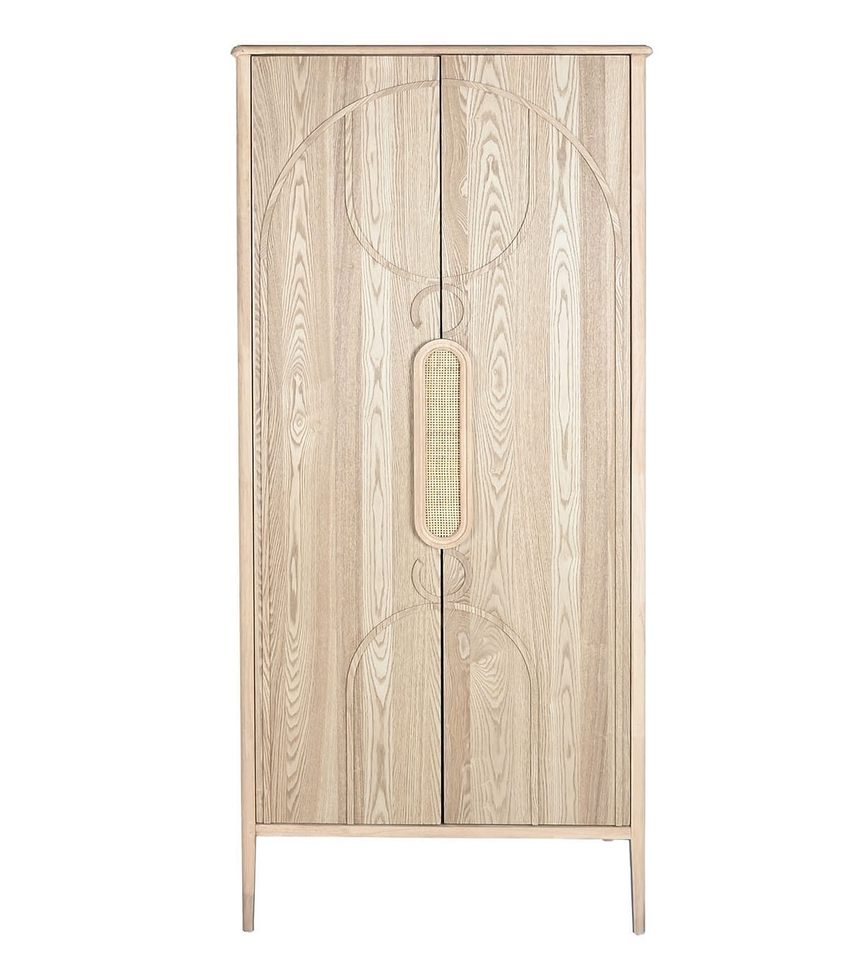 Este armario ropero de inspiración oriental chic combina elegancia y funcionalidad con su estructura de madera de abeto y detalles en ratán natural. Su diseño atemporal, con puertas ornamentadas y delicados acabados, lo convierte en una pieza exclusiva para cualquier dormitorio o vestidor.