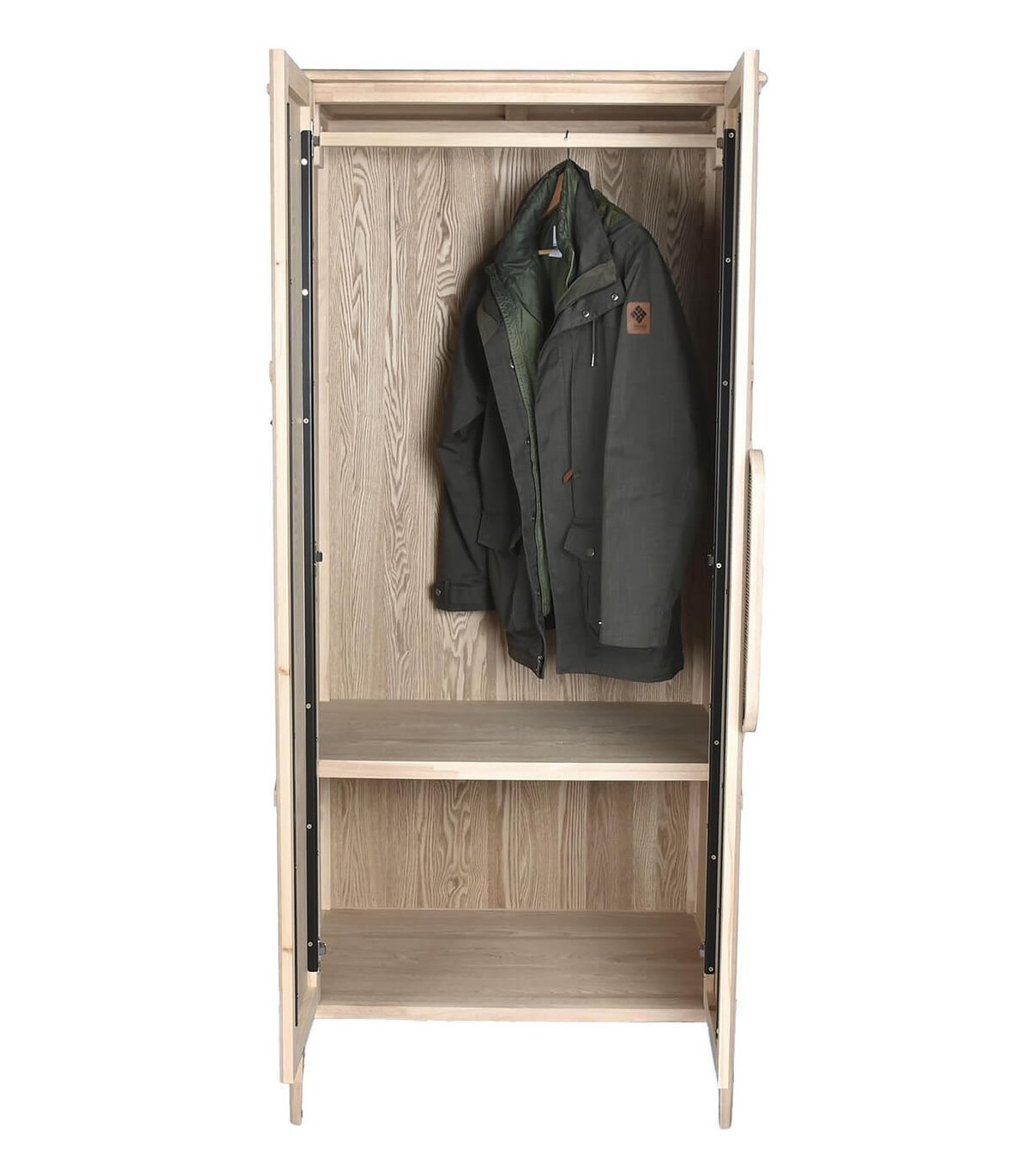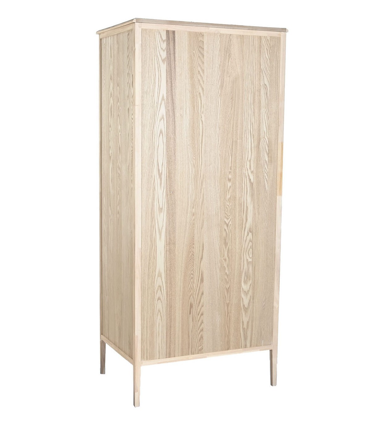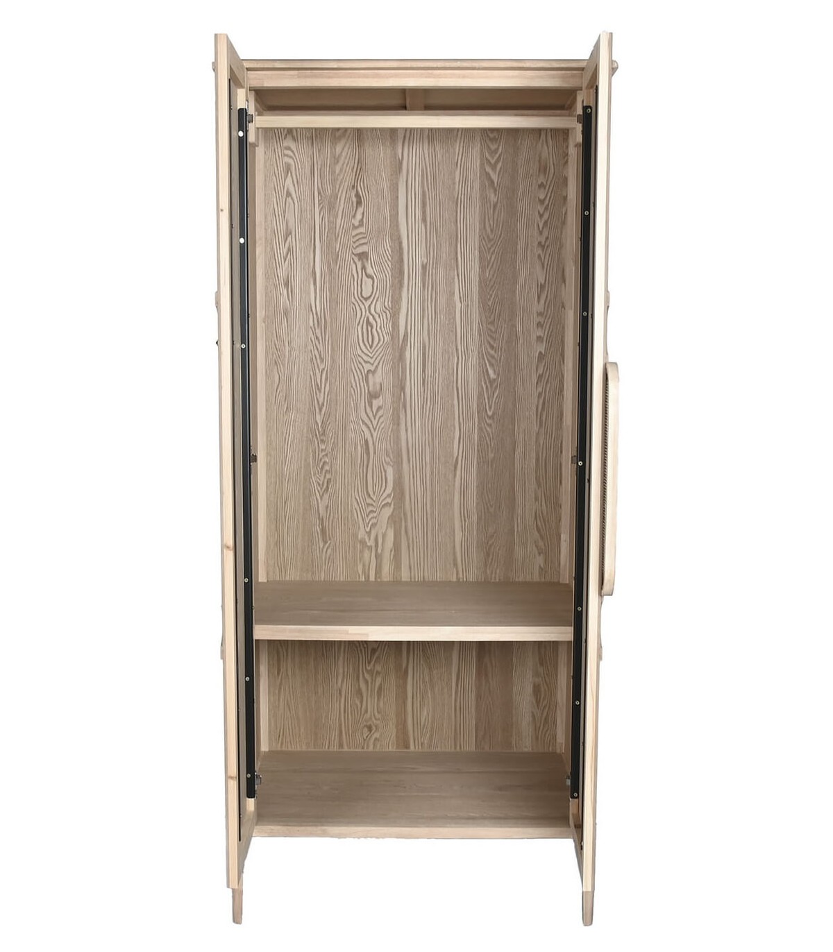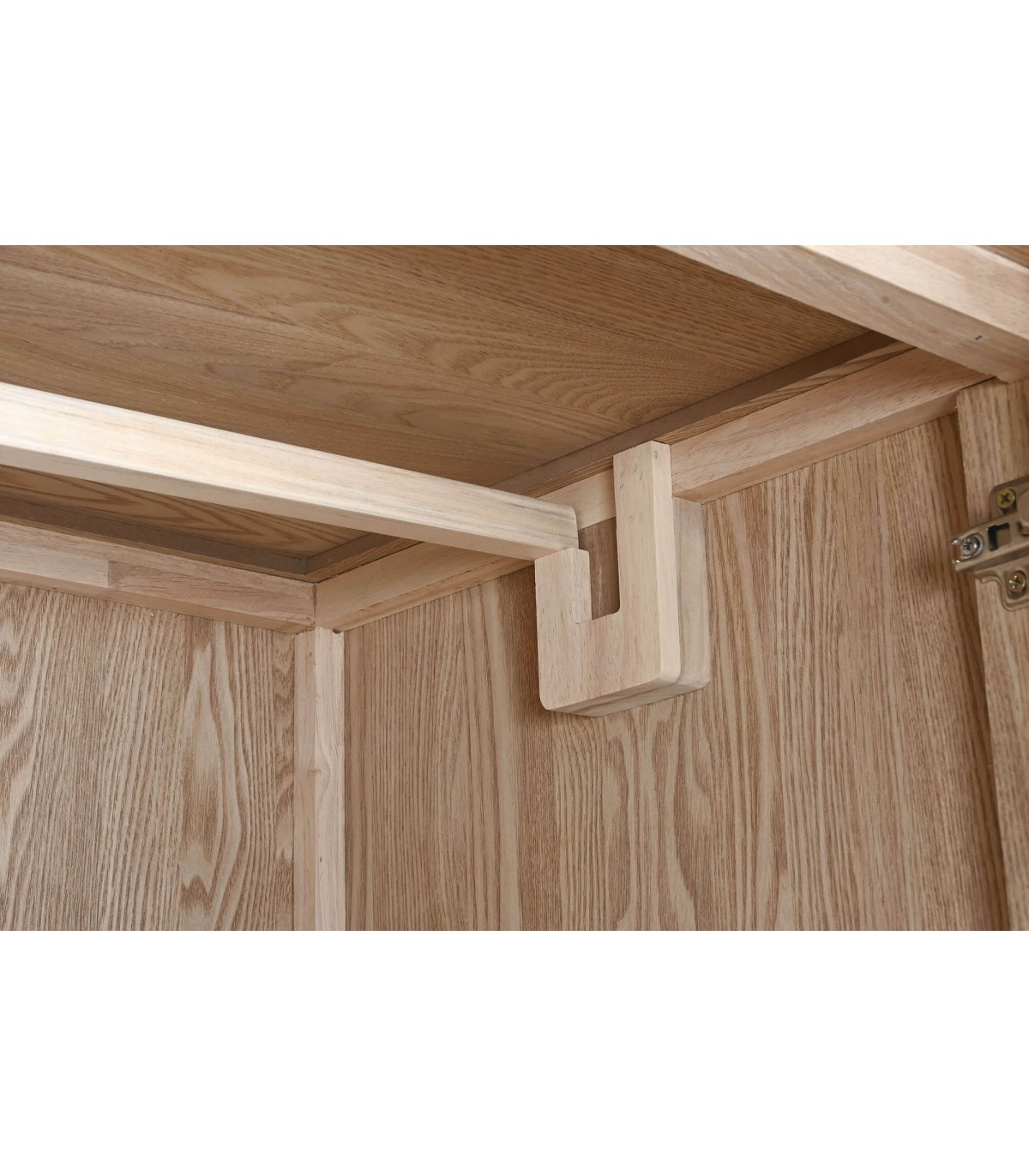 Cuenta con una barra para colgar ropa y un estante interior, ofreciendo un almacenamiento práctico y organizado. Su acabado natural realza la calidez y autenticidad de los materiales, aportando un aire sereno y sofisticado al espacio.