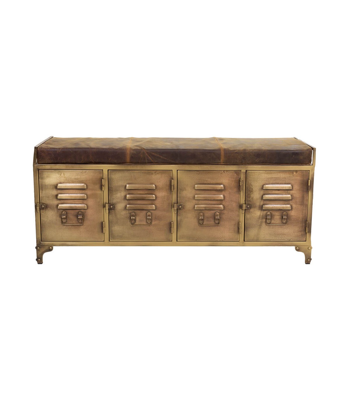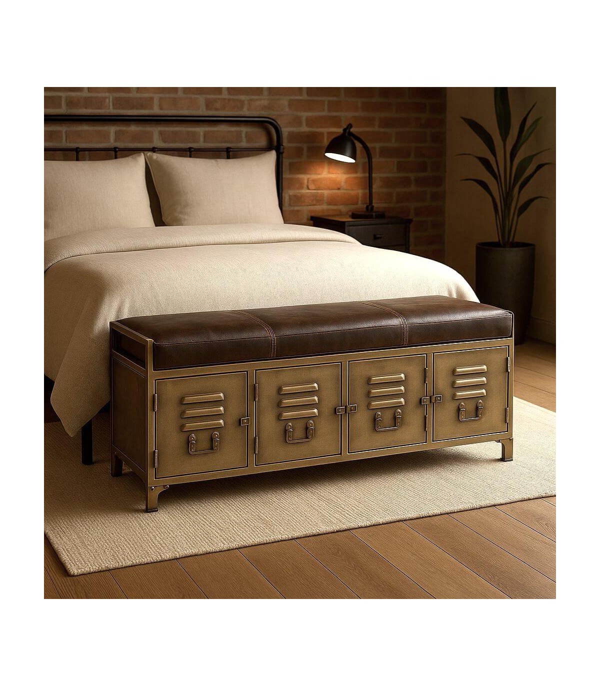 Este banco pie de cama conjuga robustez, diseño y funcionalidad con un aire marcadamente industrial. La estructura metálica en oro viejo presenta un acabado envejecido que aporta textura y carácter visual. El asiento, acolchado y tapizado en piel marrón, añade calidez y confort al conjunto.