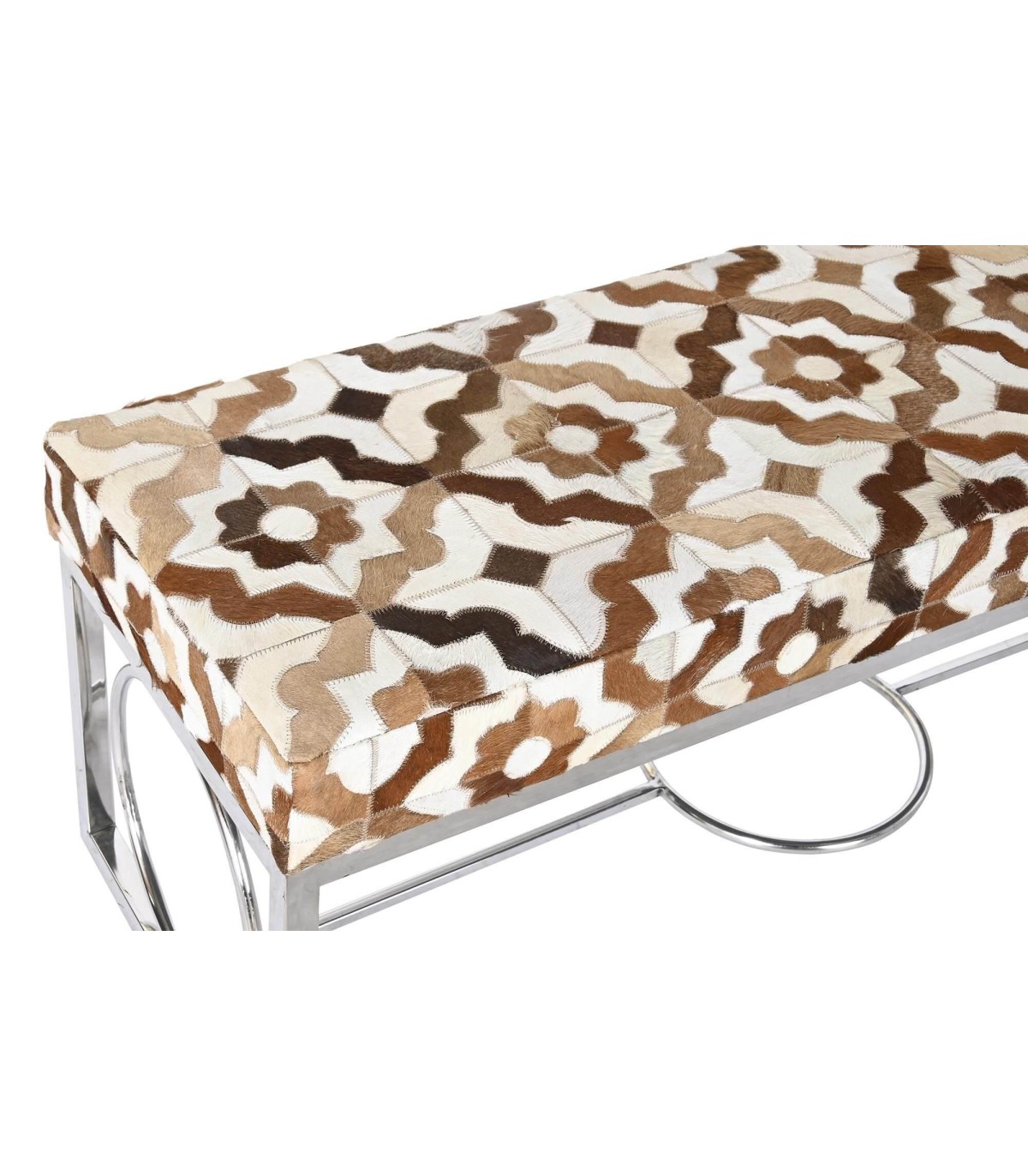 Banco pie de cama de nuestra colección Esciros de estilo contemporánea, una colección que nos ofrece varios muebles tapizados perfectos para complementar cualquier decoración, en dos acabados de piel ralizada en patchwork real, puedes elegir entre la elegancia del blanco y negro o la caldéz que aporta el marrón.