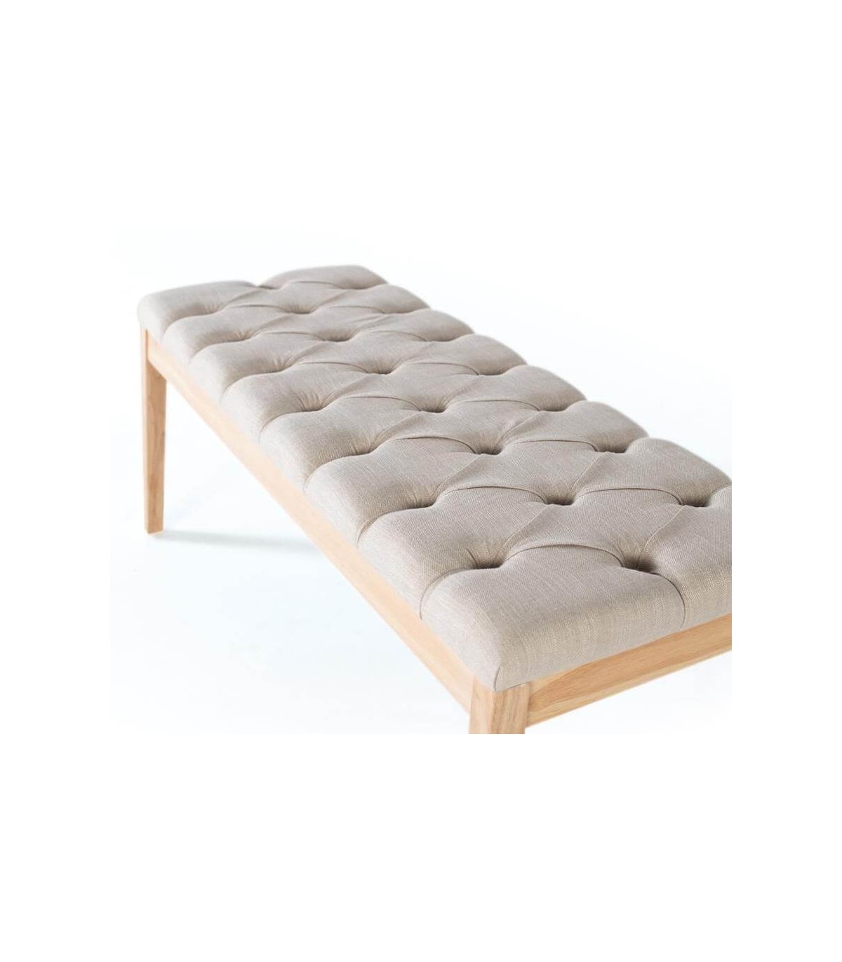 Banco pie de cama realizado en madera maciza natural, tela algodón color beige acabado capitoné. Un banco pie de cama perfecto para darle una nota de elegancia tu habitación.