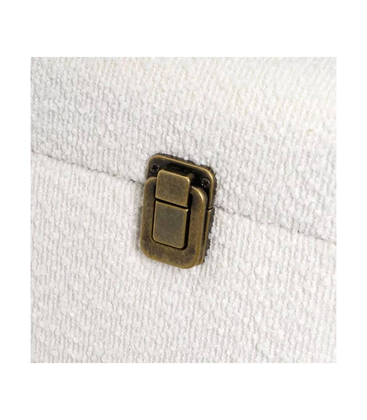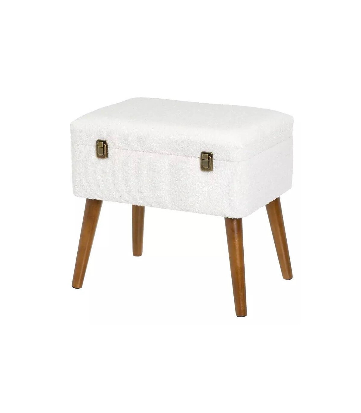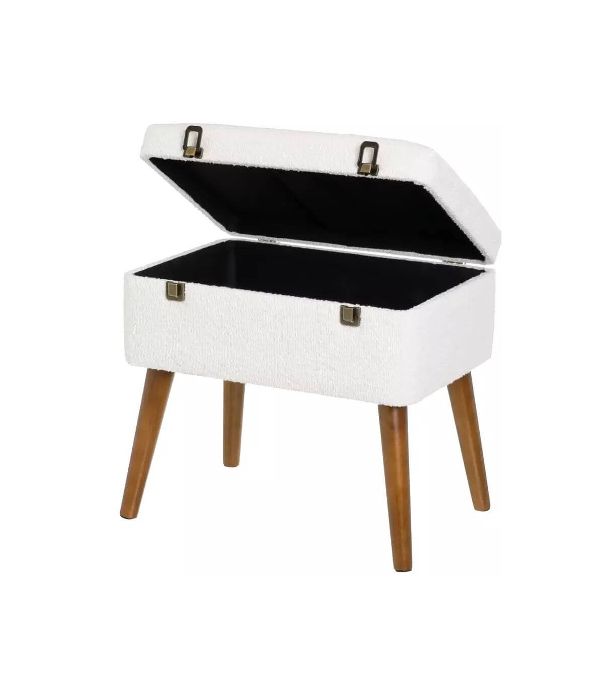 Banqueta de estilo contemporáneo, tapizado en boucle blanco con las patas en color cerezo, muy versátil una pieza que incluye un espacio bajo el asiento para guardar objetos, ideal para pie de cama o como puf en una zona de star, existe en varios colores.