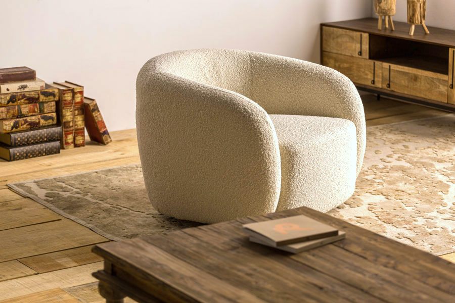 El bouclé se caracteriza por una superficie irregular hecha a base de hilos con nudos. Los muebles tapizados en bouclé proporcionan calidez y comodidad en cualquier lugar donde se ubiquen. Además, son muy versátiles ya que puede mezclarse muy bien con materiales como la madera natural u otros tejidos de colores.