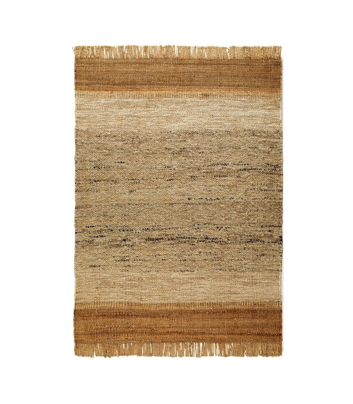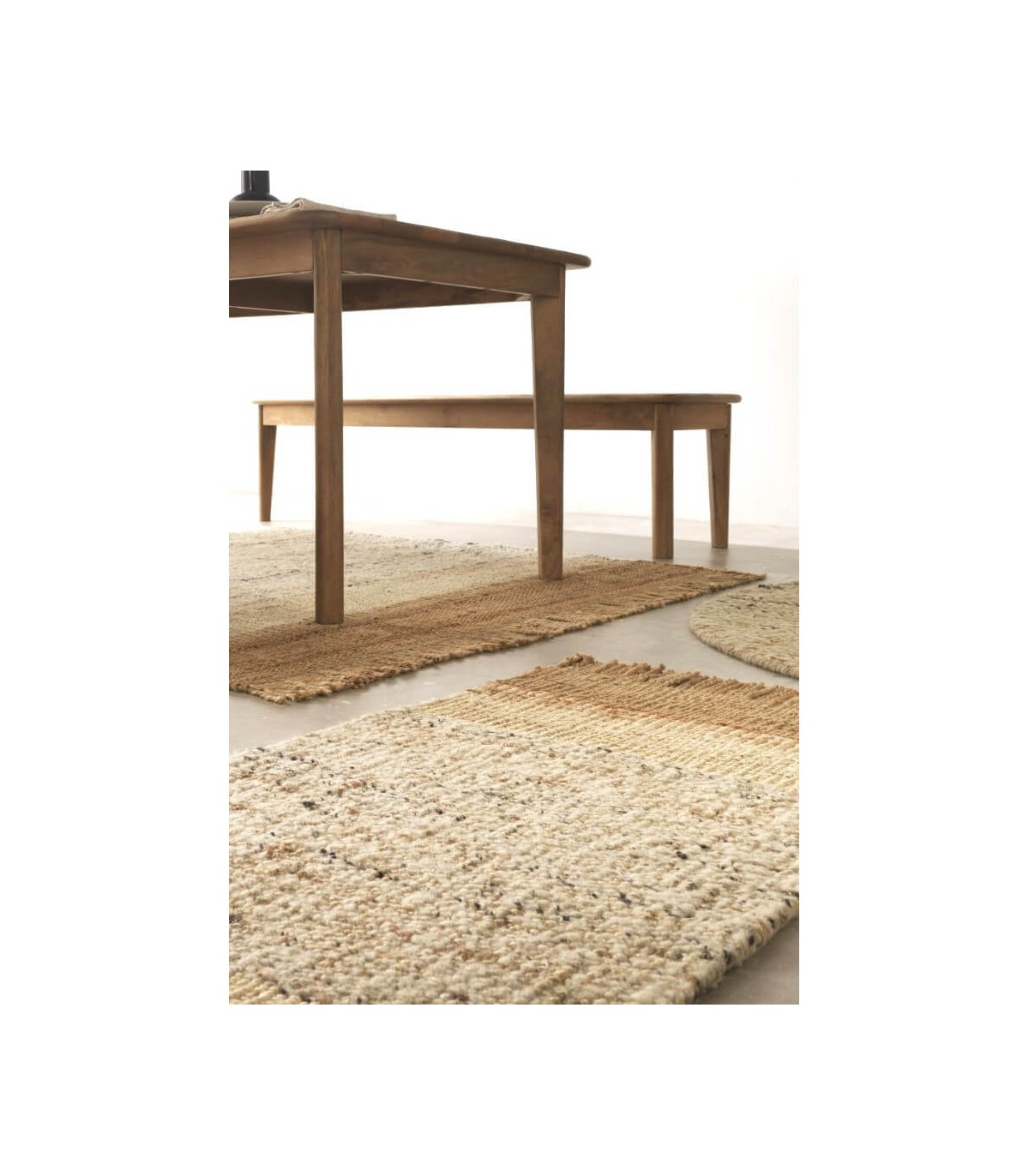 Alfombra hecha de modo artesanal en yute y lana ocres y crudos, rematada con flecos, una alfombra perfecta para la zona de comedor o zona de sofás.