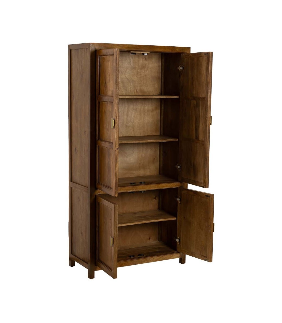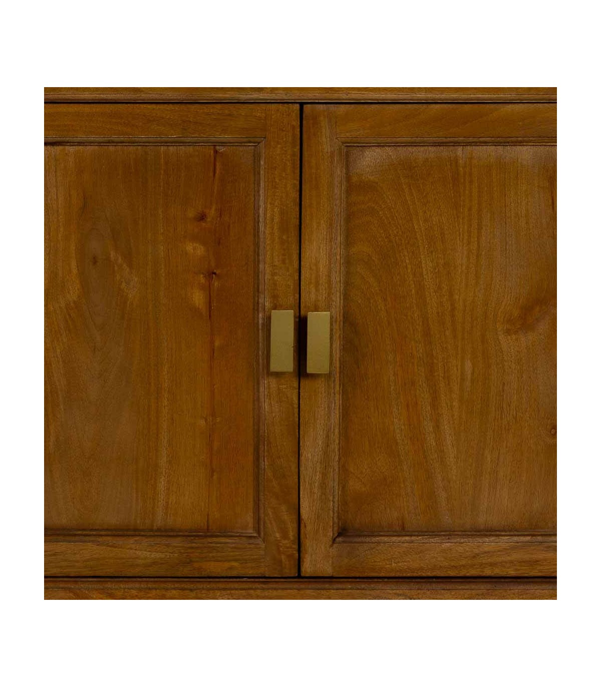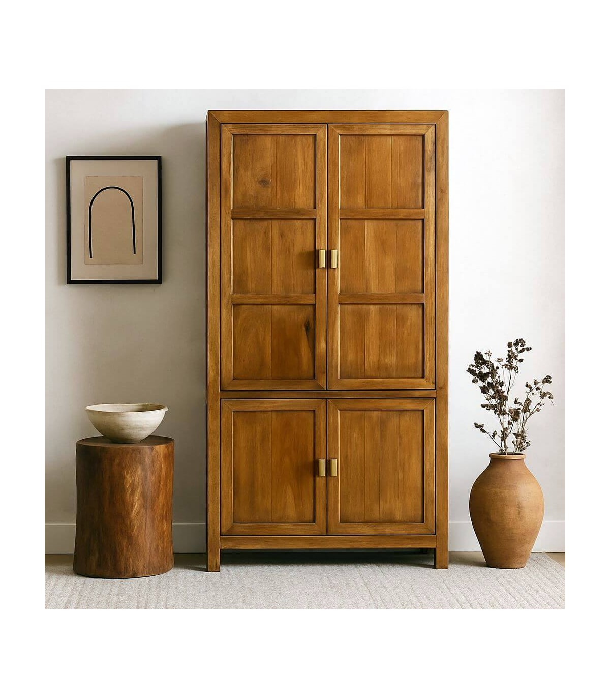 Este armario alacena de líneas sencillas destaca por su acabado artesanal en madera de pino color miel, que aporta calidez y un aire relajado. Sus cuatro puertas con tiradores dorados crean un contraste elegante que realza el diseño.