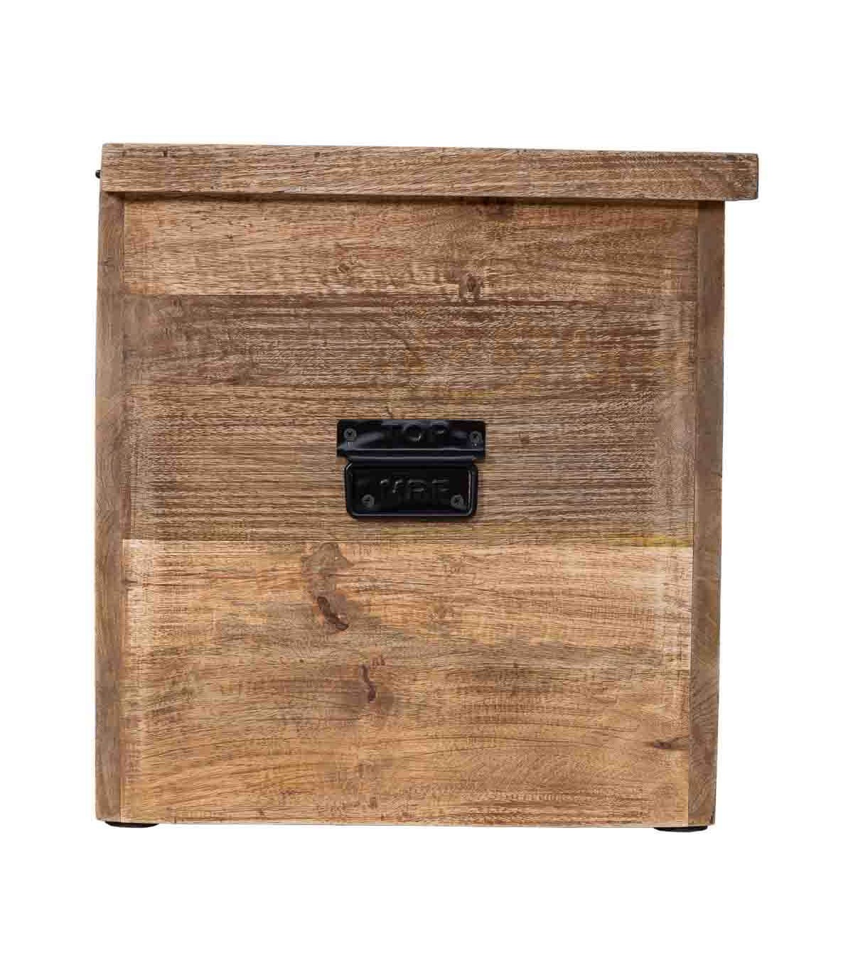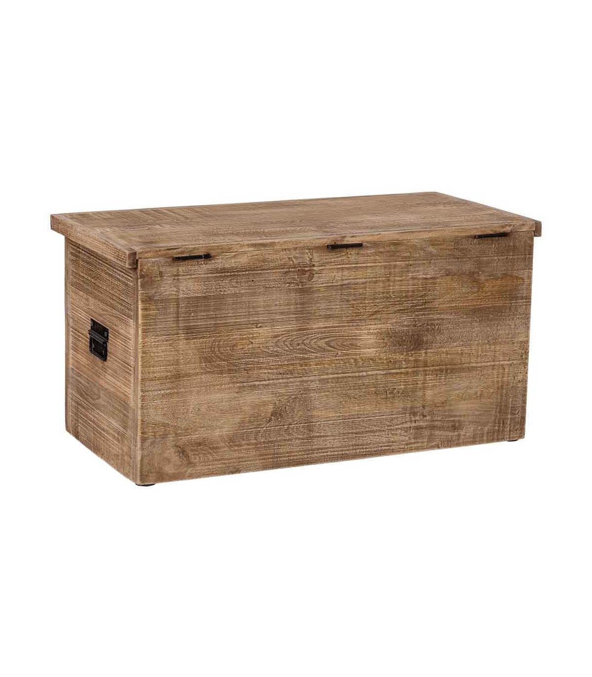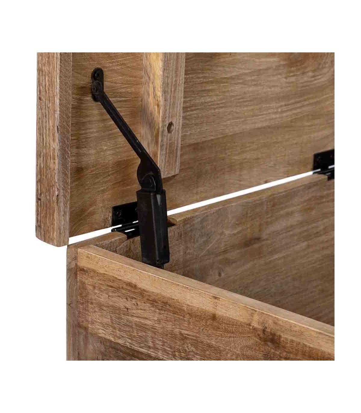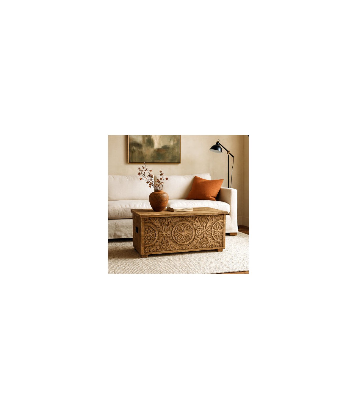 El tono natural de la madera resalta la belleza de los relieves y permite integrarlo fácilmente en estancias boho, étnicas o con alma rústica. Ideal para almacenaje en dormitorios o salones, también funciona como banco auxiliar. Las asas de metal negro completan el diseño con un toque sutil y práctico.