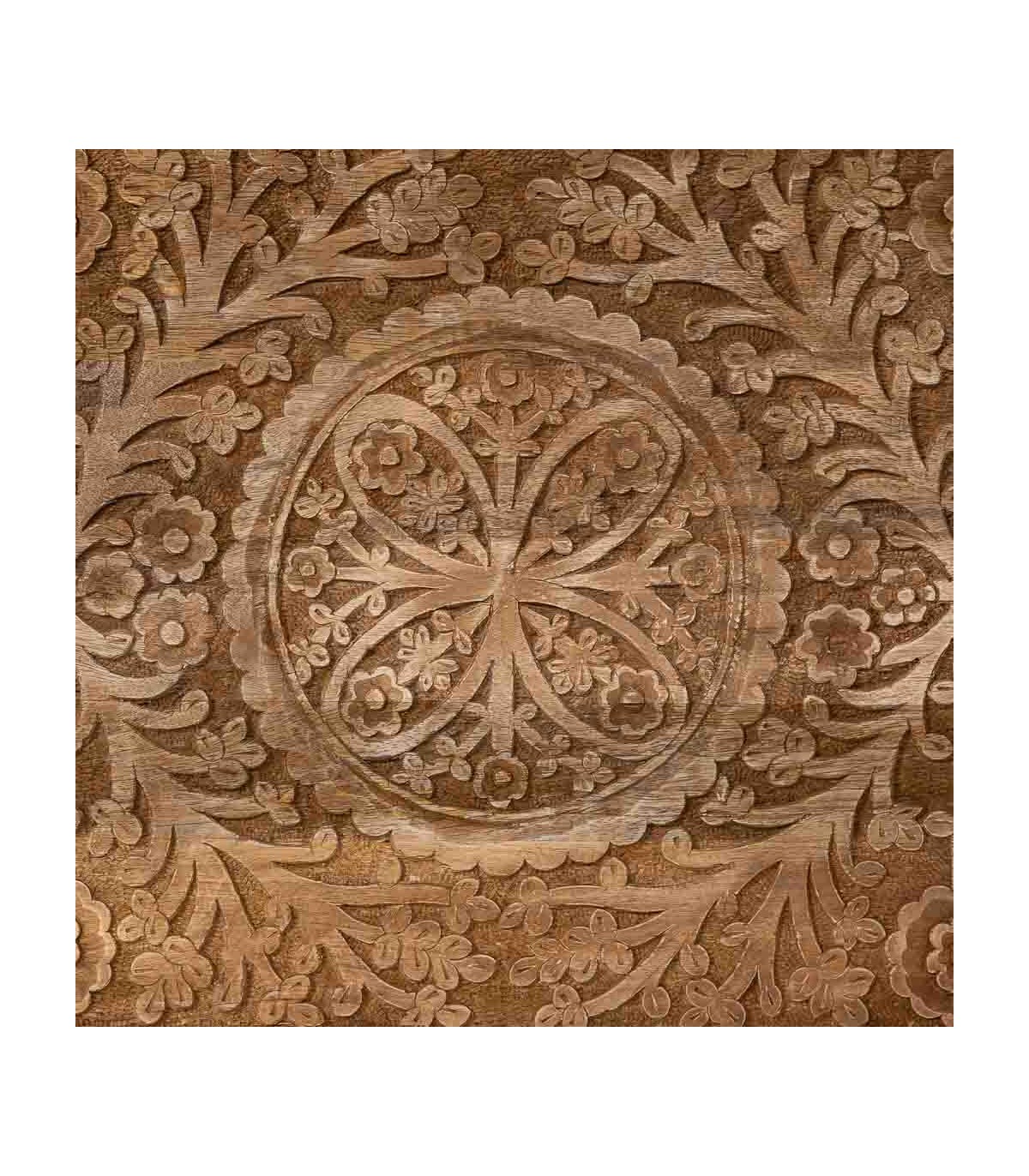Este baúl de madera maciza combina funcionalidad y una impresionante riqueza decorativa en su frontal. La talla profunda, de inspiración vegetal y geométrica, se realiza de forma artesanal, aportando textura, carácter y un acabado único a cada pieza.
