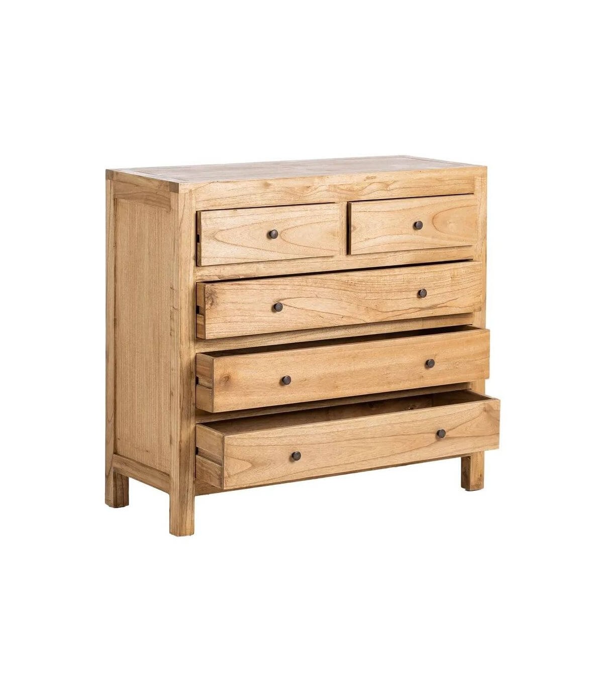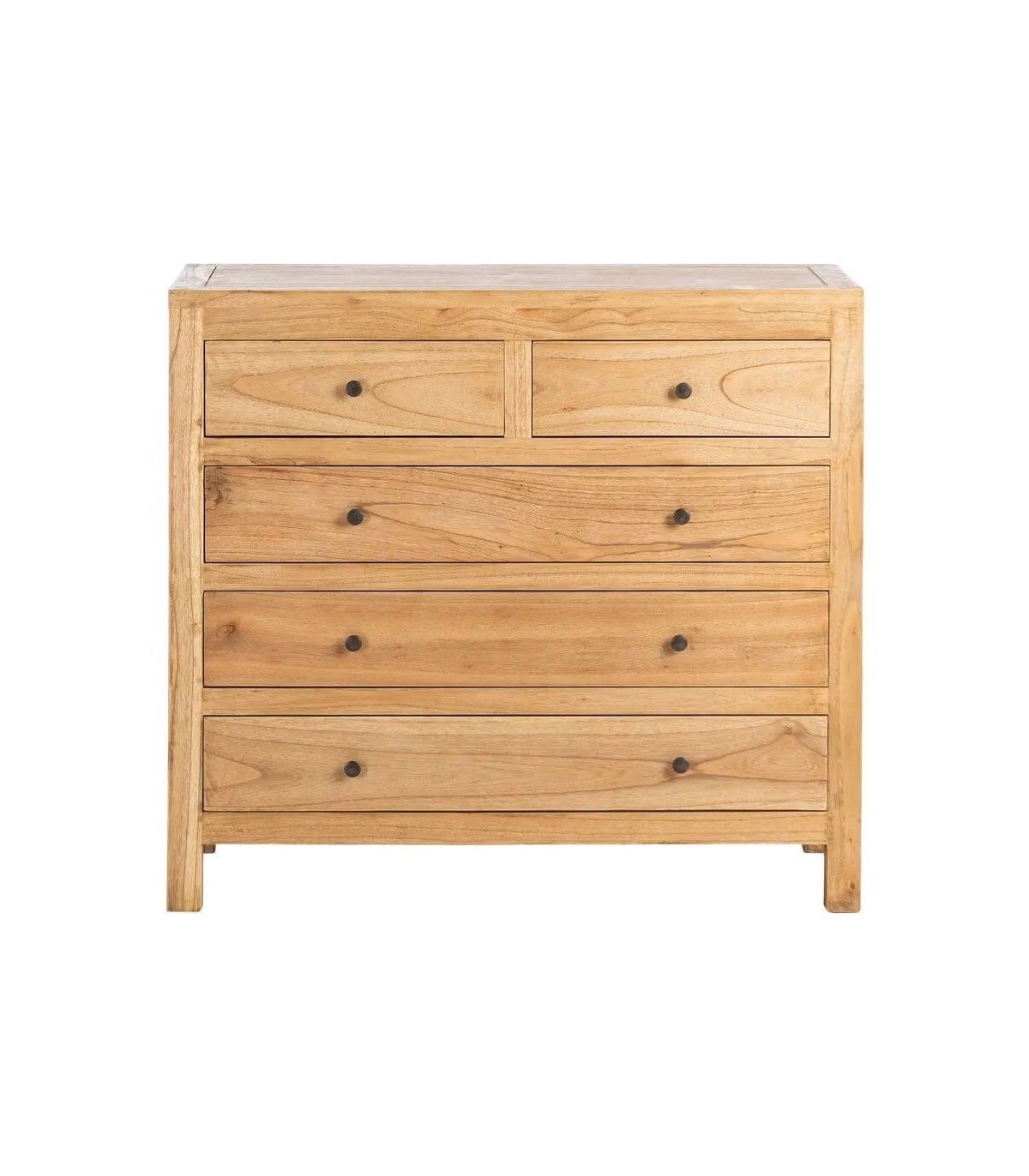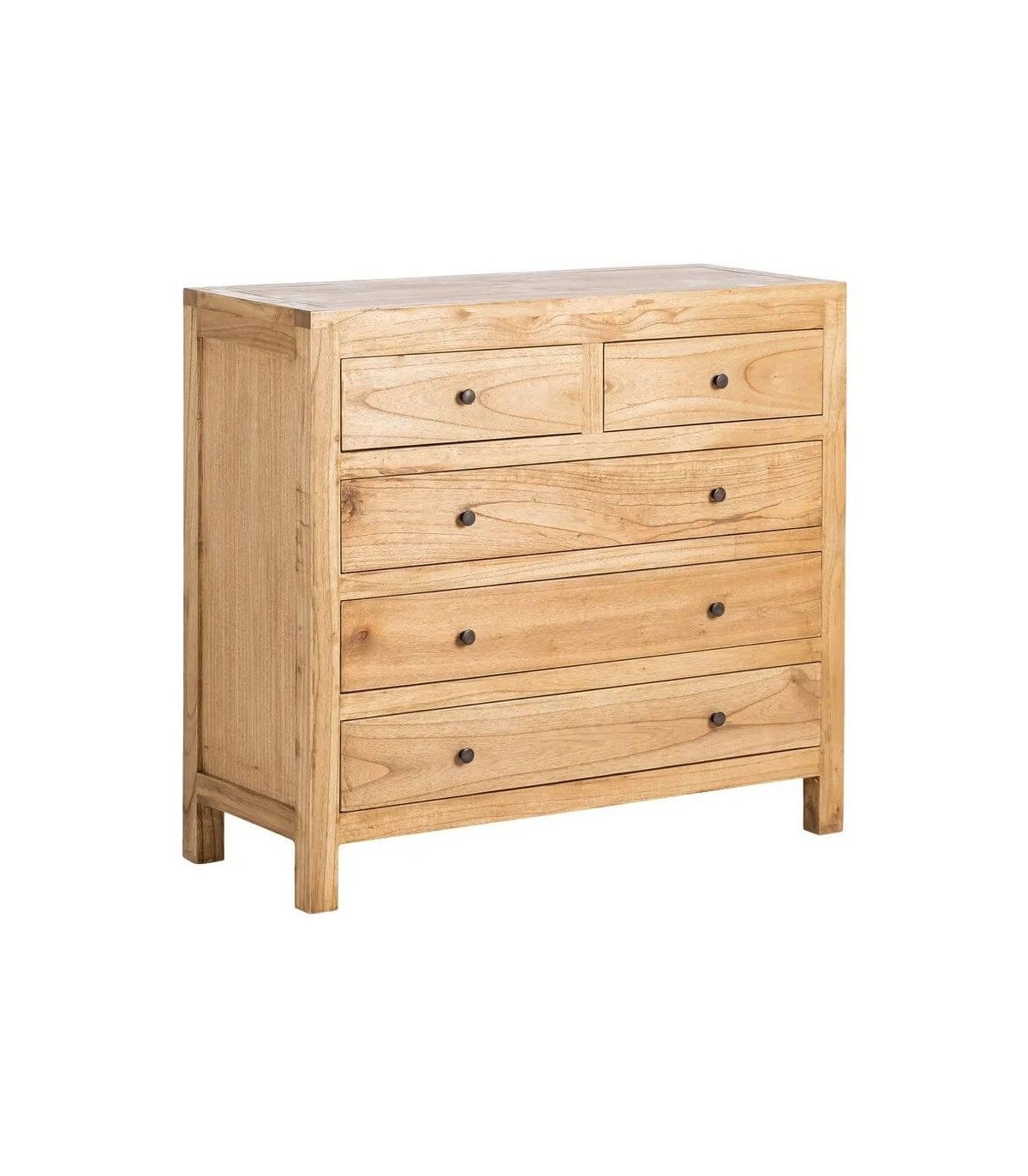 Su diseño de líneas sencillas y proporciones sólidas refuerza una imagen atemporal y funcional. Los cinco cajones ofrecen una capacidad de almacenaje generosa manteniendo el conjunto visualmente limpio. Los tiradores metálicos en tono bronce aportan un contraste sutil y elegante. Una pieza pensada para interiores que buscan naturalidad, coherencia estética y uso diario.