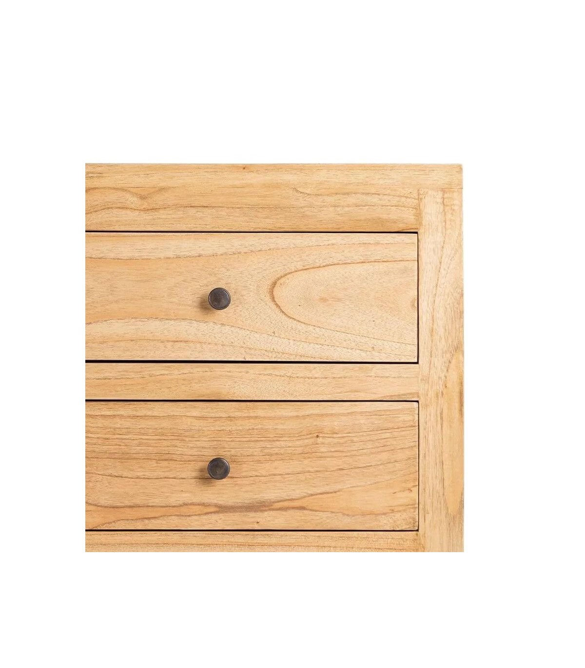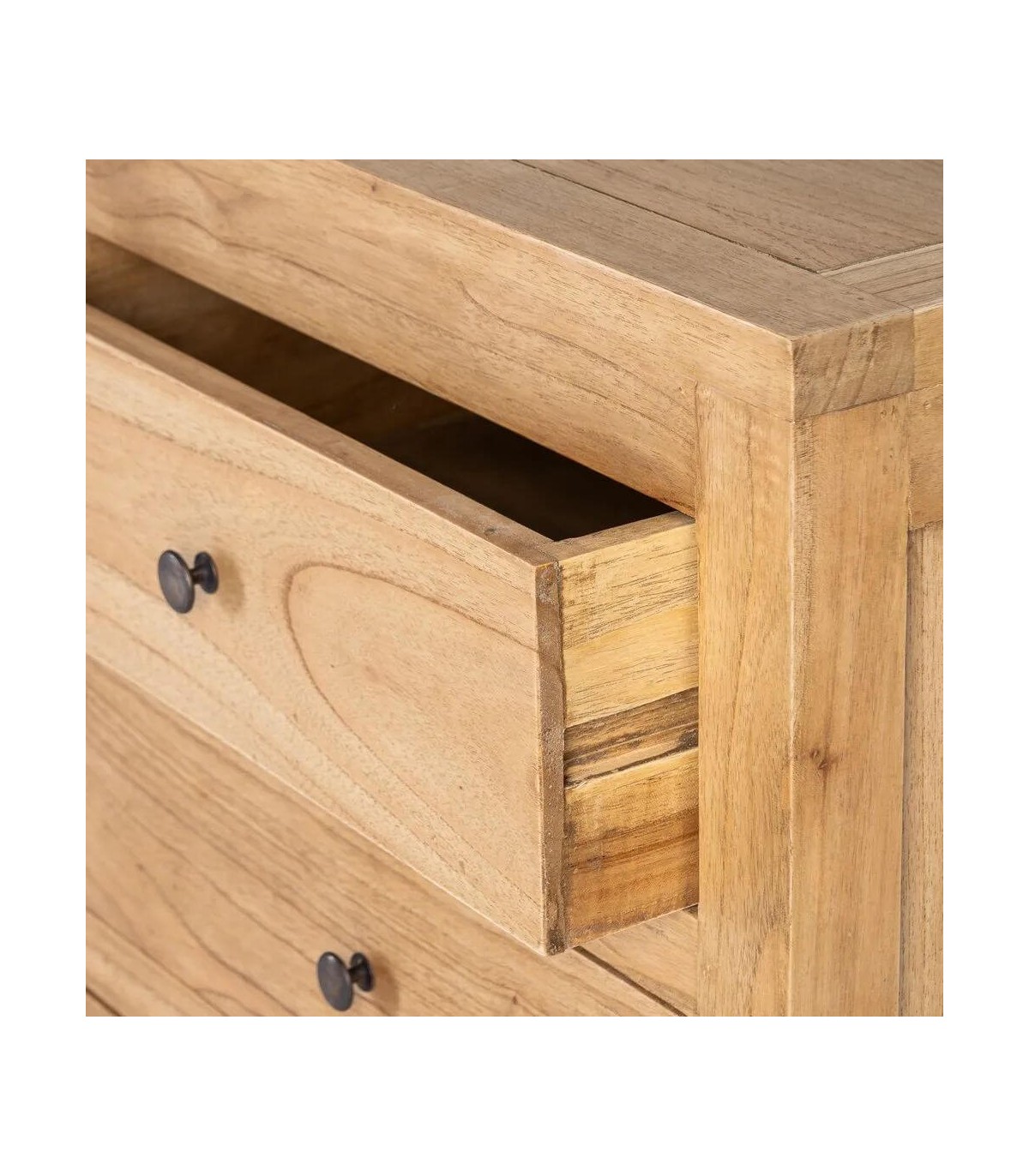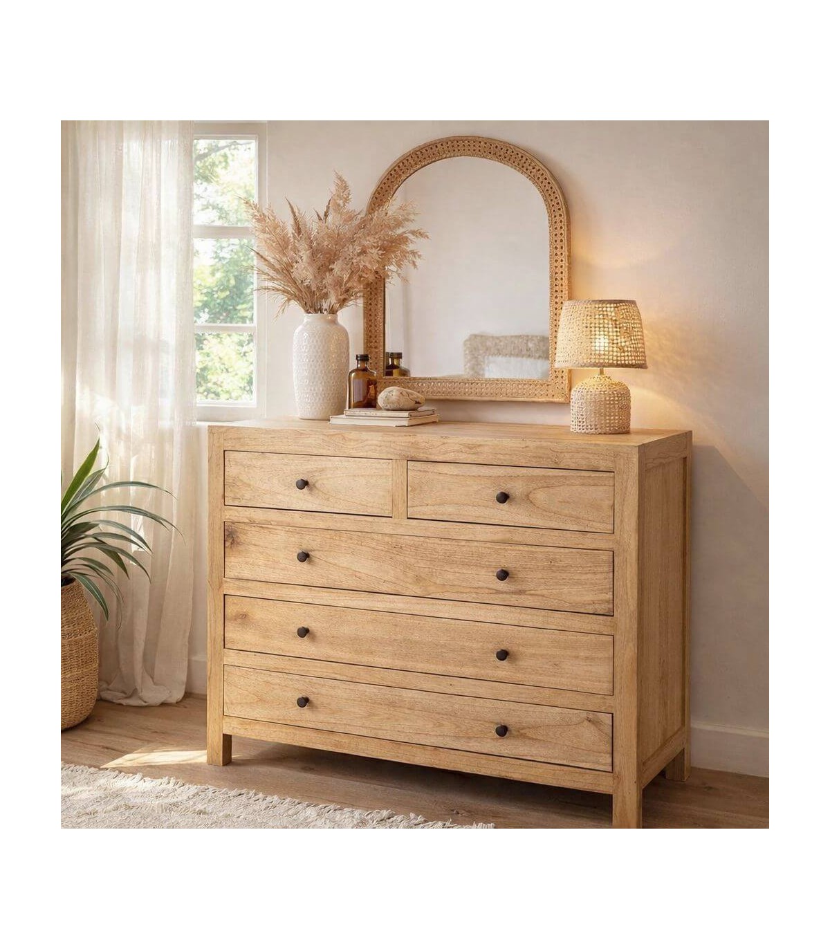 Cómoda de estilo boho concebida para aportar orden y calidez al espacio con una estética natural y equilibrada. La madera de mindi en acabado natural claro transmite luminosidad y una sensación acogedora muy fácil de integrar.