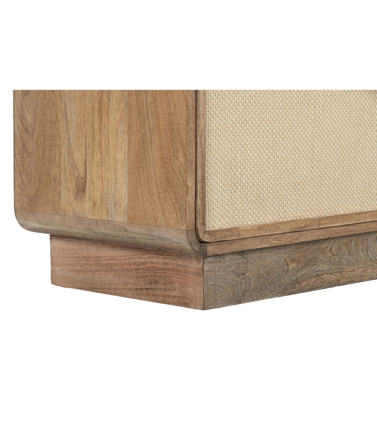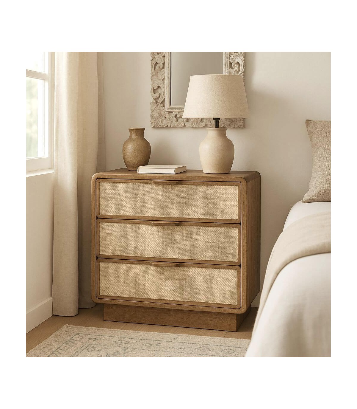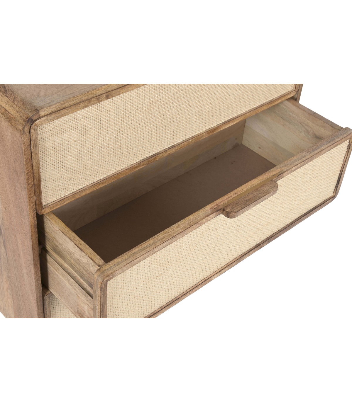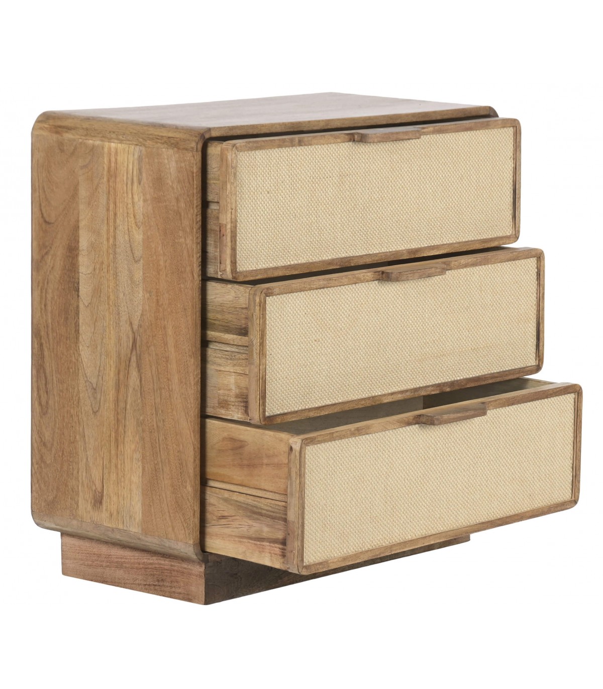 Los tres cajones aportan orden y ligereza visual con su frente trenzado en fibra vegetal. Fabricada artesanalmente, cada pieza es única, con pequeñas variaciones que realzan su autenticidad. Ideal para quienes buscan muebles sostenibles con alma cálida y estética natural.