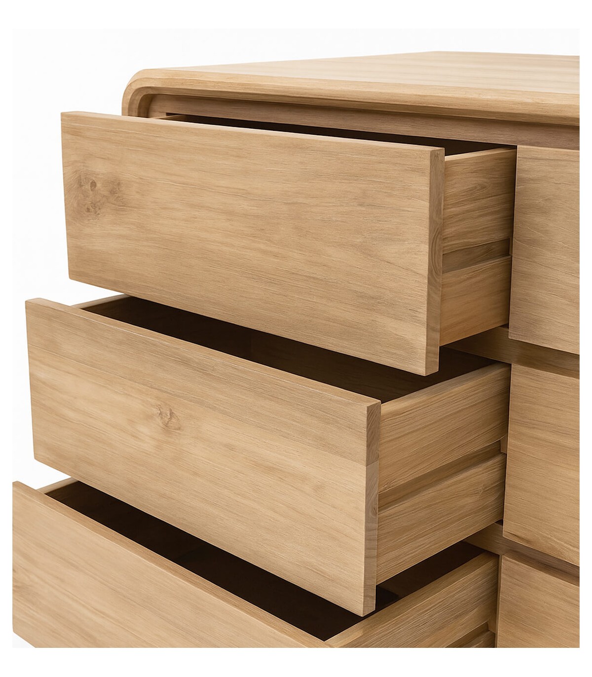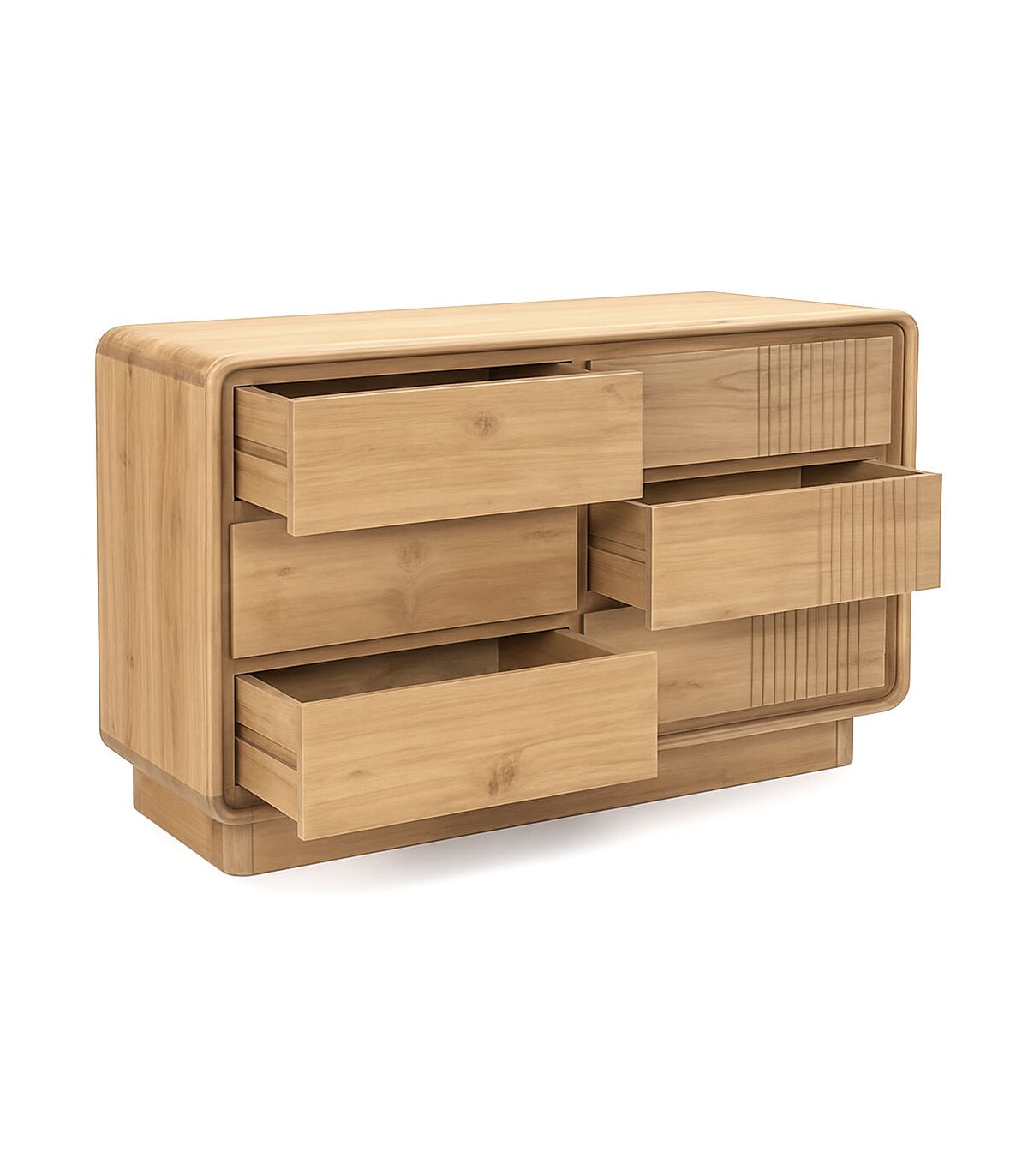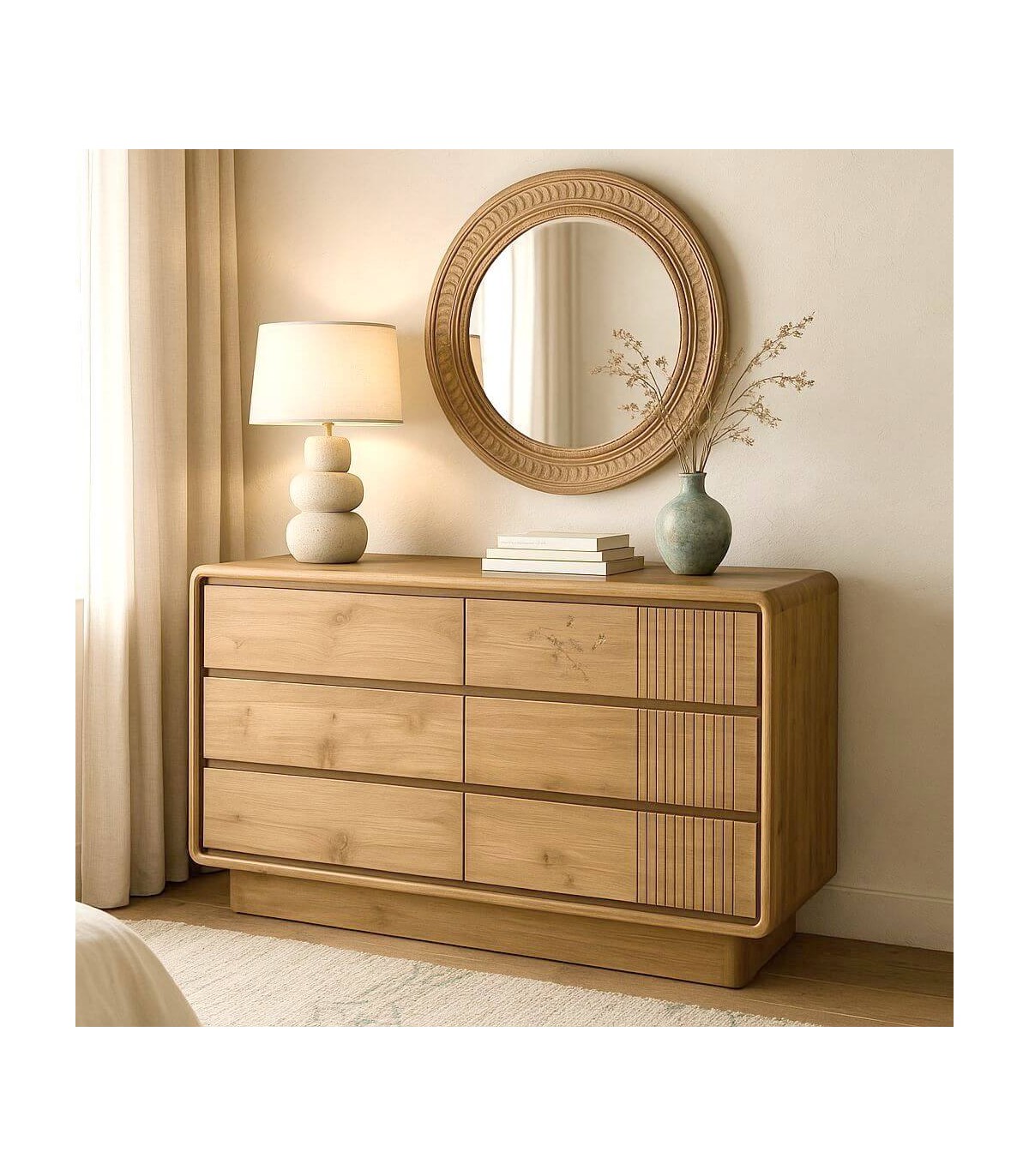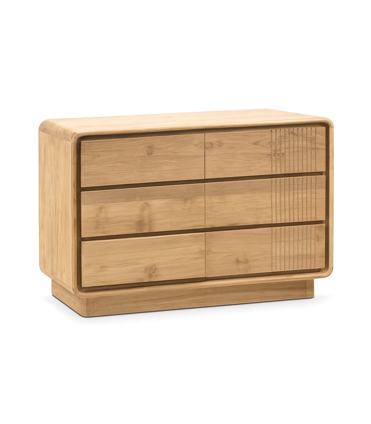 Esta cómoda XL de líneas puras refleja un diseño atemporal donde la calidez de la teca se une a un trabajo artesanal excepcional. Sus seis cajones amplios ofrecen un espacio de almacenamiento generoso, manteniendo una estética equilibrada y serena. Los bordes redondeados suavizan la estructura y refuerzan la sensación de calma natural. Cada pieza muestra vetas únicas que aportan carácter, autenticidad y armonía a cualquier dormitorio o estancia.