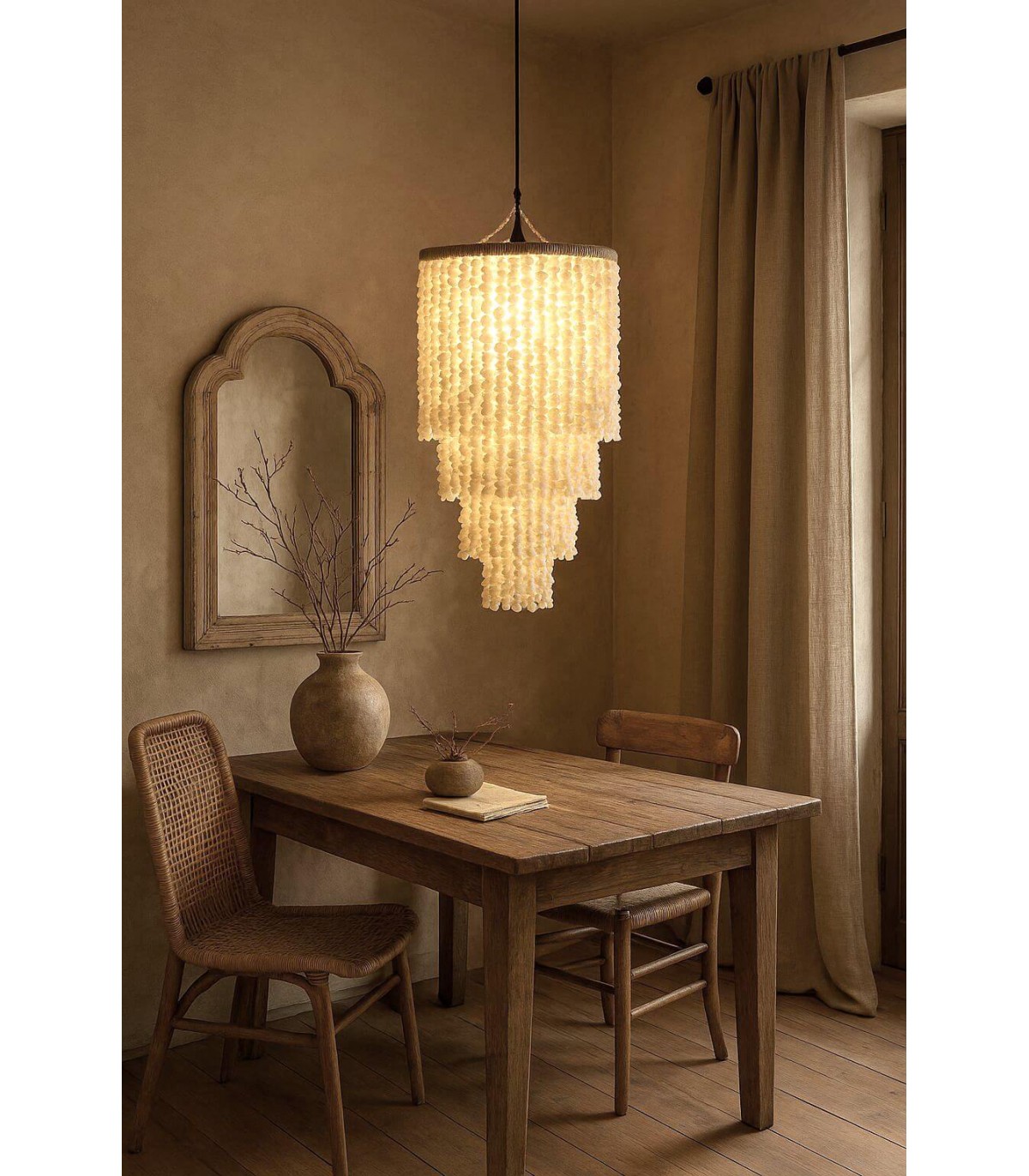 Las capas de conchas generan movimiento visual y textura, ideales para salones, dormitorios o zonas de descanso. Cada pieza está hecha a mano, lo que asegura un acabado único y lleno de carácter. Su tono neutro combina con decoraciones boho, mediterráneas o naturales con gran facilidad. Iluminación con alma artesanal y estética equilibrada para espacios serenos.