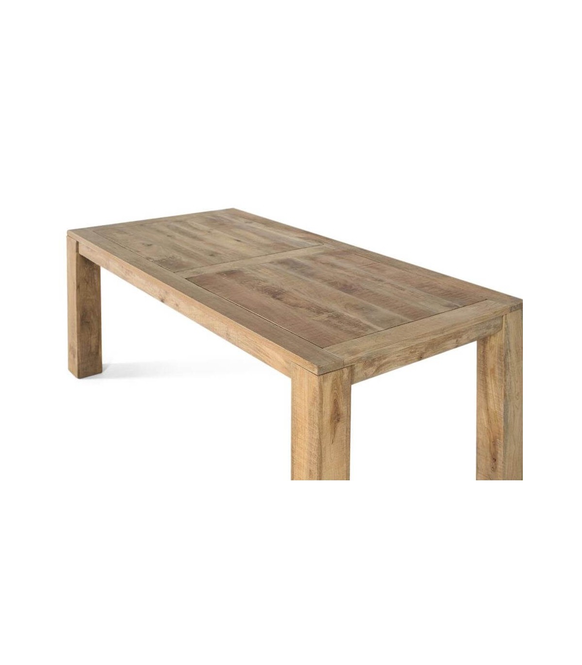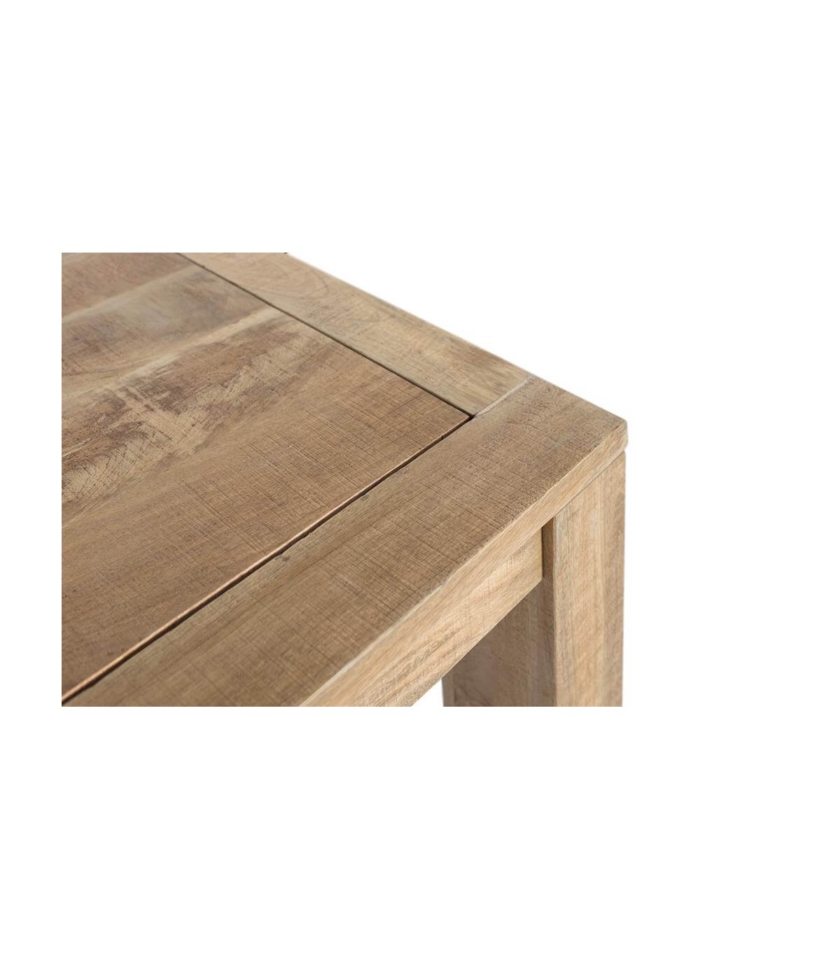 Esta mesa de comedor destaca por su imponente presencia y su diseño sencillo, robusto y honesto. Está elaborada íntegramente en madera maciza de mango, con vetas visibles y un acabado natural que realza su carácter orgánico.