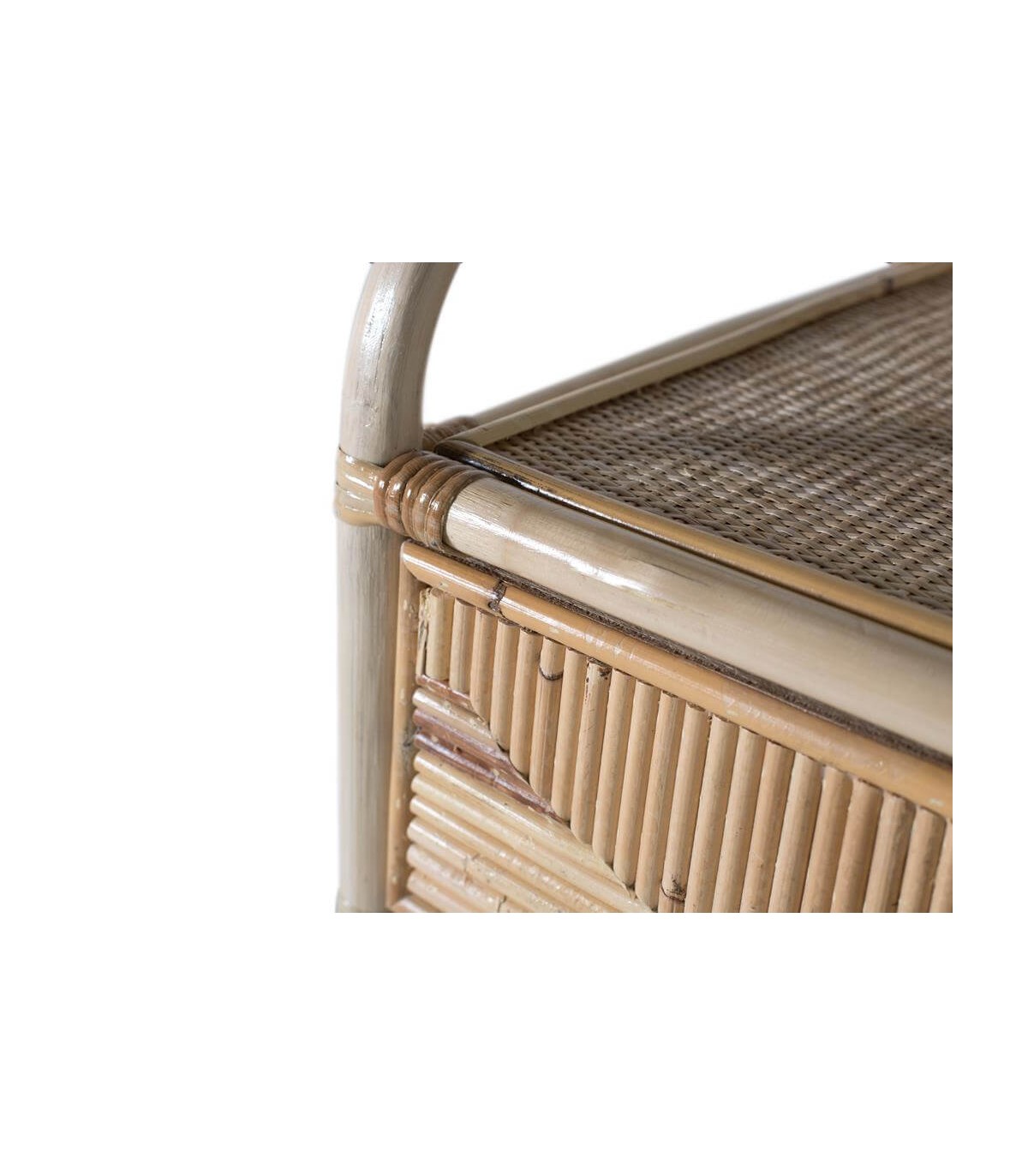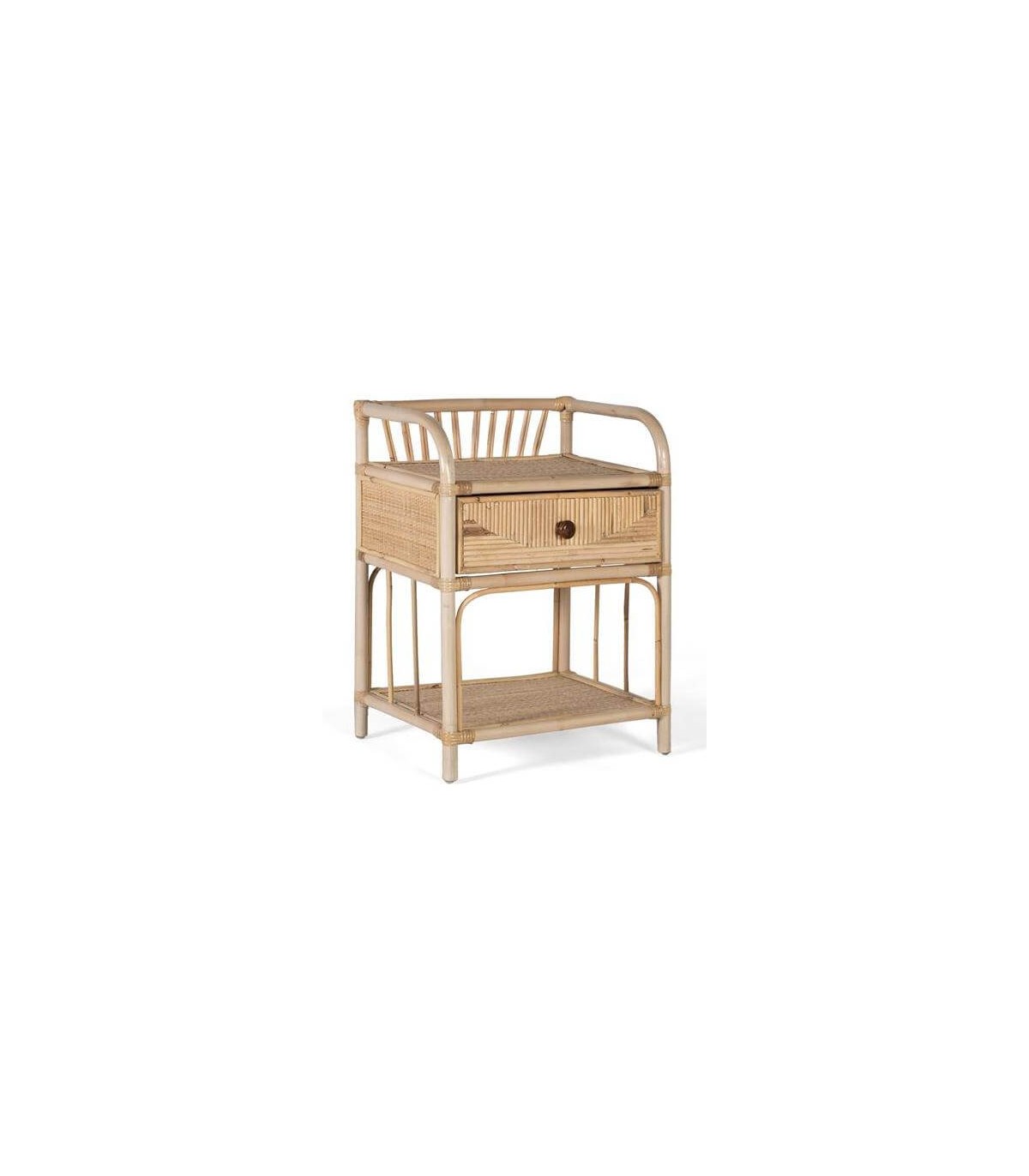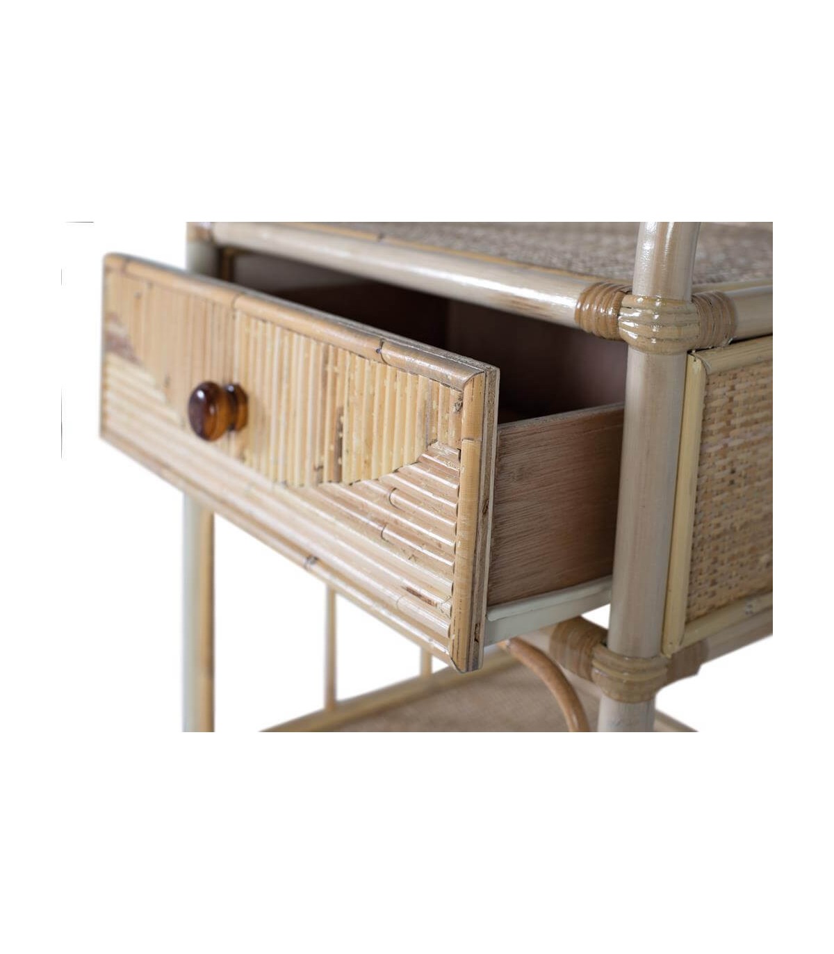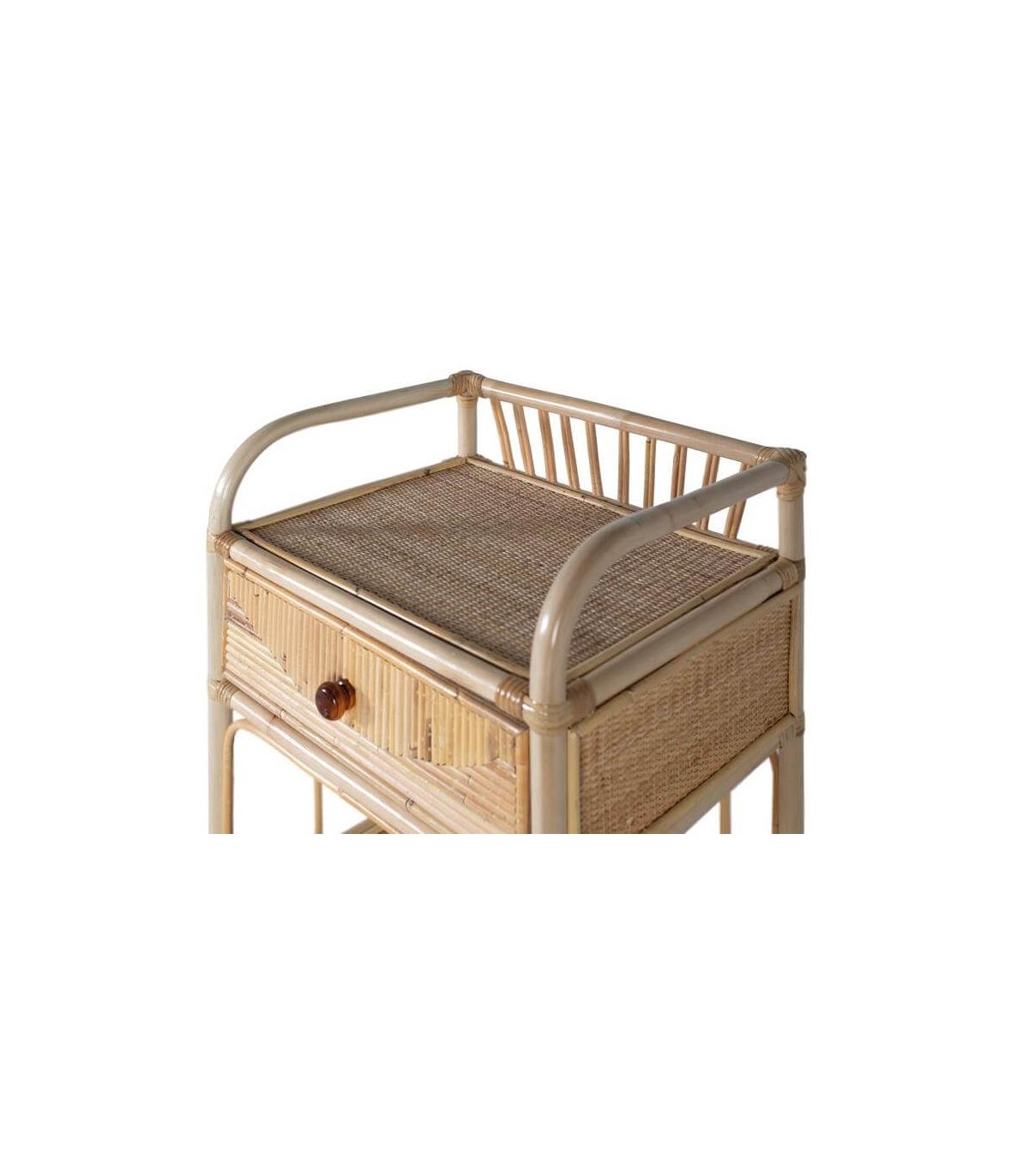 Mesita de noche con 1 cajón y una balda inferior y una trasera y costados que le dan más cuerpo, realizada artesanalmente en ratán natural, una mesita de noche ligera visualmente, perfecta para crear ambientes naturales.