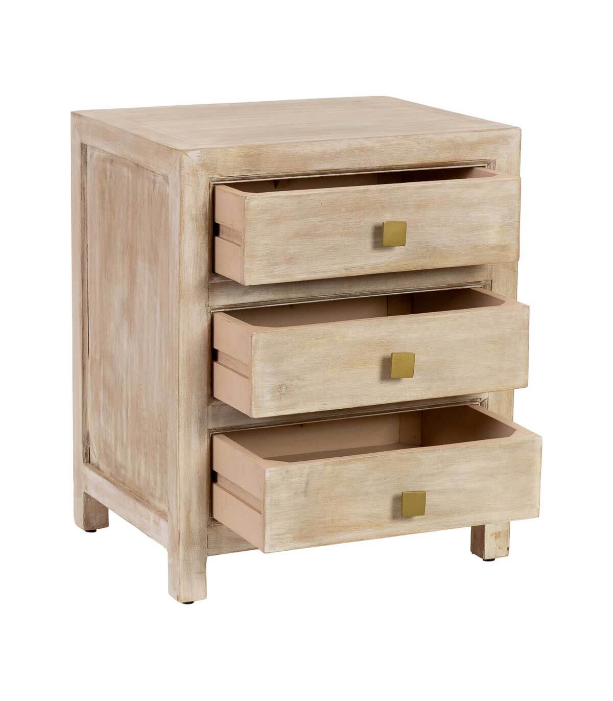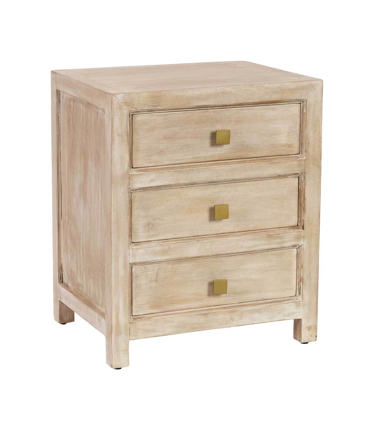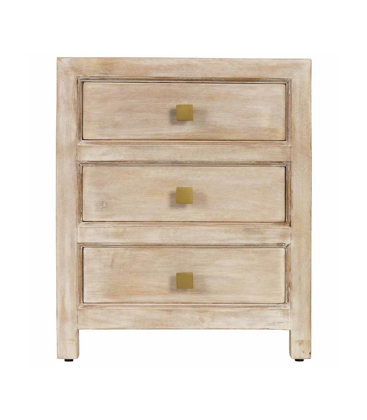 Esta mesita de noche con tres cajones une ligereza y encanto bohemio gracias a su acabado crema patinado y los tiradores dorados. Fabricada en madera maciza de mango, ofrece resistencia y un aspecto cálido que ilumina el dormitorio.