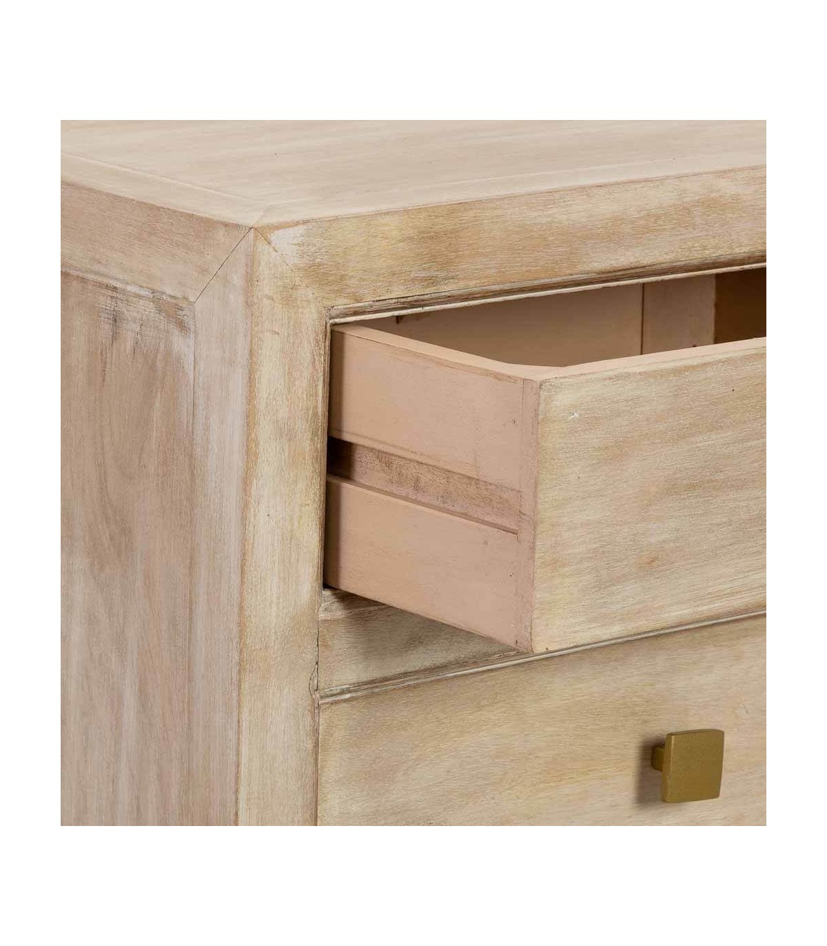 Sus líneas sencillas permiten integrarla en ambientes boho, naturales o de inspiración mediterránea. Los cajones amplios ayudan a mantener el orden de objetos pequeños o textiles. Es perfecta como compañera de cama o mueble auxiliar en rincones acogedores. Un diseño versátil que combina utilidad, textura y una presencia relajada.