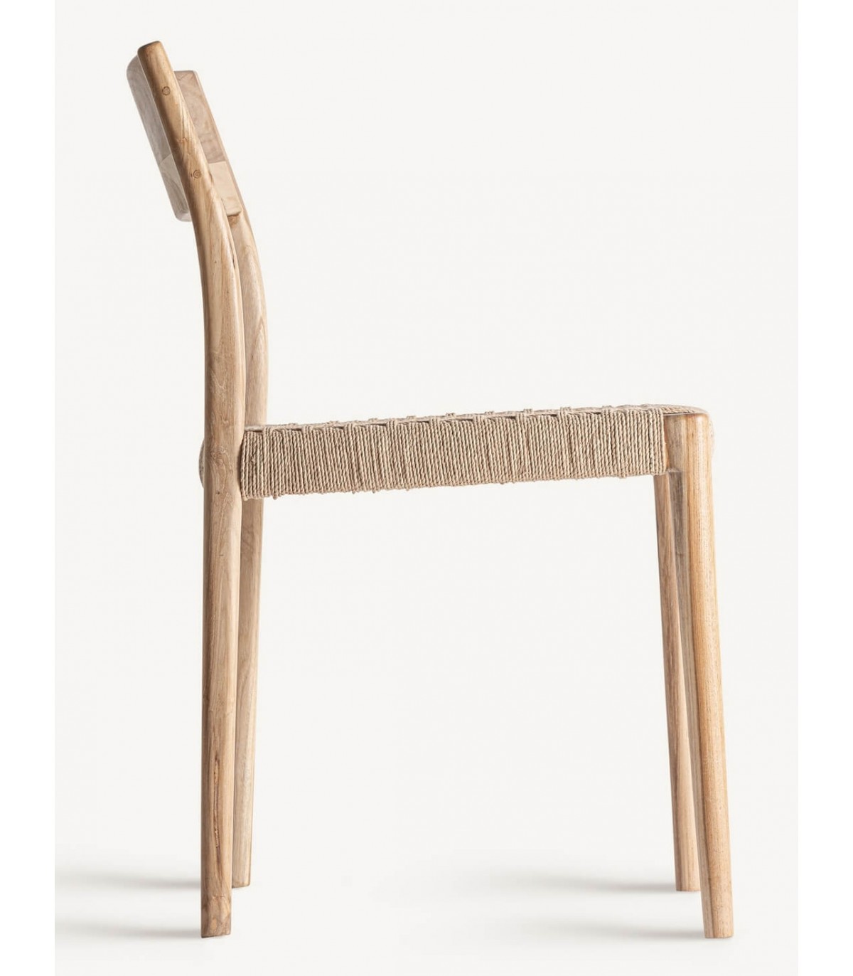 Set de dos sillas de comedor elaboradas en madera maciza de teca con asiento de fibras naturales trenzadas a mano. Su estructura robusta y su diseño depurado reflejan la belleza de los materiales auténticos y las formas simples. La textura cálida del trenzado artesanal aporta una sensación acogedora que combina con ambientes boho, mediterráneos o contemporáneos.