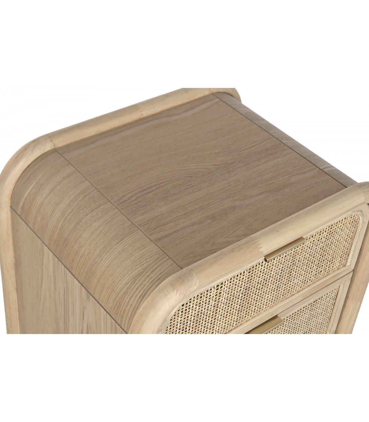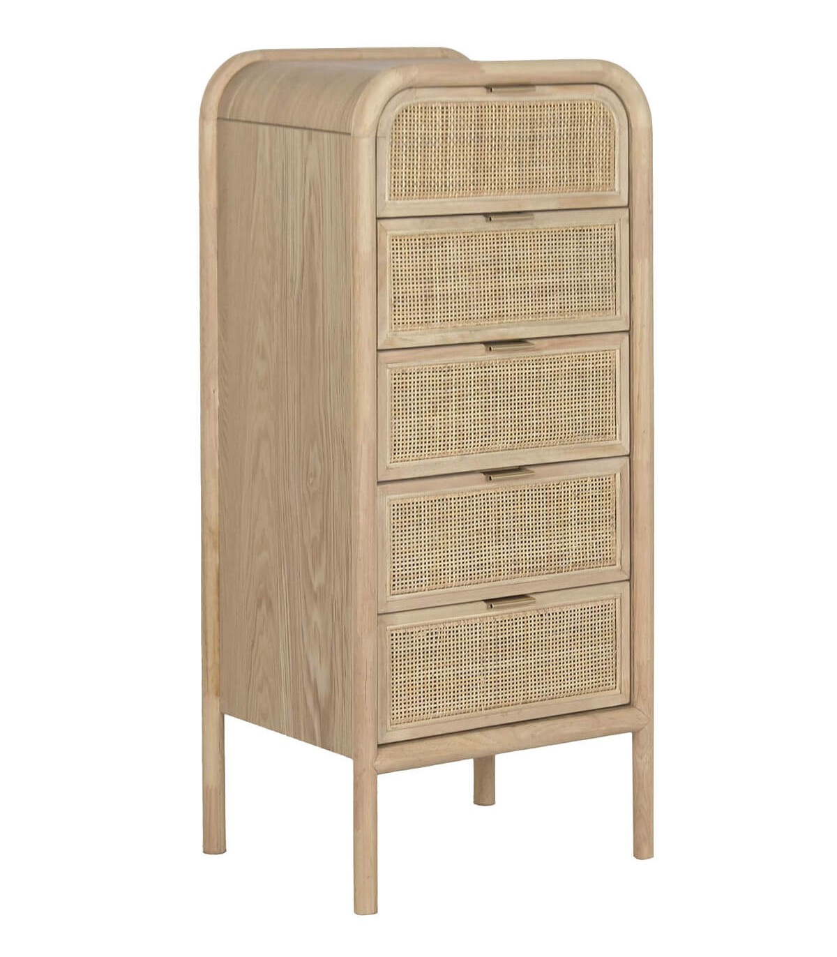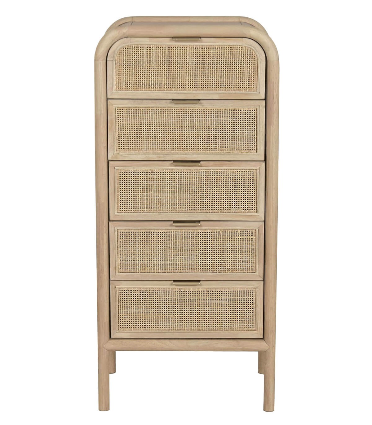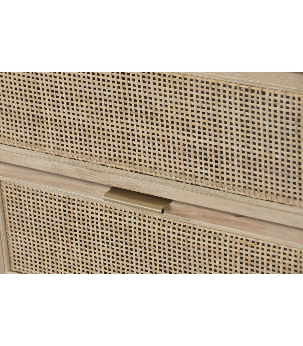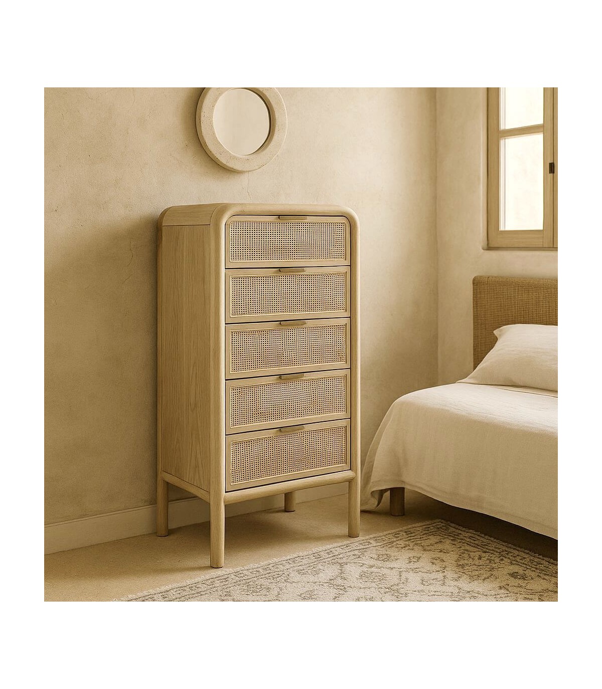 Sinfonier de cinco cajones fabricado en madera de abeto y ratán natural que destaca por su ligereza visual y textura cálida. El entramado artesanal de las frontales aporta frescura y una estética bohemia muy versátil. Los tiradores metálicos en tono dorado añaden un toque refinado sin romper la armonía natural del conjunto.