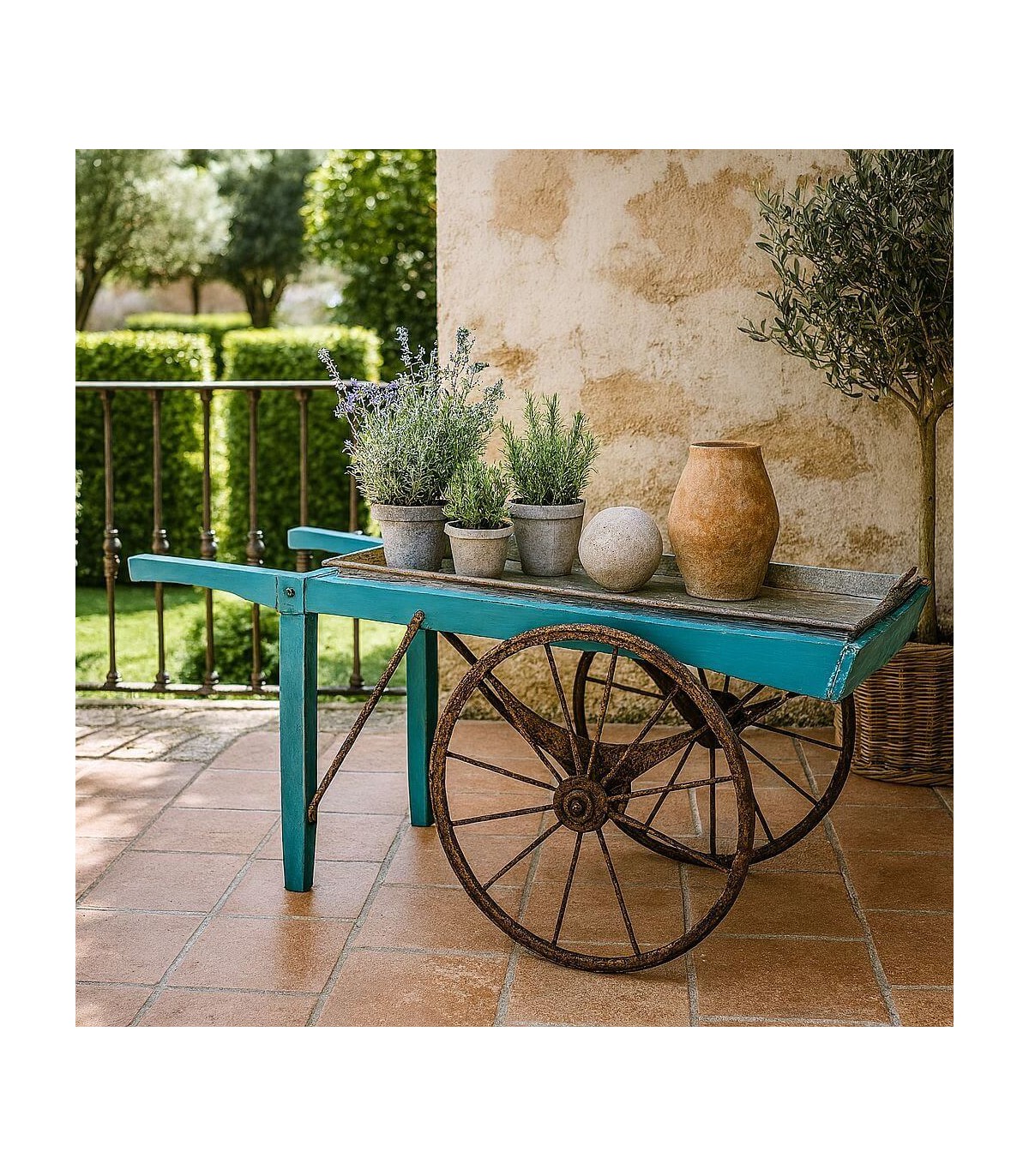 Este carro expositor combina la estética nostálgica de los antiguos carromatos con un diseño versátil ideal para espacios con carácter. Su estructura en madera color turquesa con acabado decapado y ruedas de metal oxidado evoca un aire de mercadillo retro con personalidad.
