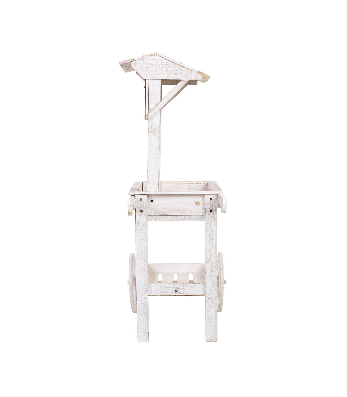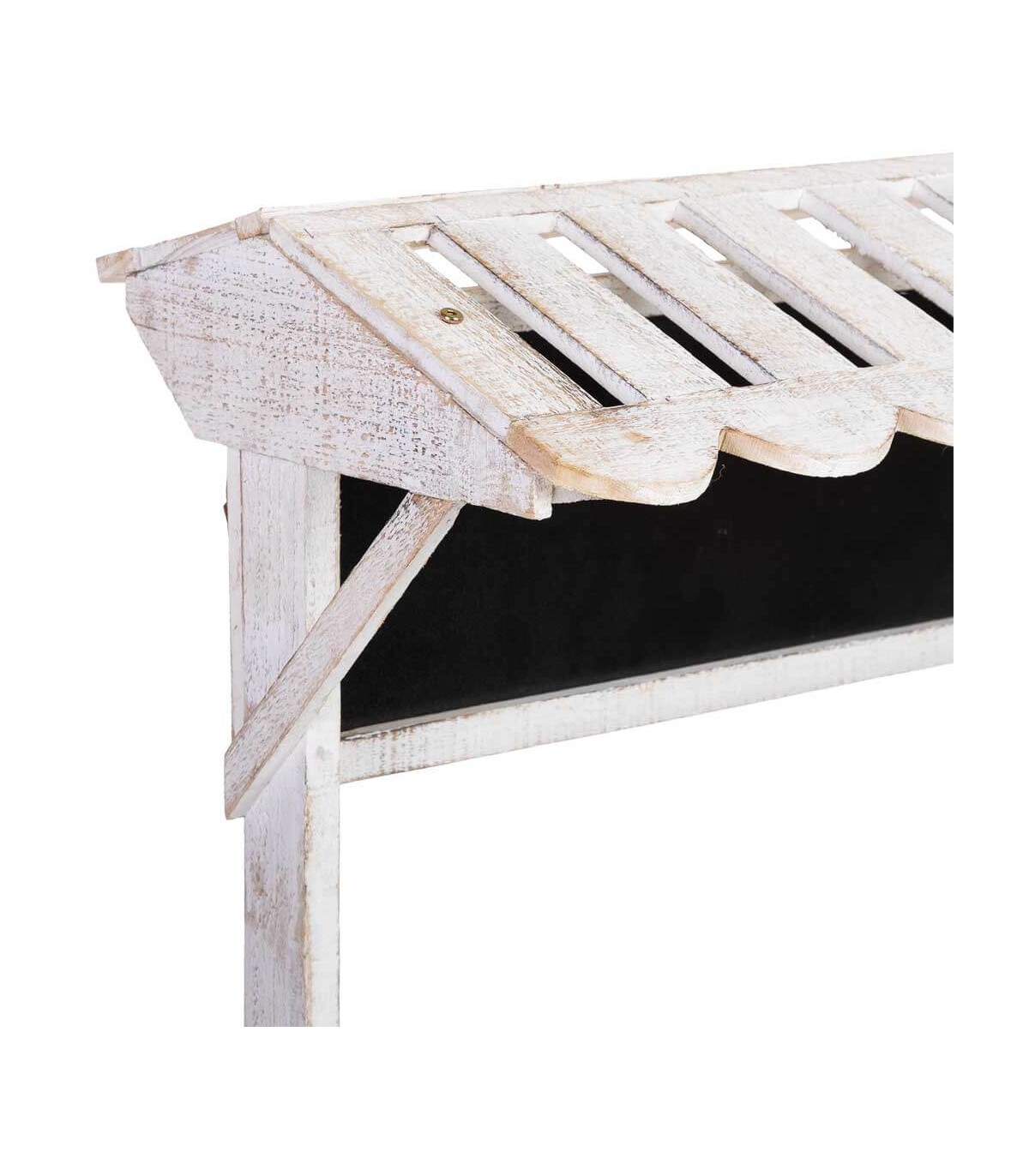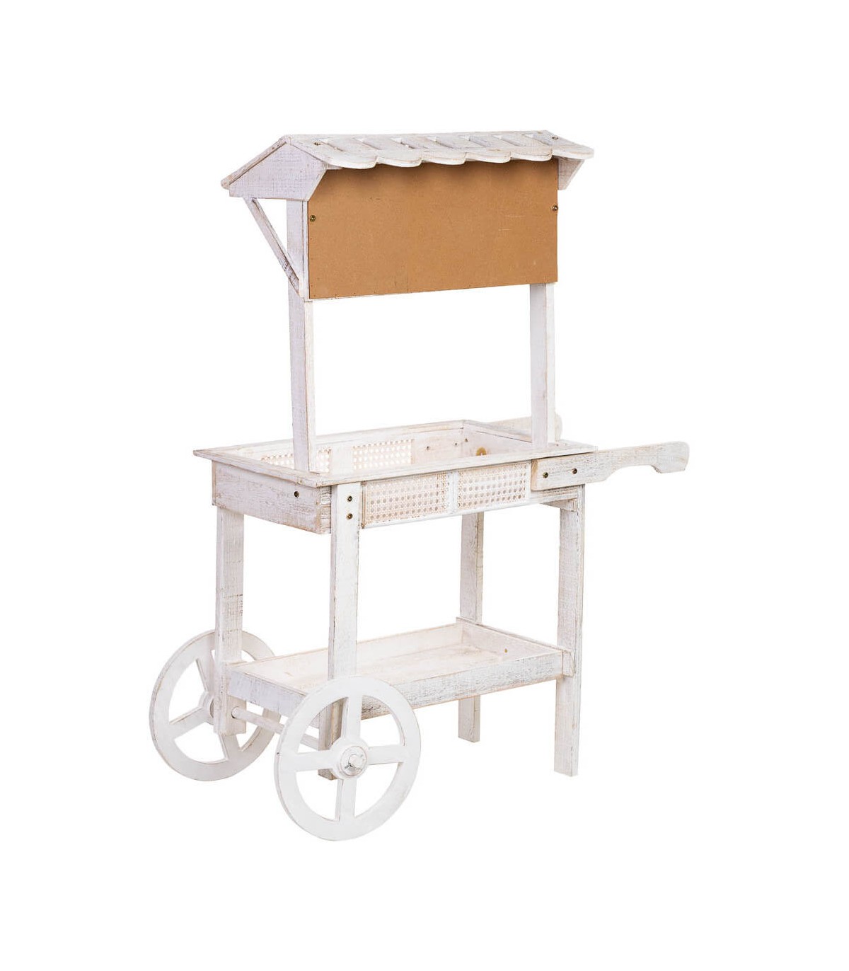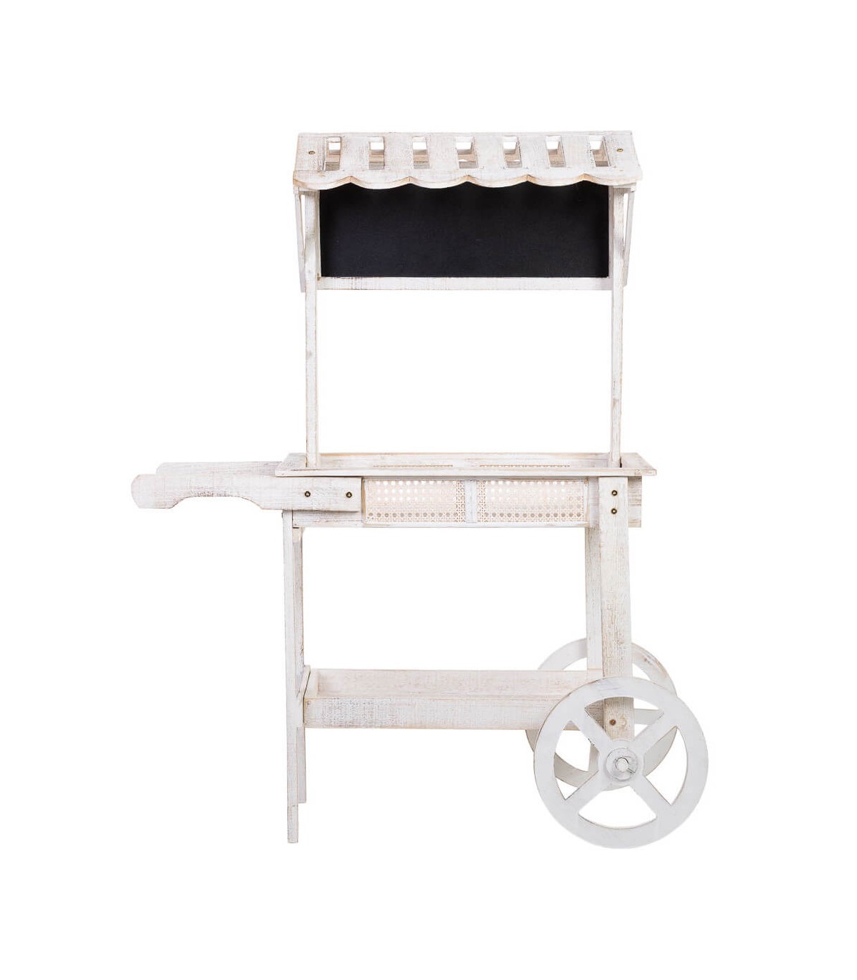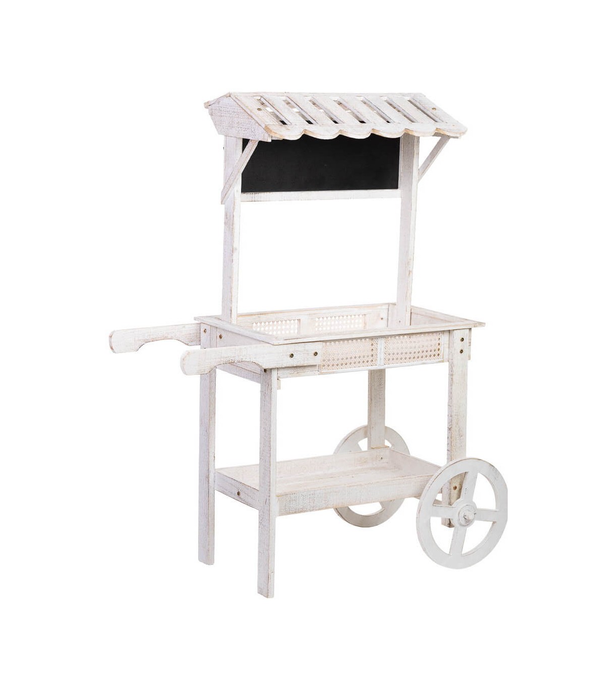 Carro expositor decorativo con ruedas y tejadillo, fabricado en madera blanca con efecto rozado, detalles de ratán natural y pizarra negra en el frontal. Su diseño vintage recuerda a los antiguos puestos de flores o dulces, ideal para ambientar eventos, escaparates o rincones especiales del hogar.