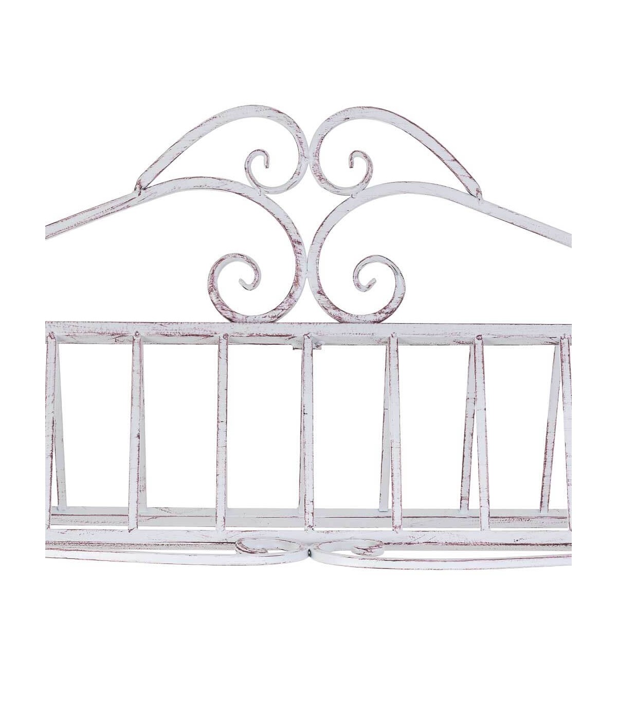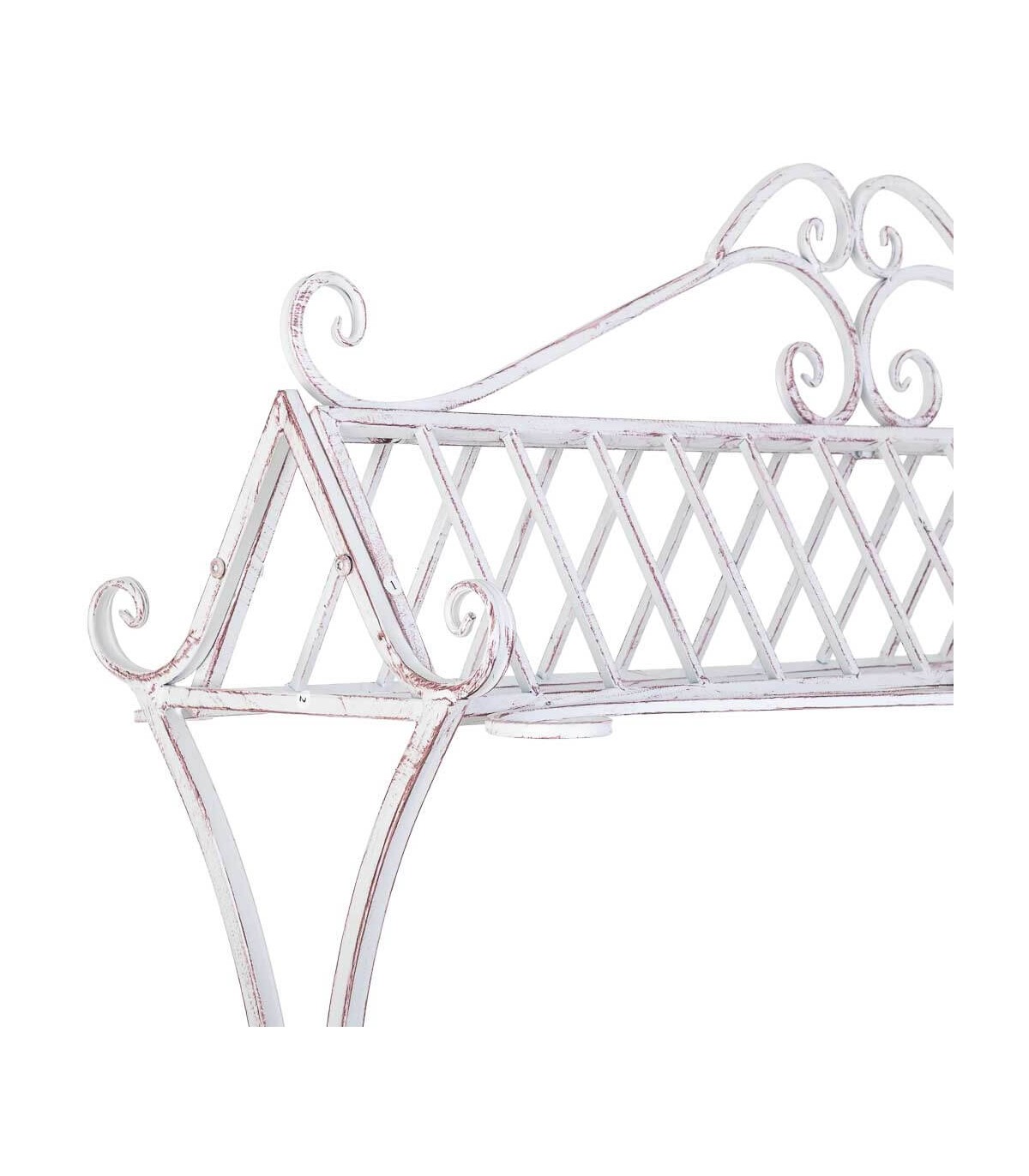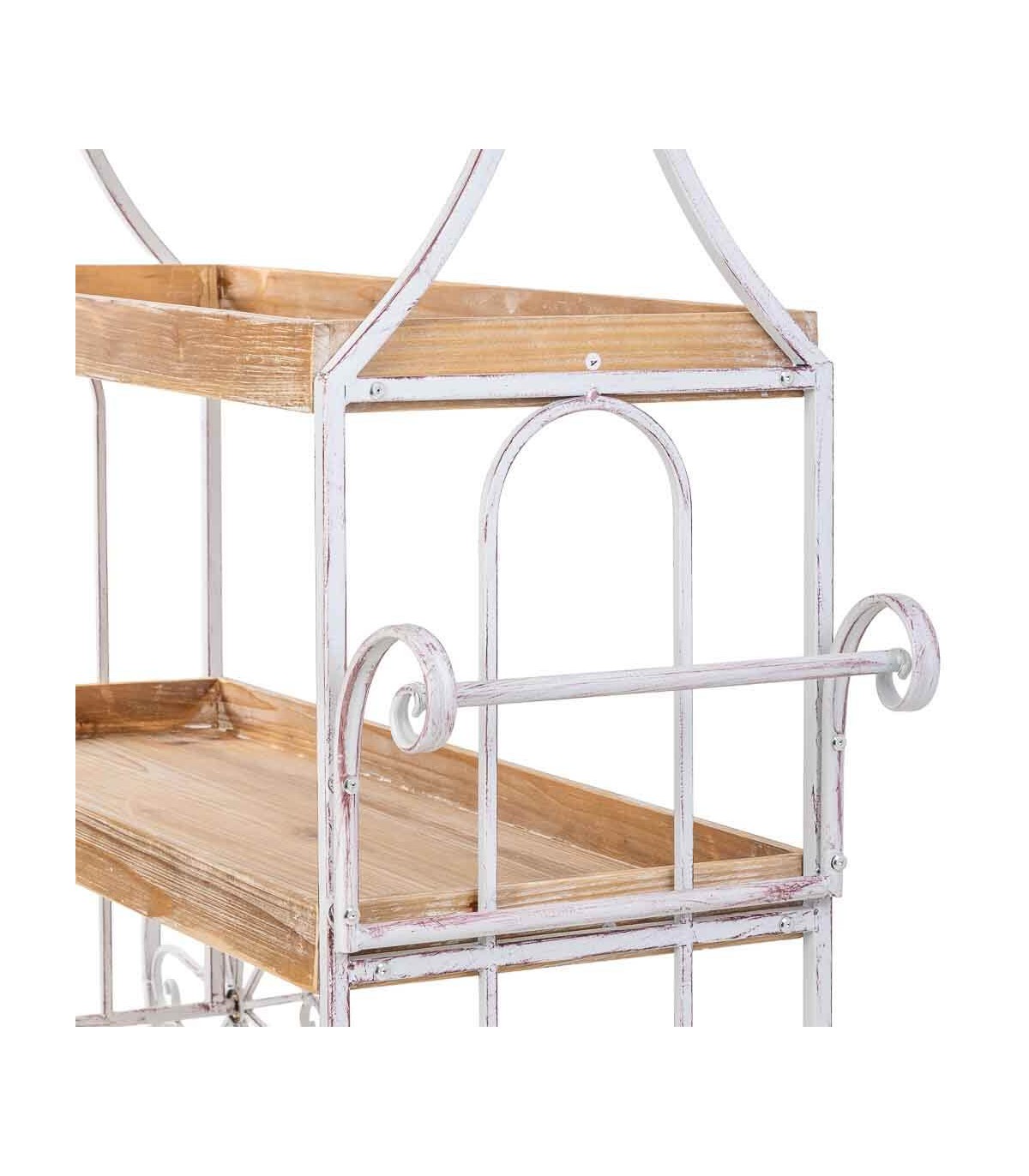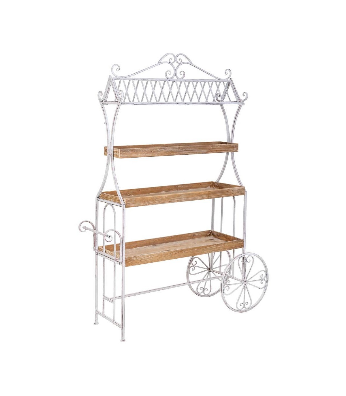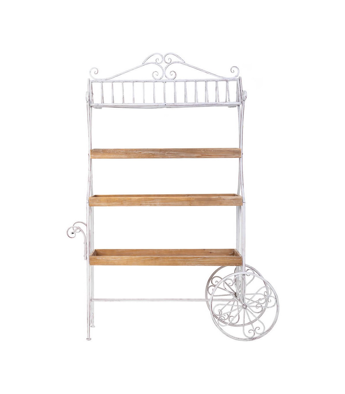 Este carro expositor de gran formato destaca por su diseño decorativo de inspiración romántica con estética envejecida. Su estructura de metal blanco rozado con detalles curvos aporta un aire nostálgico, mientras que las baldas de madera natural patinada en blanco ofrecen una base perfecta para crear composiciones con plantas, objetos decorativos o menaje.