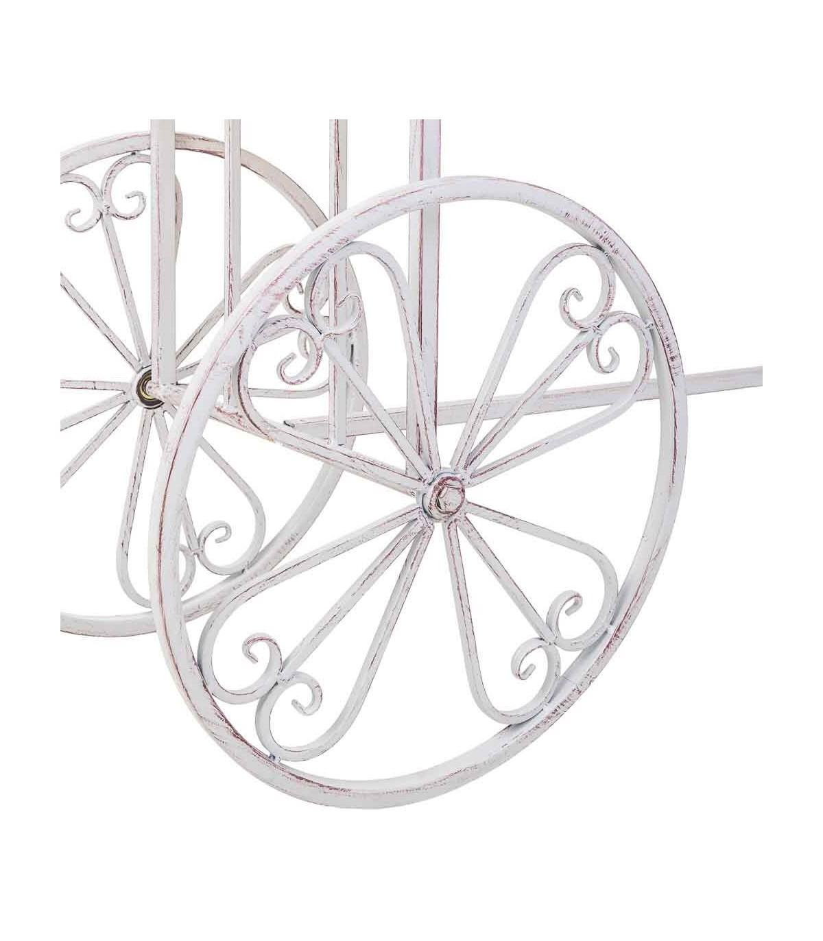 Las ruedas ornamentales y el remate superior en volutas completan una pieza funcional y muy decorativa, ideal para terrazas cubiertas, jardines o espacios interiores con encanto vintage.