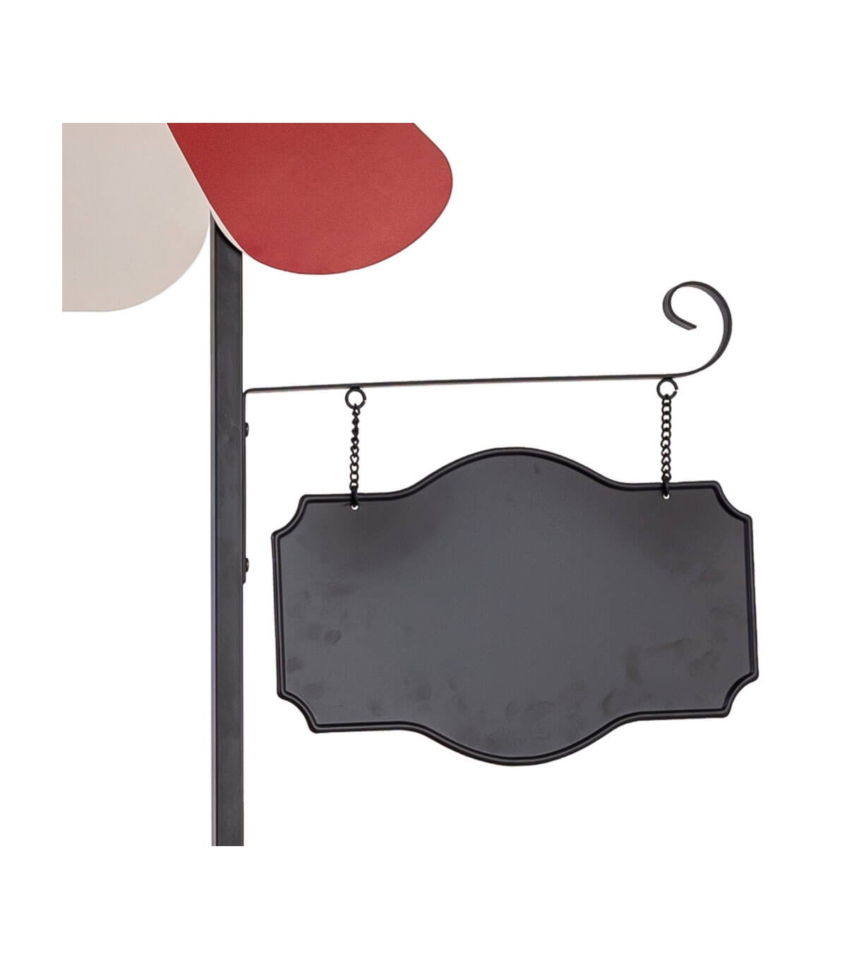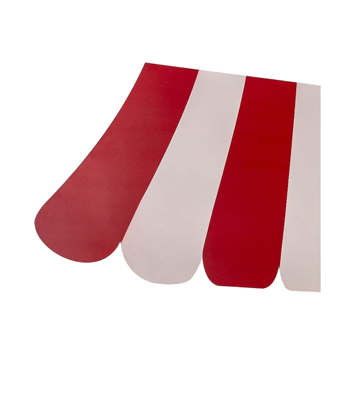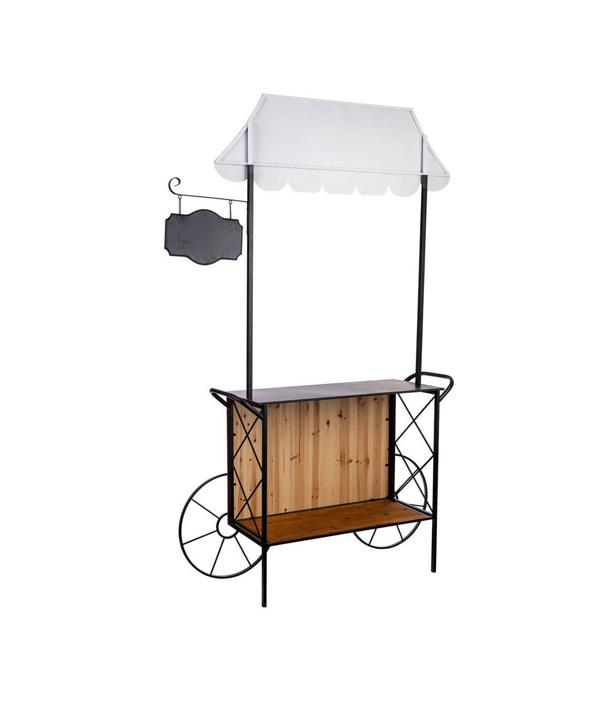 Incorpora una balda inferior para apoyo y un toldo superior en rojo y blanco a rayas, ideal para crear composiciones visuales en escaparates, ferias, eventos o corners temáticos. Perfecto como mueble de presentación en negocios con personalidad única.