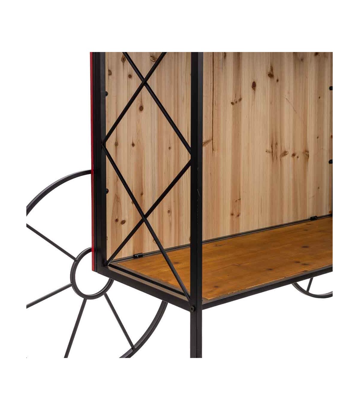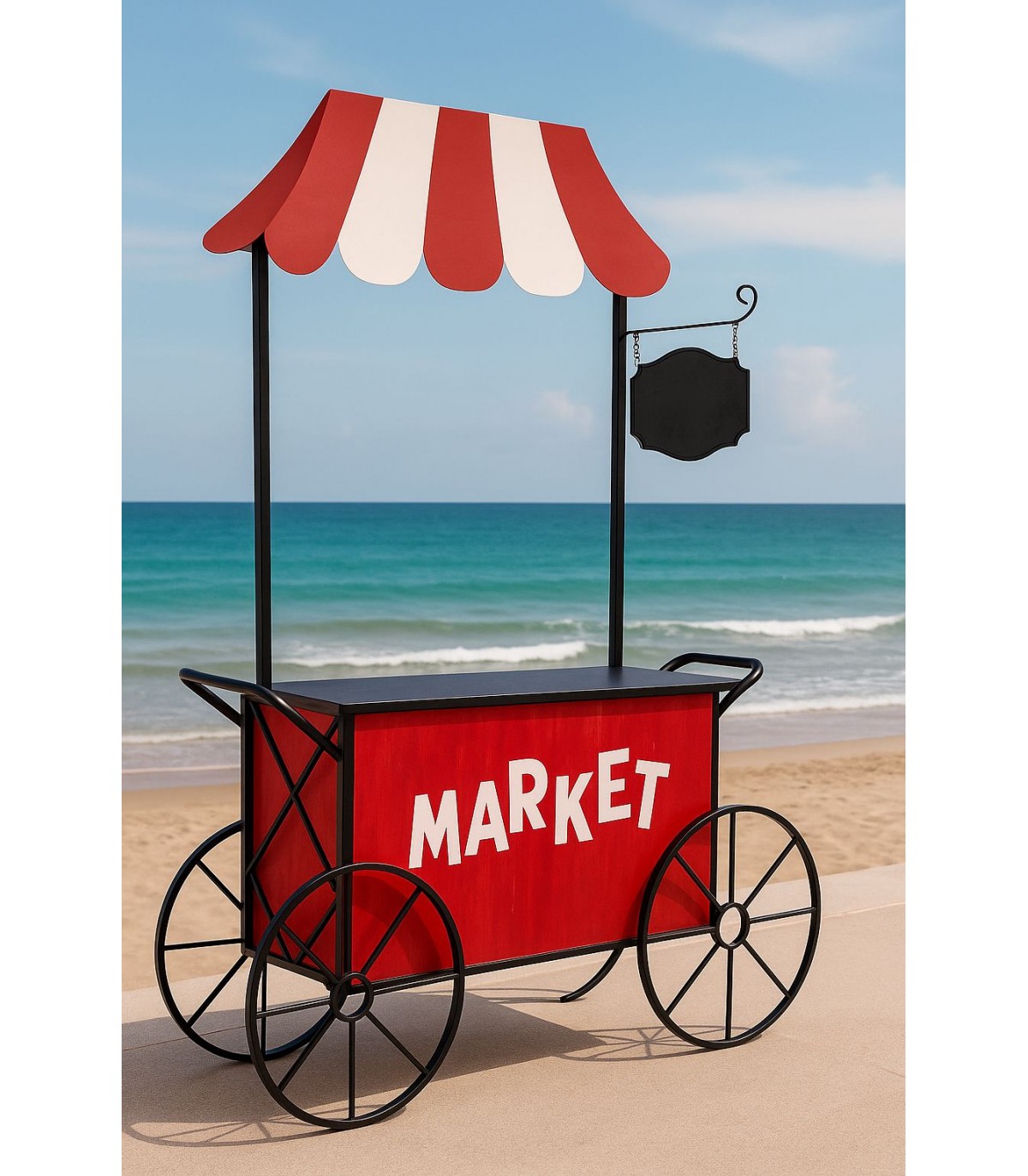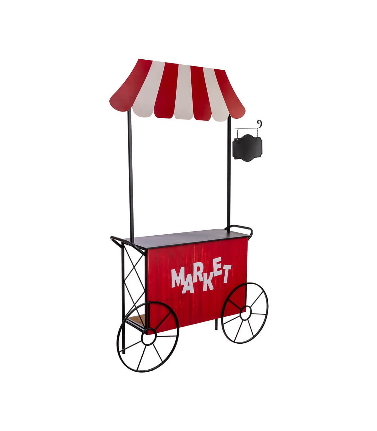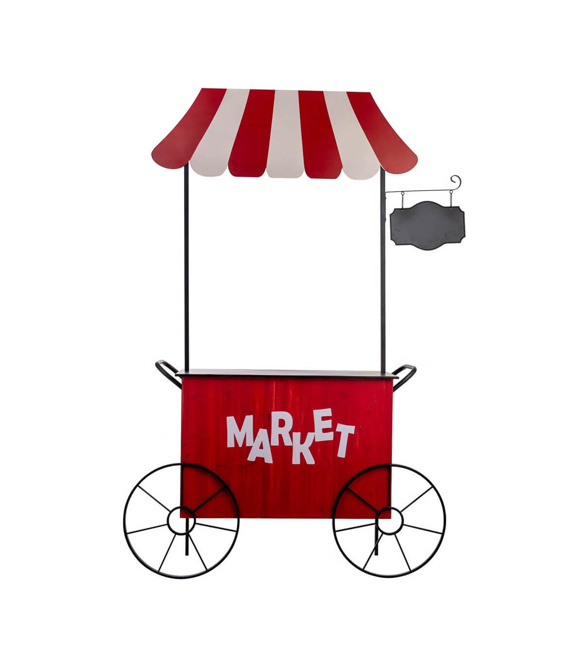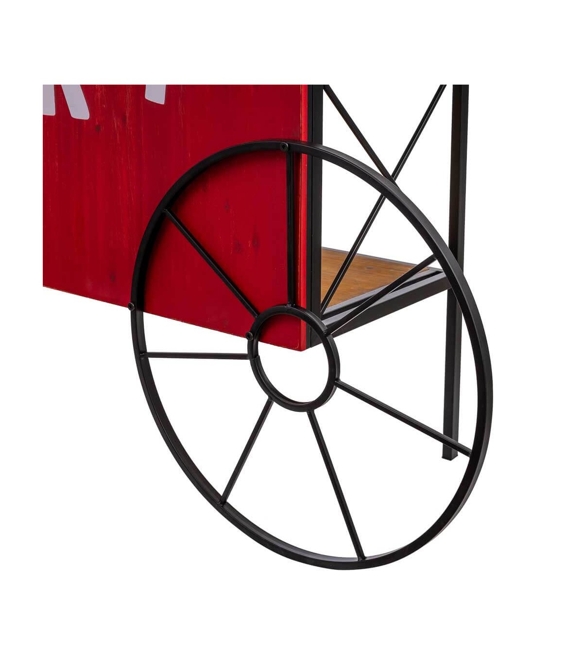 Este carro expositor de gran formato evoca los antiguos puestos de mercado con su inconfundible estética vintage. Su estructura metálica negra con ruedas de radios grandes aporta solidez y carácter, mientras que los paneles de madera natural y rojo intenso con letras blancas decorativas añaden un toque alegre y retro.