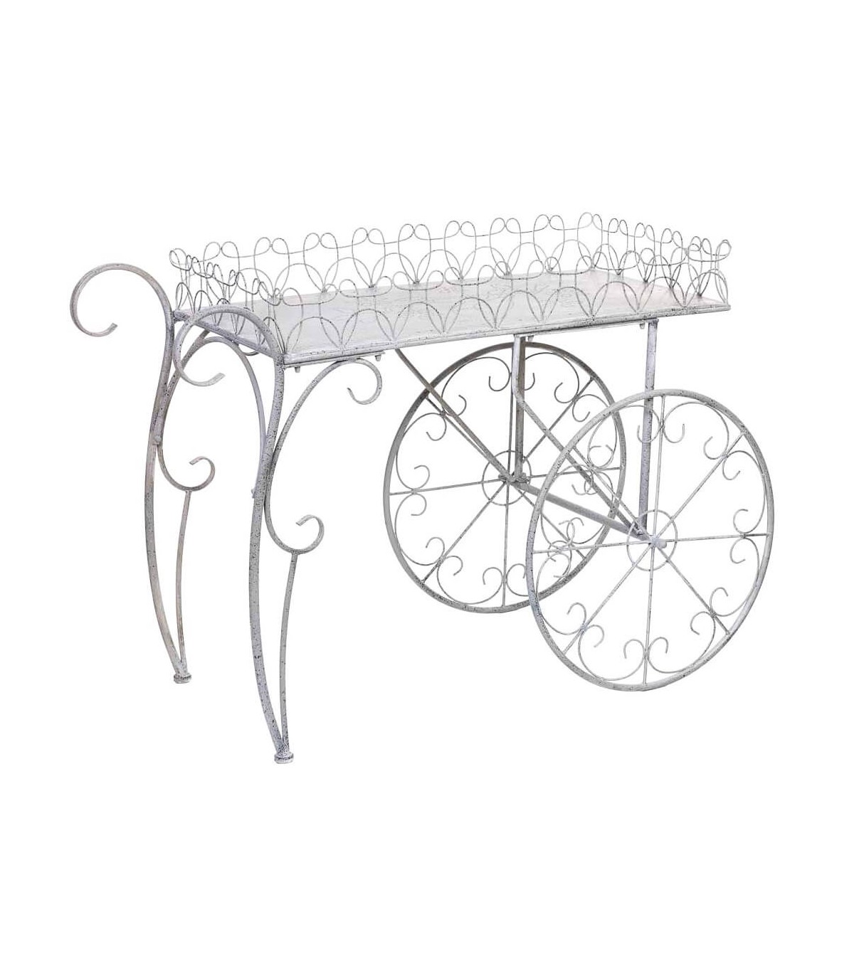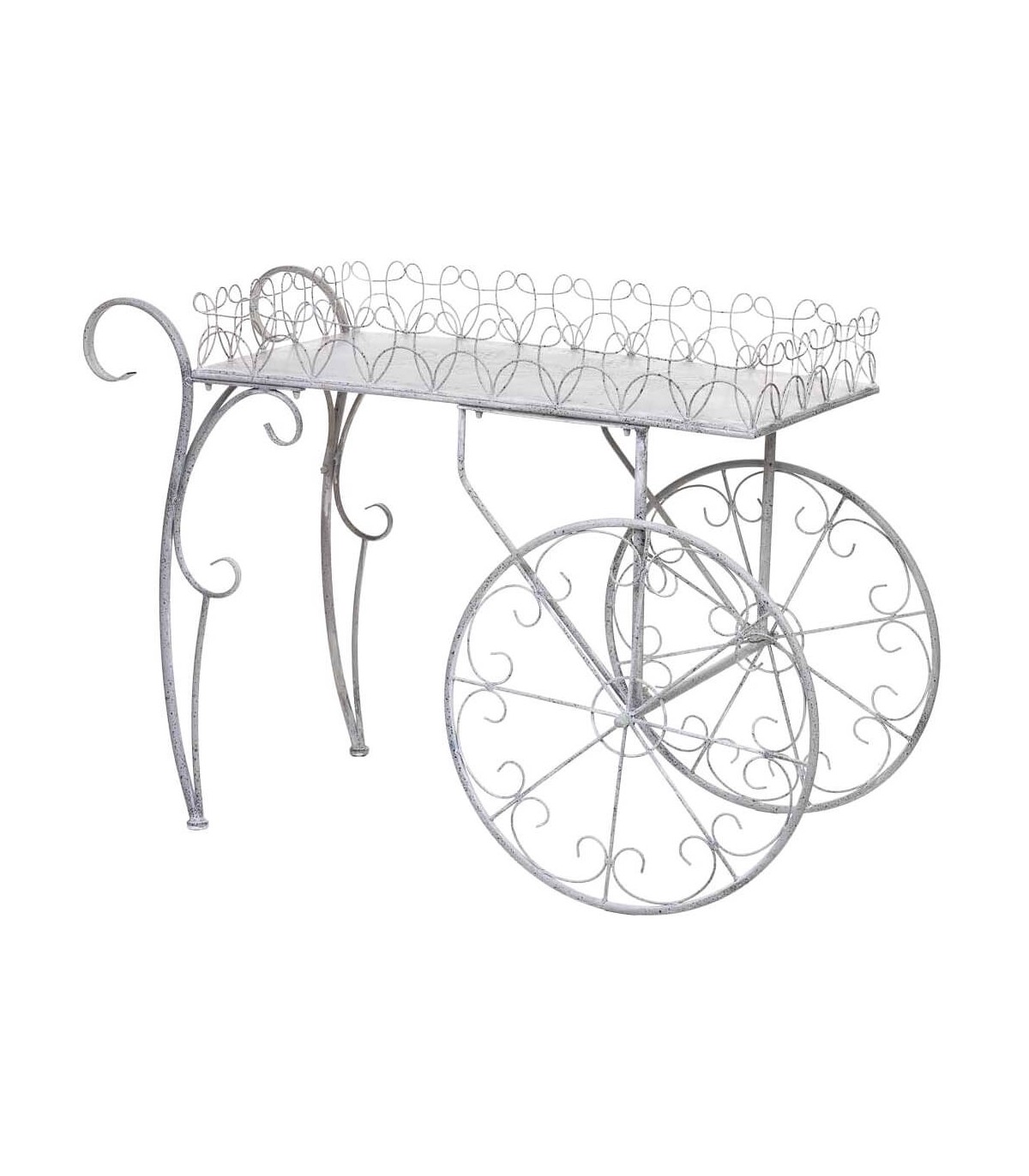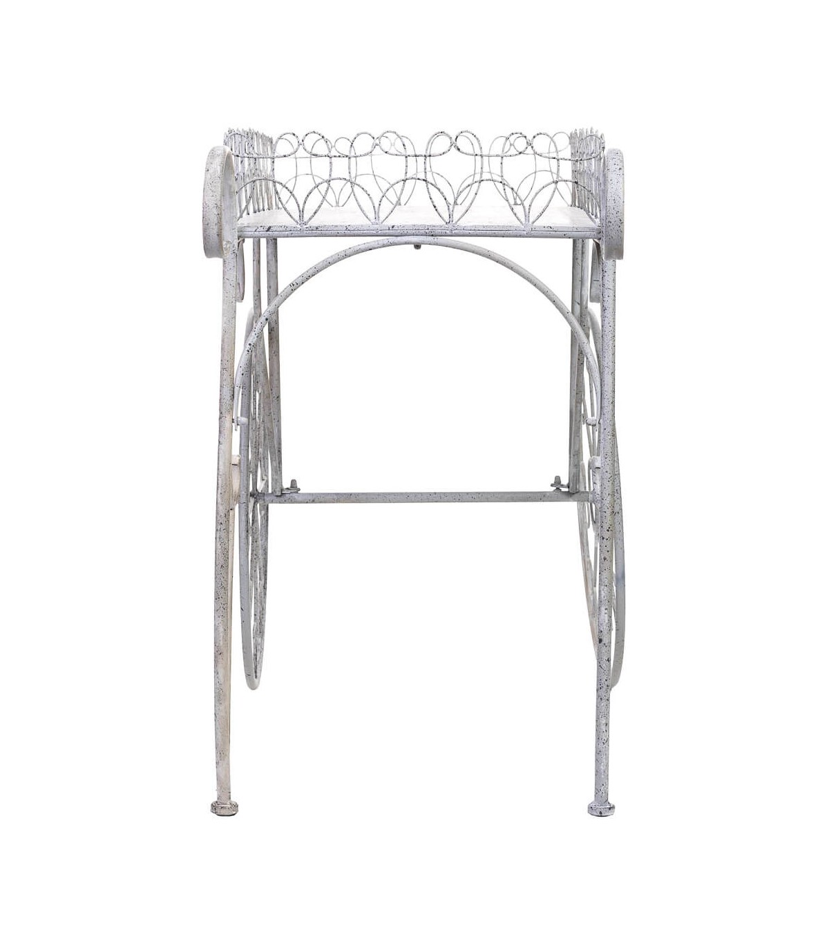 Este encantador carro expositor está fabricado en metal con un diseño ornamentado de inspiración clásica, ideal para decorar tanto interiores como exteriores. Su forma de carrito antiguo con grandes ruedas caladas y bandeja superior con celosía rizada aporta un aire romántico, evocador y lleno de carácter.