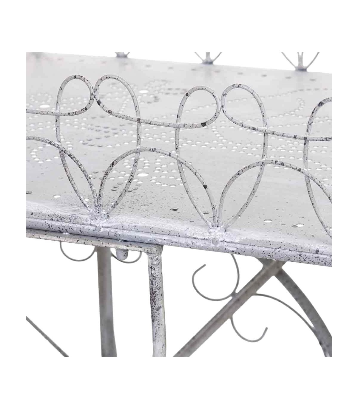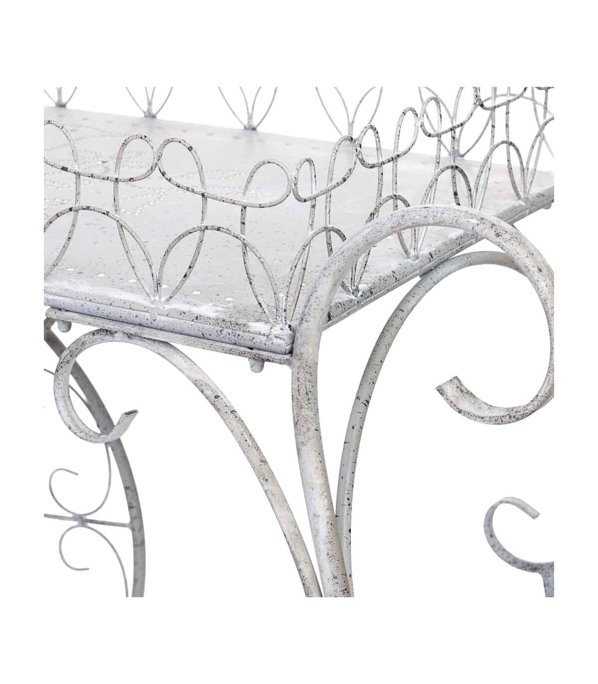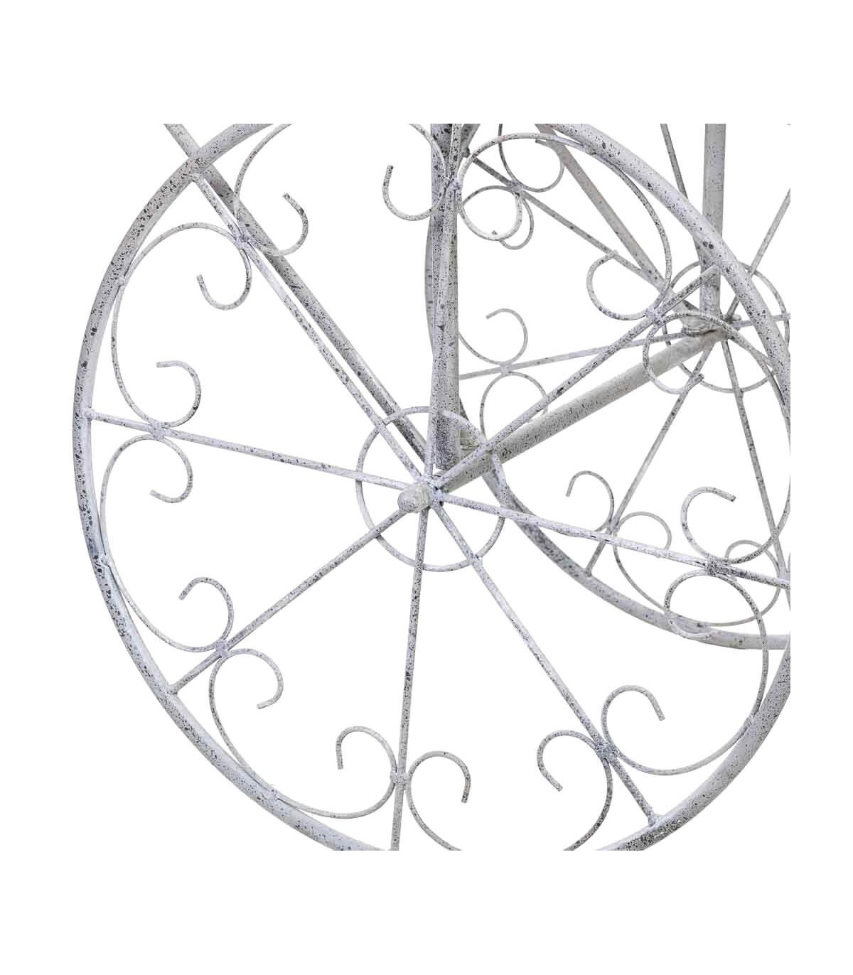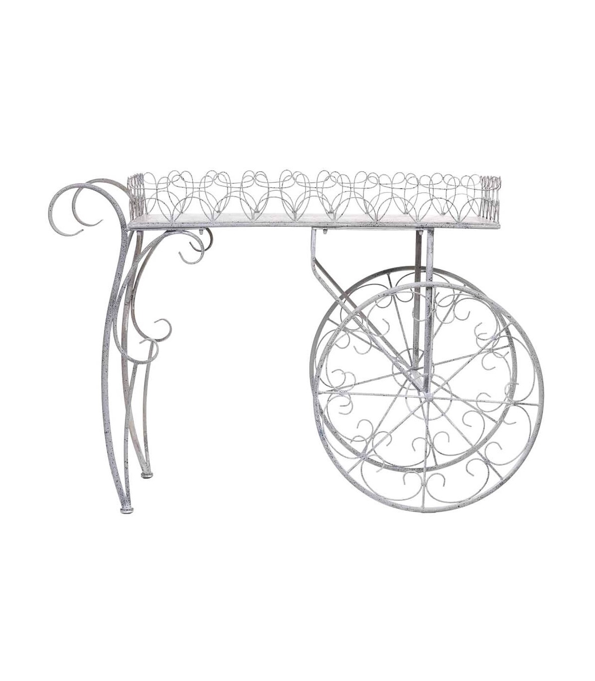 Este encantador carro expositor está fabricado en metal con un diseño ornamentado de inspiración clásica, ideal para decorar tanto interiores como exteriores. Su forma de carrito antiguo con grandes ruedas caladas y bandeja superior con celosía rizada aporta un aire romántico, evocador y lleno de carácter.