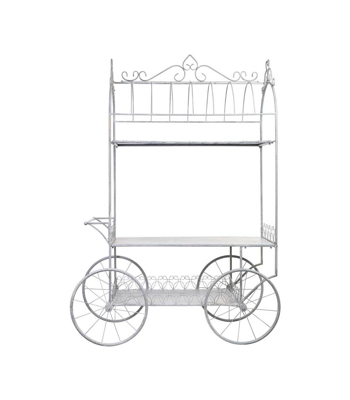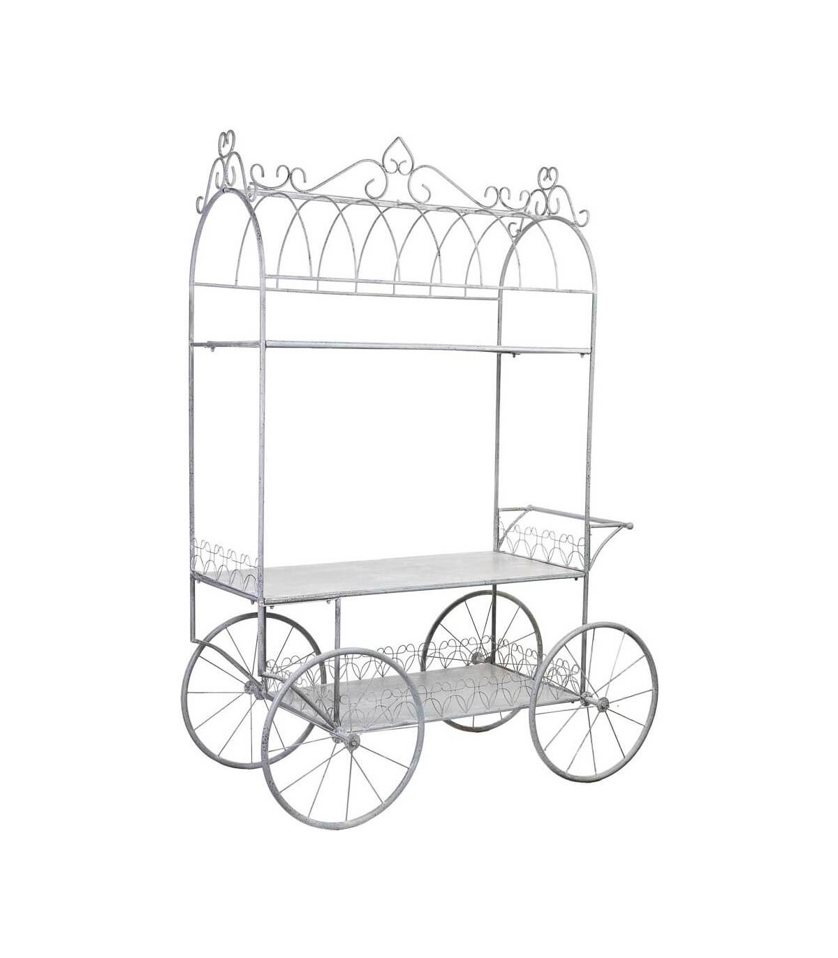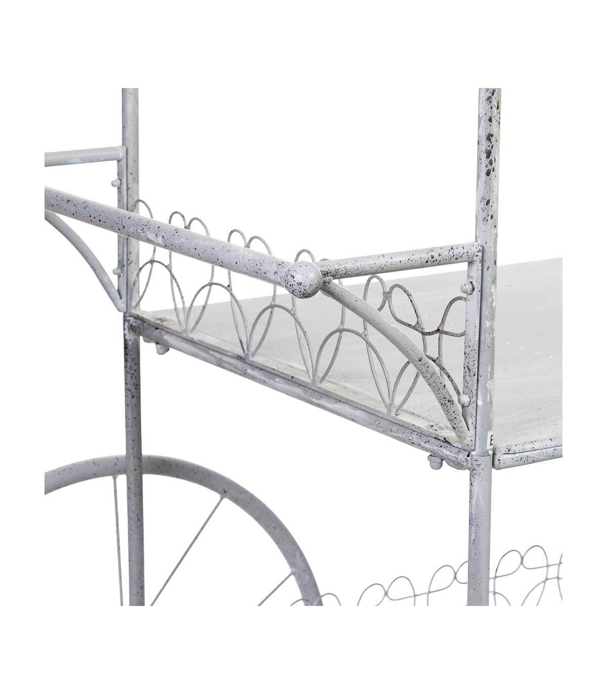 Luce tus objetos más especiales con este carro expositor XXL de inspiración vintage, fabricado en metal con un acabado artesanal en gris patinado blanco. Con tres niveles útiles y grandes ruedas decorativas, su diseño abierto con barrotes curvos y motivos de corazones aporta un aire romántico y encantador.