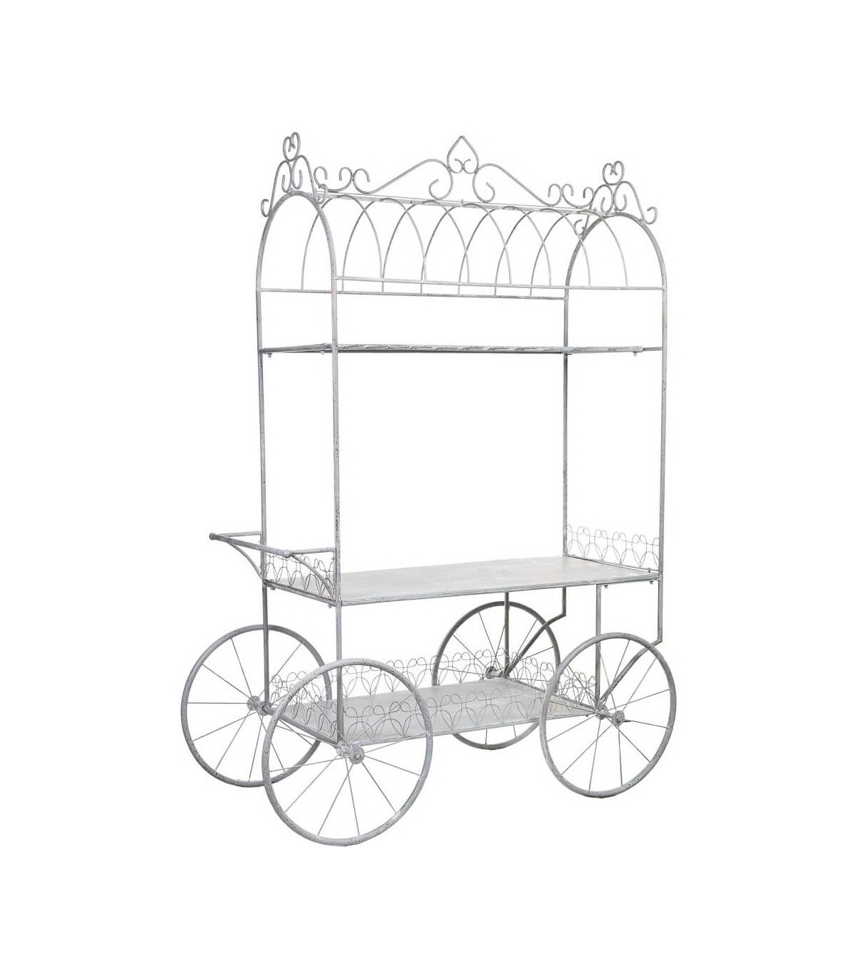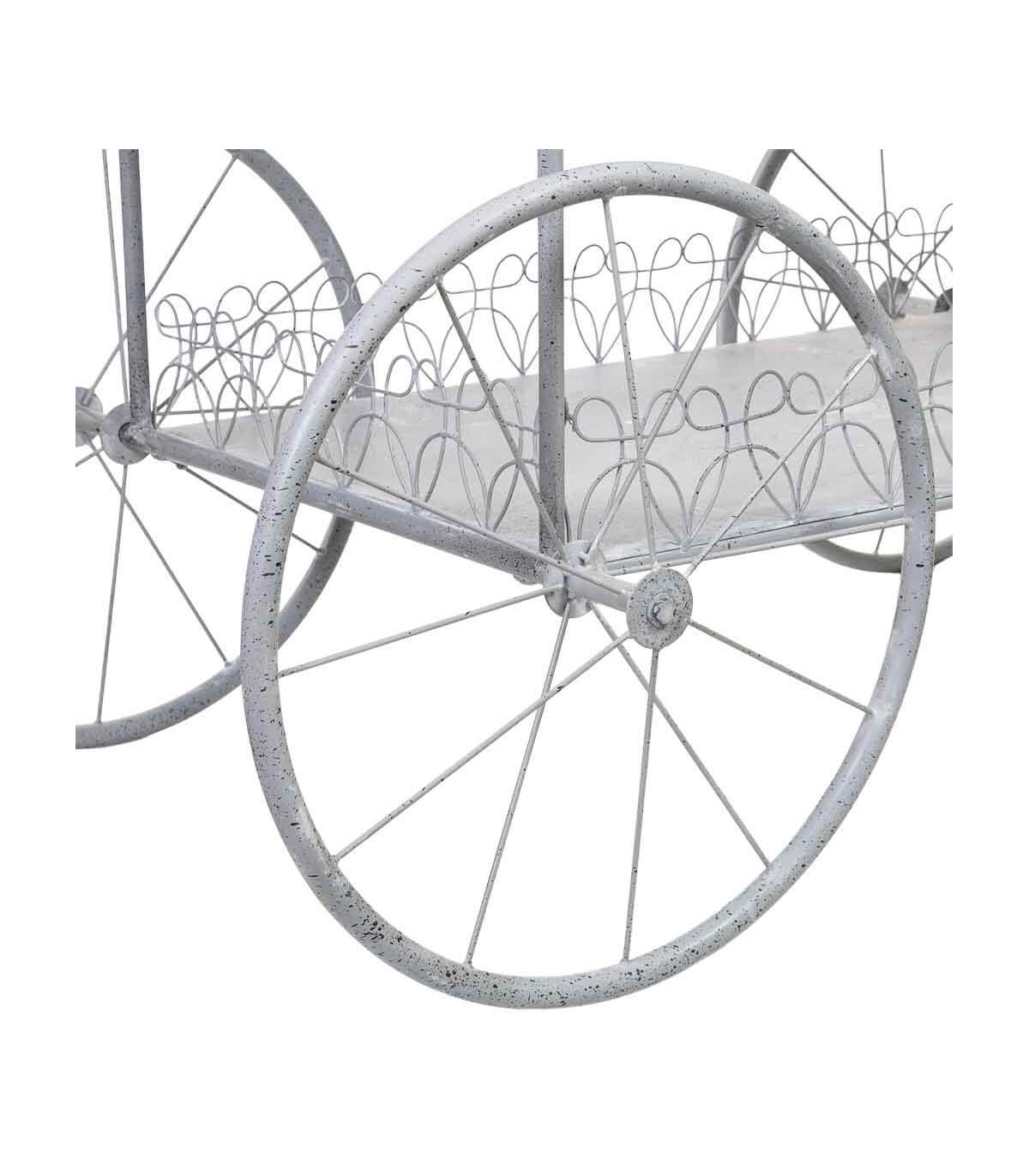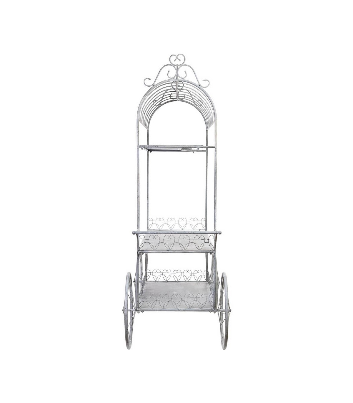 Luce tus objetos más especiales con este carro expositor XXL de inspiración vintage, fabricado en metal con un acabado artesanal en gris patinado blanco. Con tres niveles útiles y grandes ruedas decorativas, su diseño abierto con barrotes curvos y motivos de corazones aporta un aire romántico y encantador.