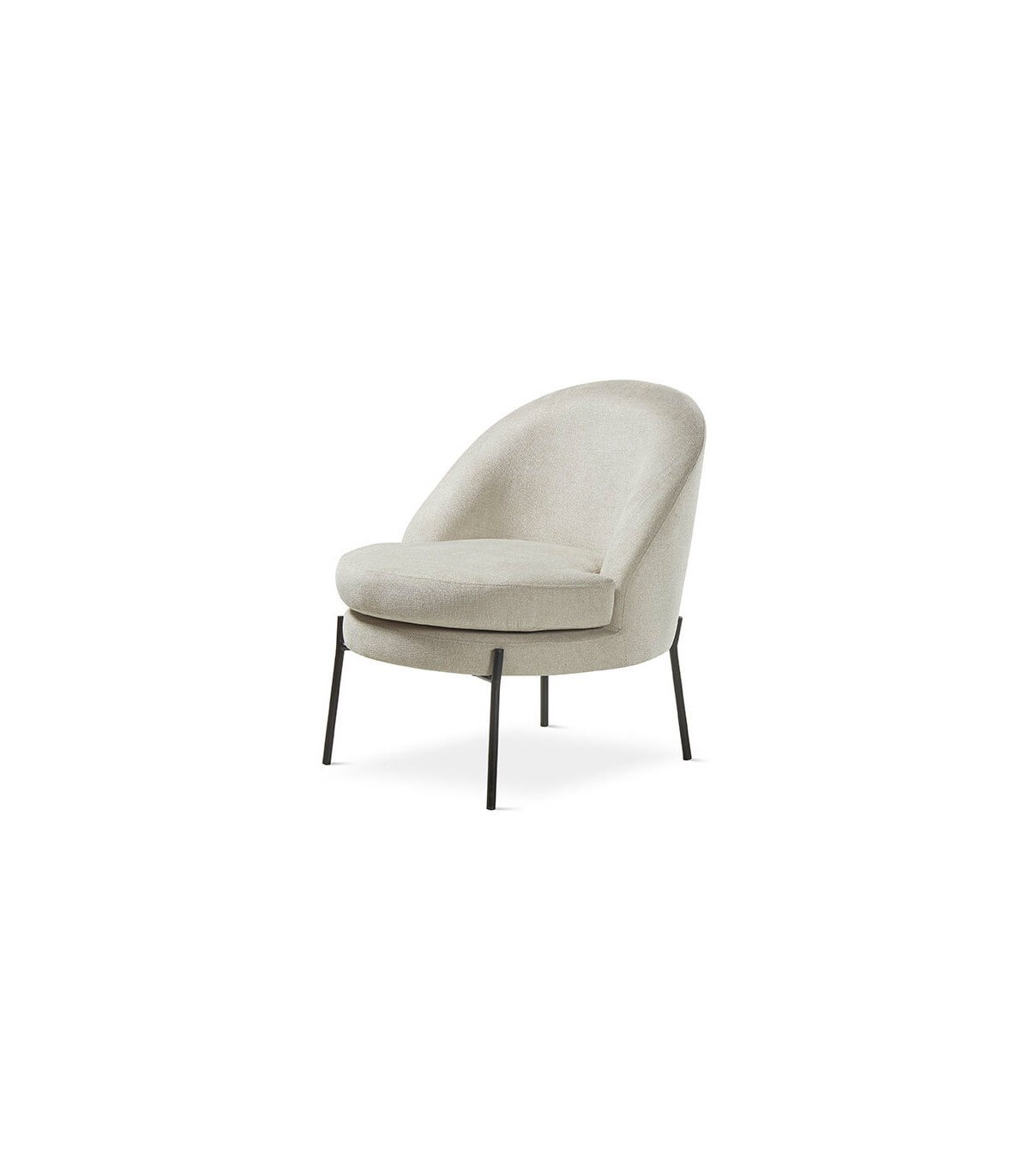 Butaca baja de estilo industrial, tapizado en color blanco roto con las patas en metal negro, un sillón muy cómodo que aporta muy poco volumen visual, perfecto para un rincón de lectura, el salón o el dormitorio.