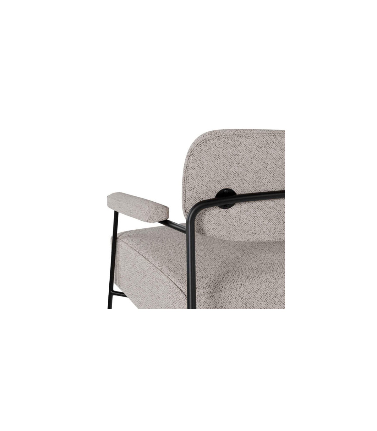 Butaca cómoda de estilo moderno, con la estructura en metal negro y los cojines tapizados en tela jaspeada color topo.