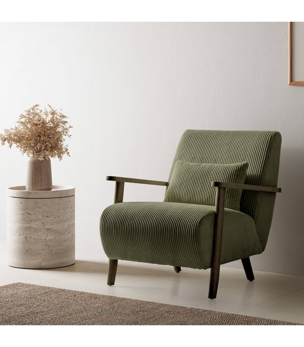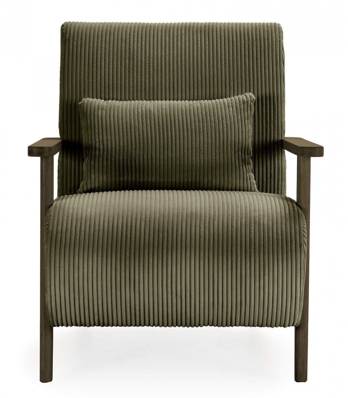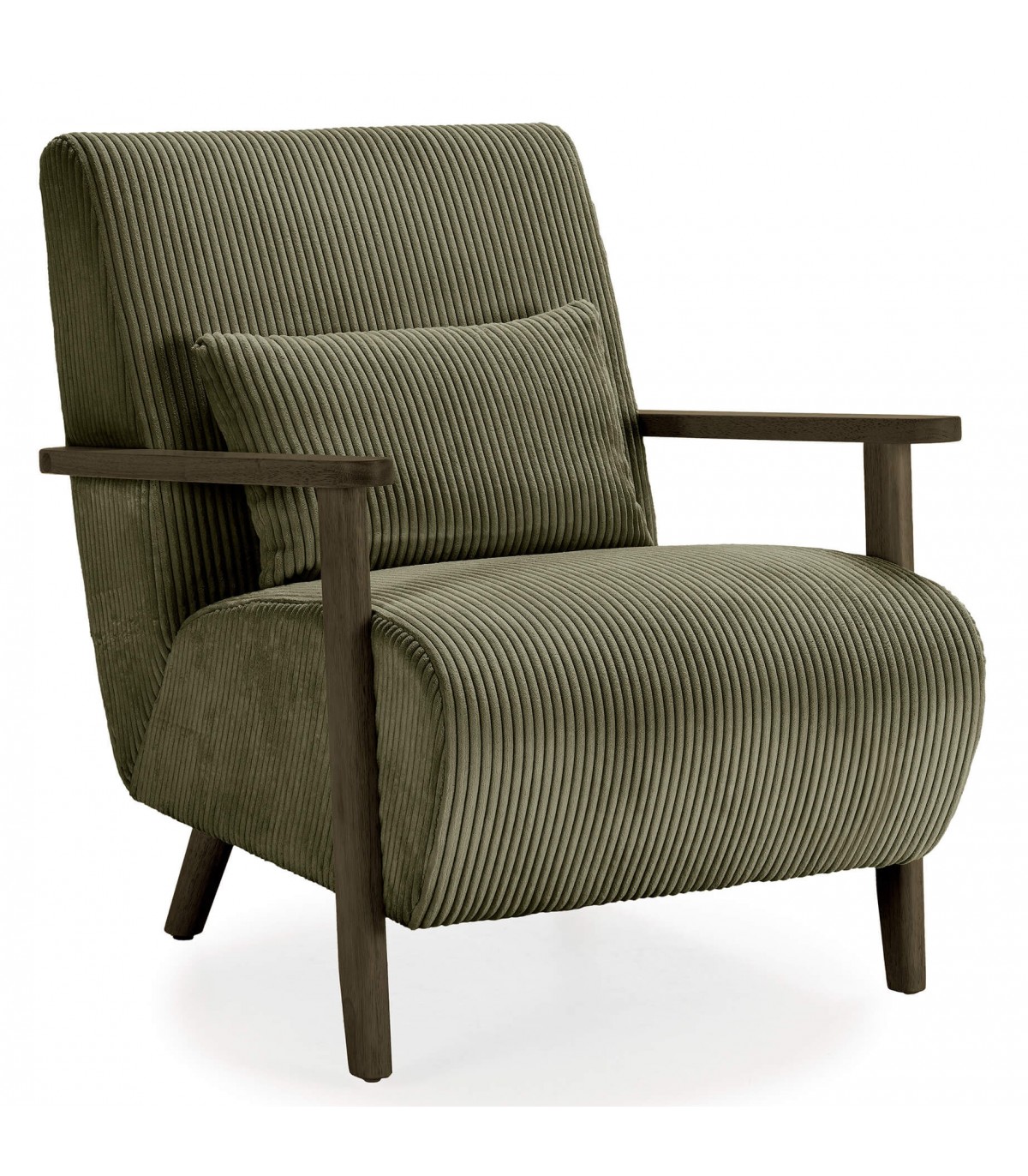 Disfruta del máximo confort con esta butaca cómoda y original, tapizada en pana gruesa color verde que aporta suavidad y elegancia. Incluye un cojín lumbar decorativo y práctico, ideal para mantener una postura cómoda durante tus momentos de relajación. Los brazos y patas en madera color nogal verdoso complementan su diseño único, creando un contraste sofisticado y natural. Perfecta para salones contemporáneos o rincones de lectura con estilo.