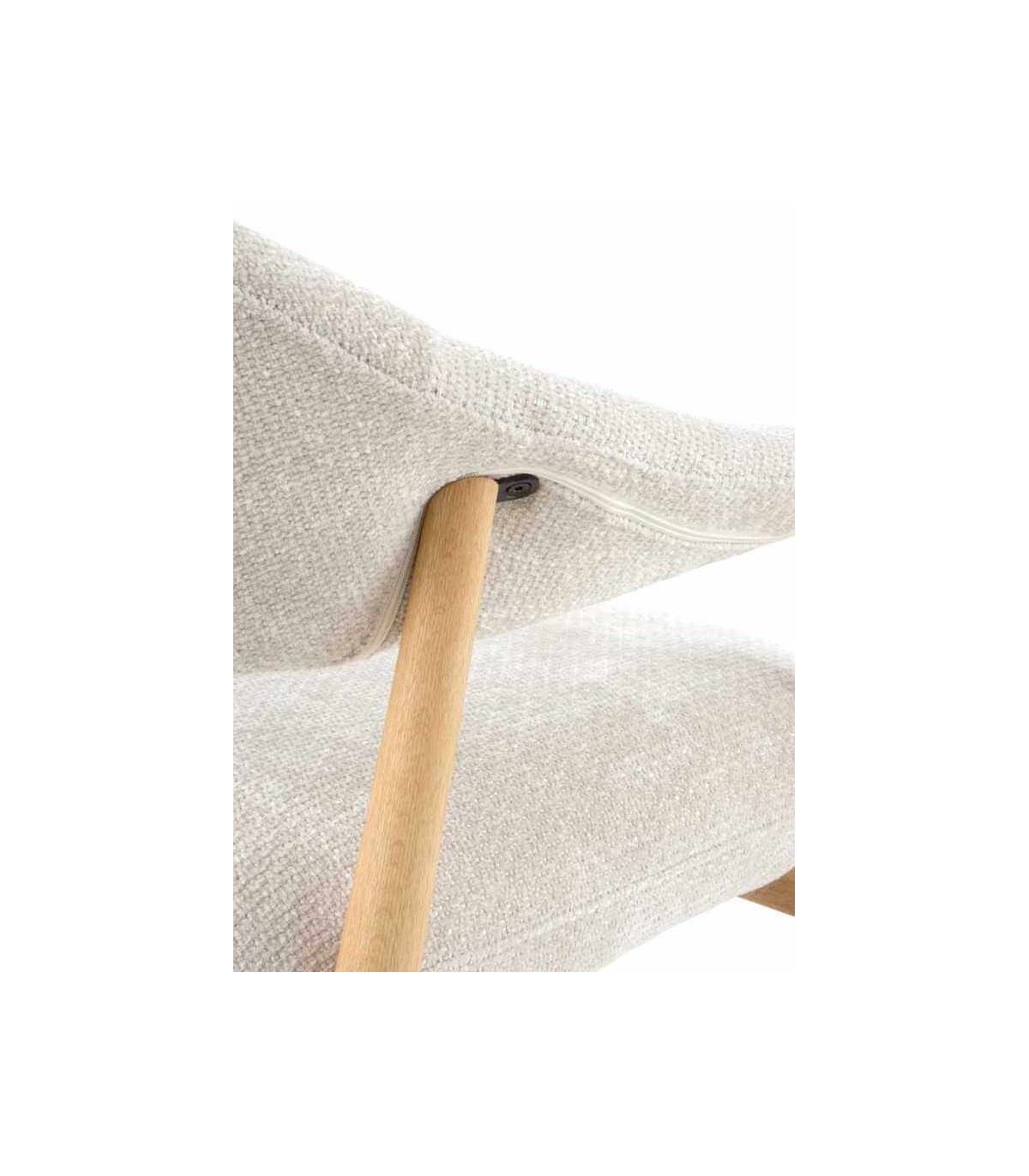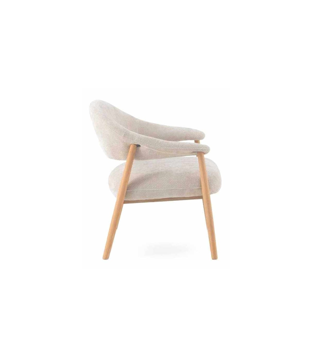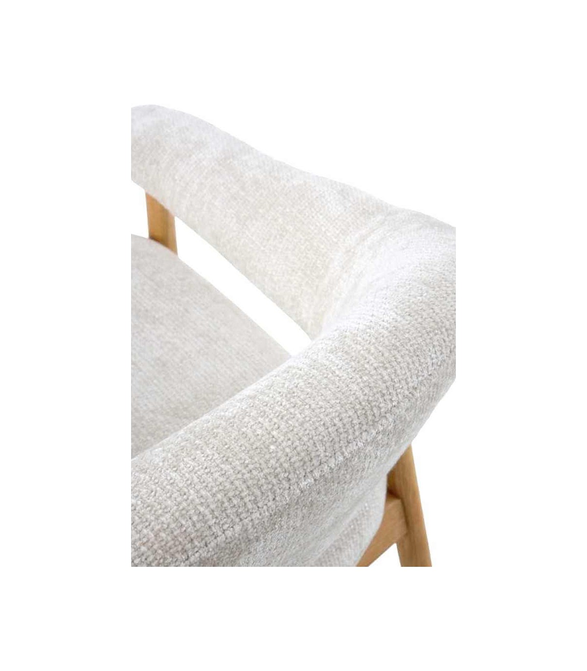 Su tapizado en chenilla blanca añade una suavidad agradable que envuelve el asiento con una sensación cálida y envolvente, acompañando momentos de lectura, conversación o descanso. La curva del respaldo abraza la postura con delicadeza y crea una presencia ligera que se integra con facilidad en ambientes minimalistas o de inspiración escandinava. Su diseño equilibrado permite que aporte textura.