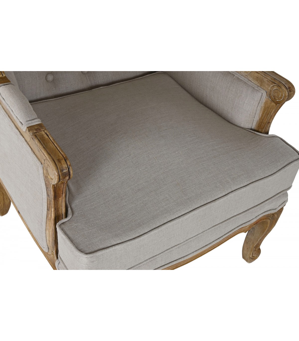 🎨 Acabado: Madera de mango tallada natural tapizada en lino color topo con el respaldo en capitoné y rematada con doble vivo.