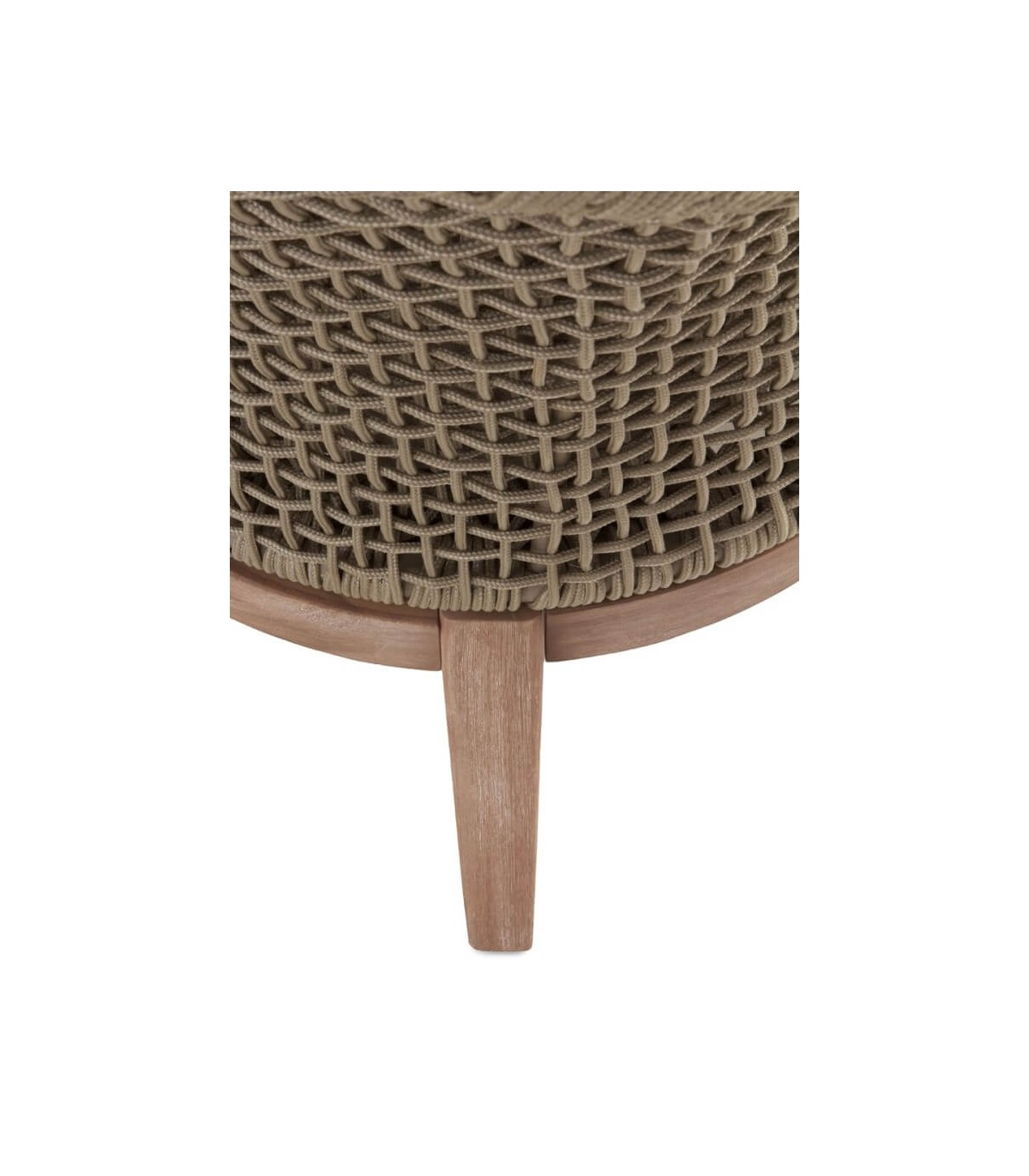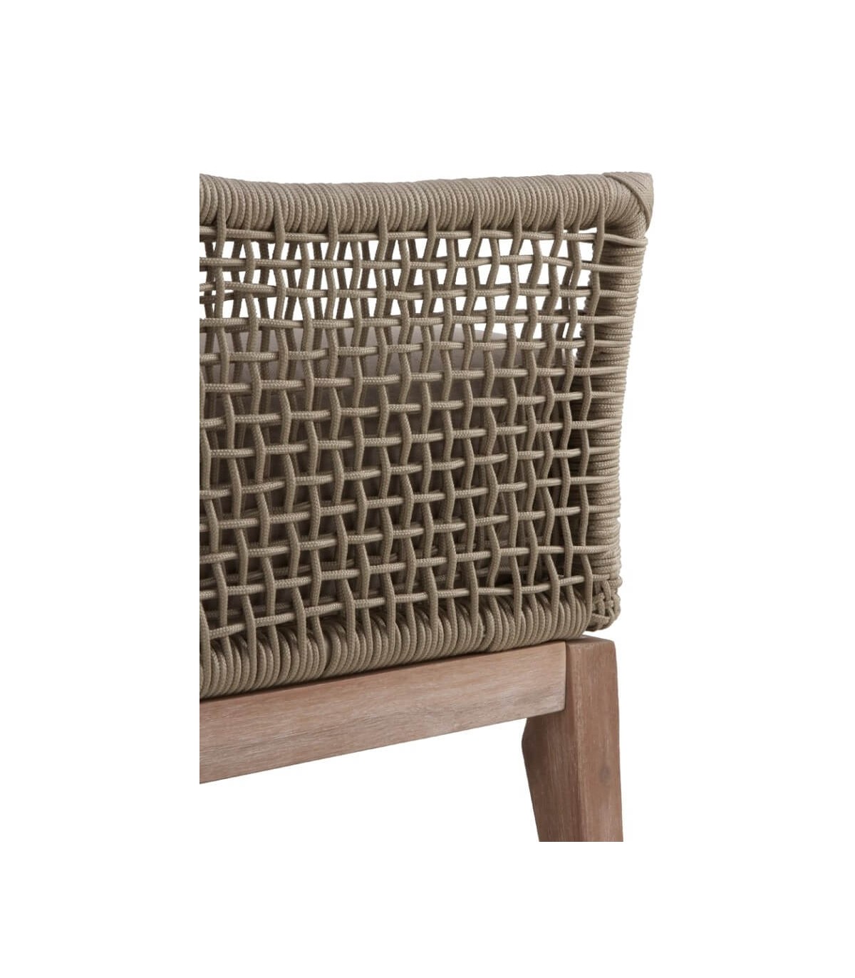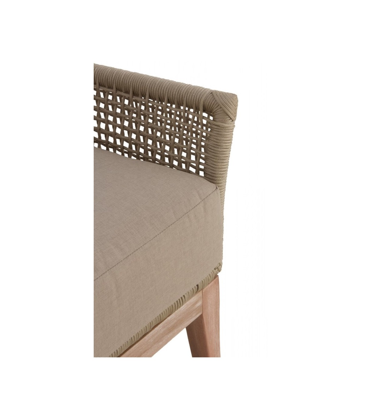 Sillón realizado en madera acacia patinada con una estructura en aluminio recubierta de cuerda color topo, con los cojines de asiento desenfundables tapizados a juego, una sofá resistente y cómodo que encaja bien en ambientes coloniales. Perfecta para hogar o para hostelería.