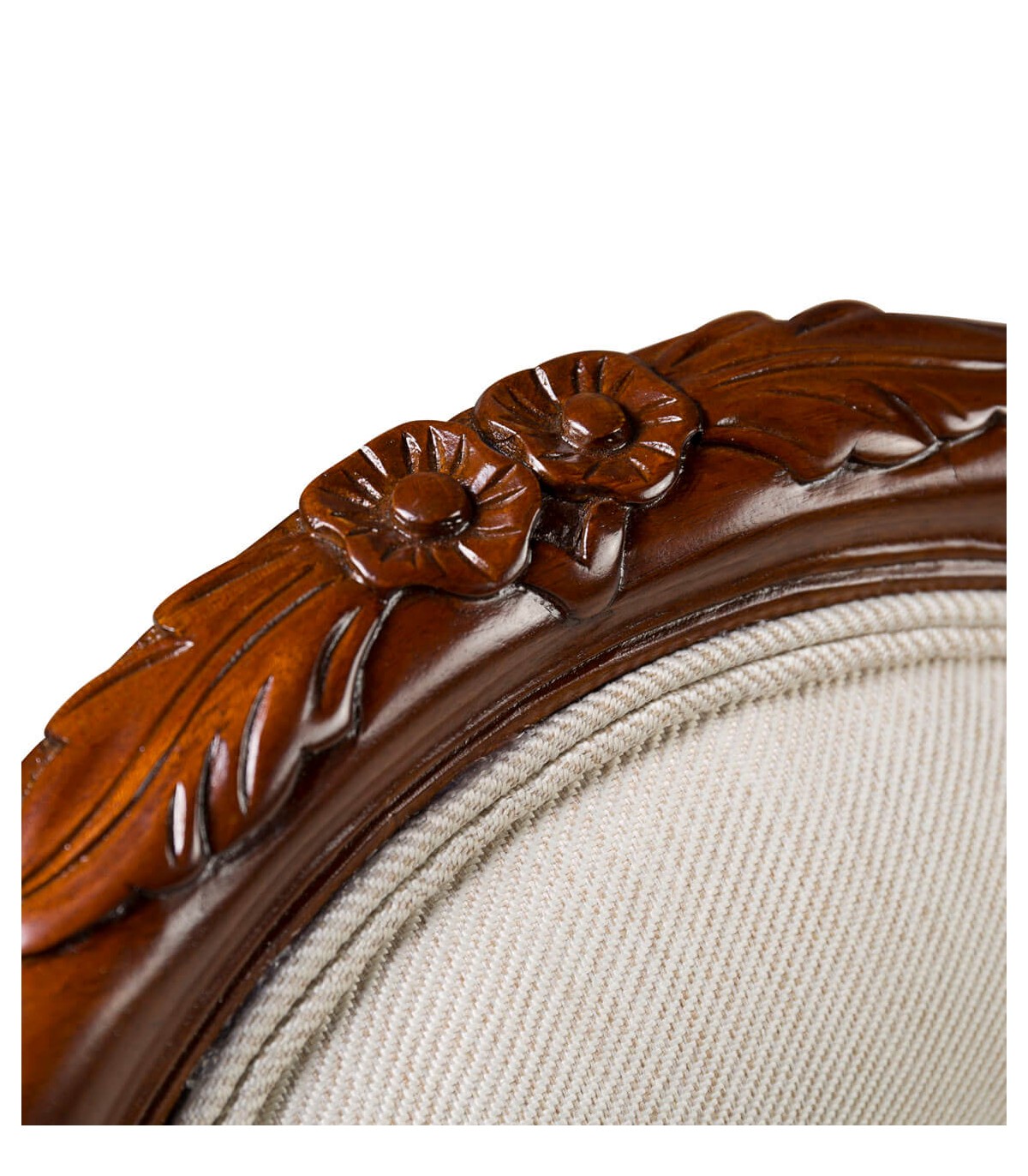 Acabado, madera de caoba tallada a mano natural, tela espiga blanco roto.