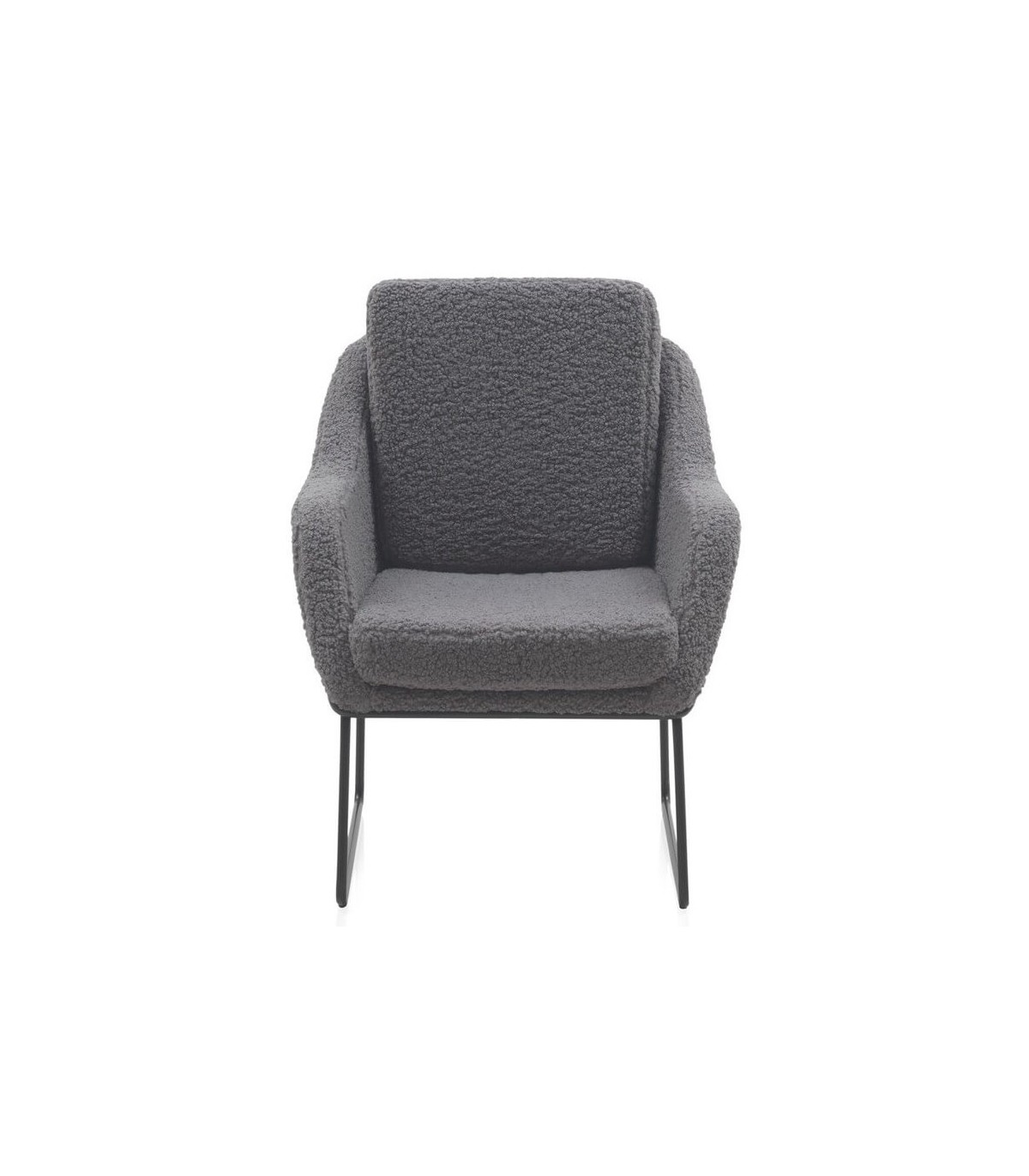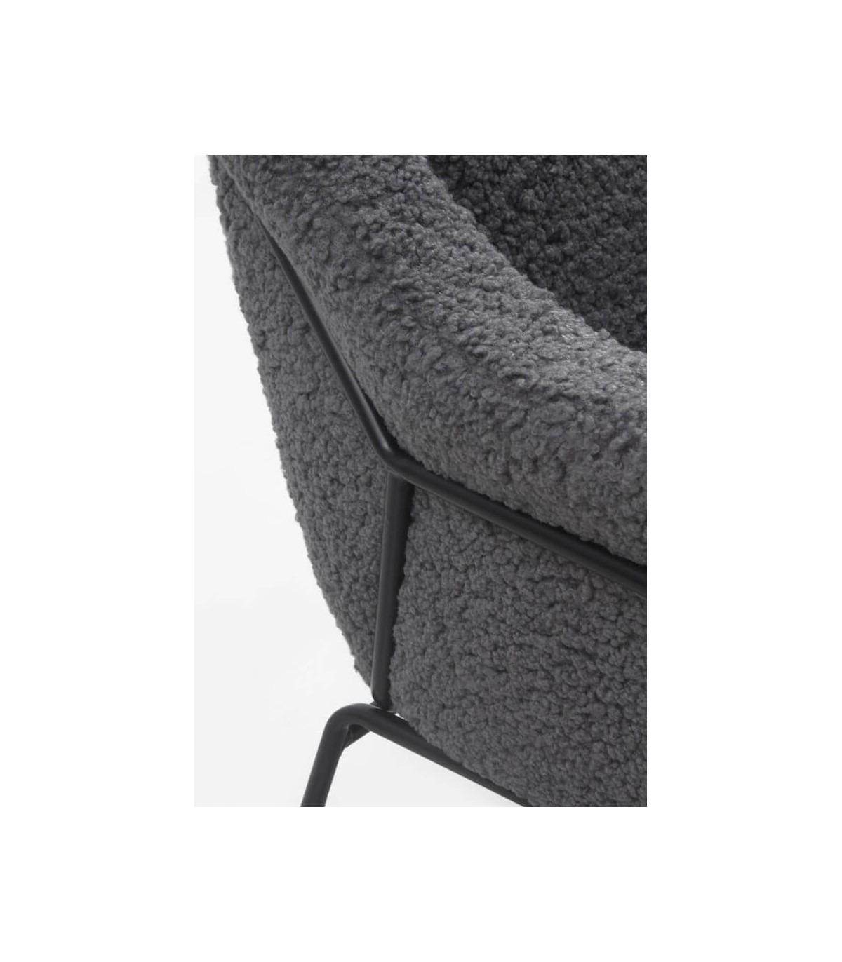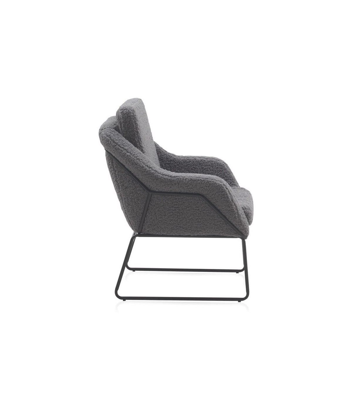 Sillón tapizado en tela bouclé color gris y la estructura metálica color negro, un sillón confortable perfecto para cierre de una zona de estar o un dormitorio.