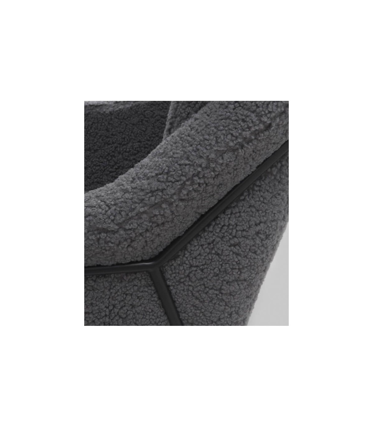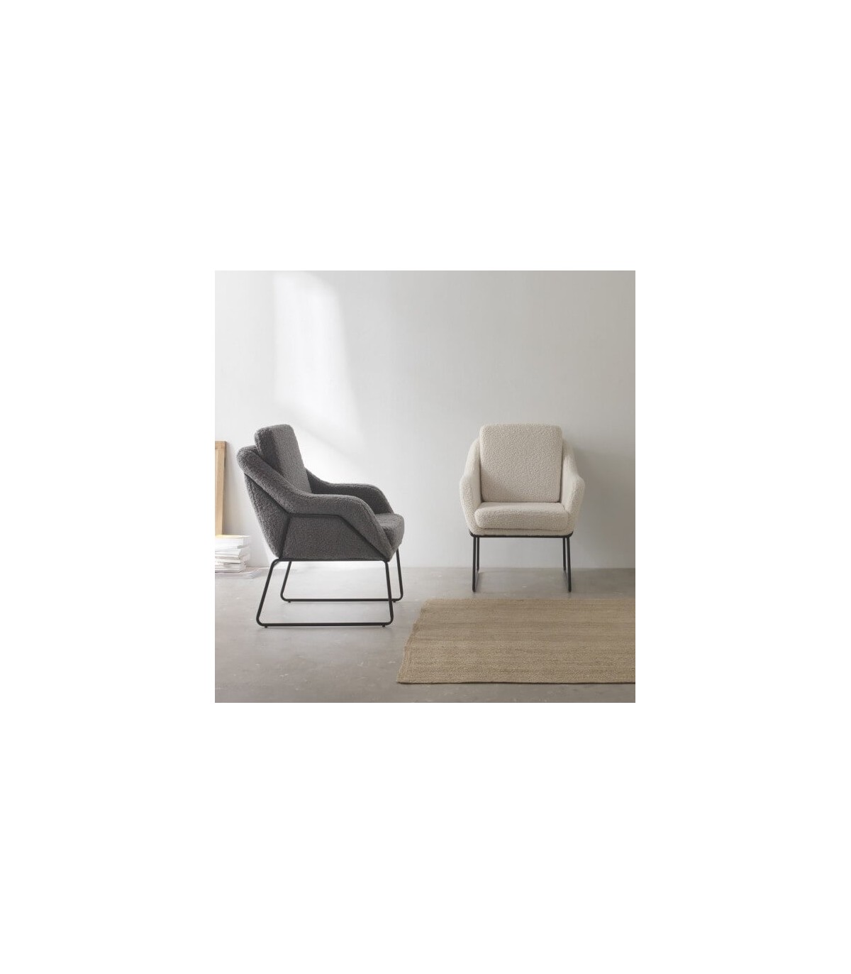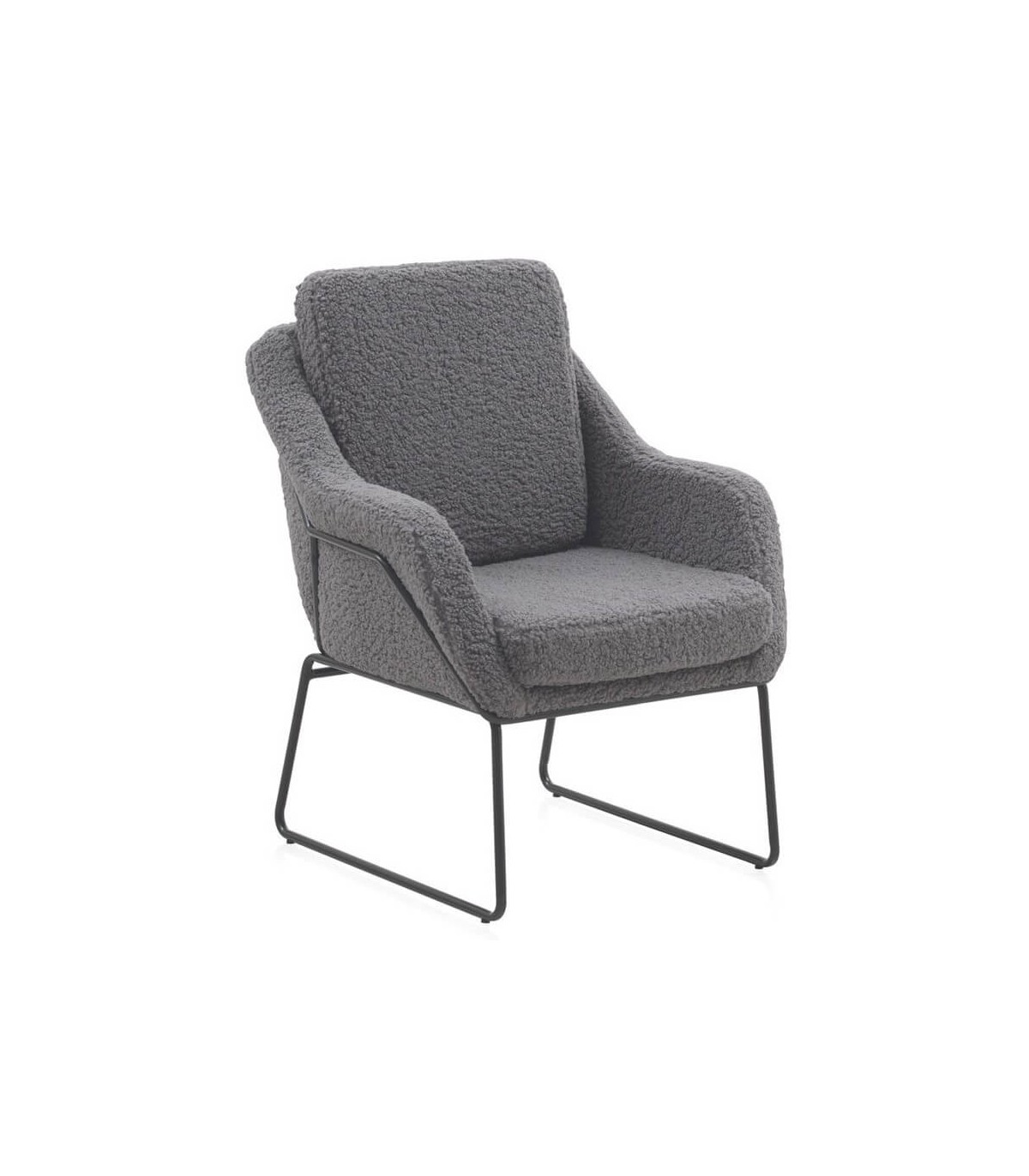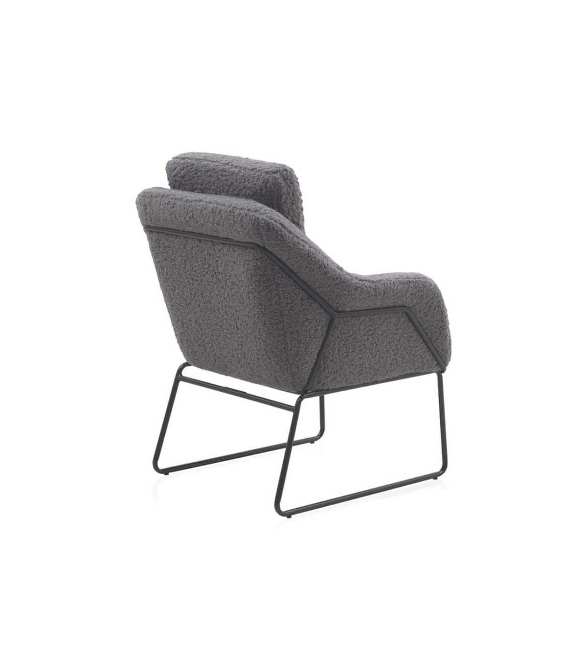 Sillón tapizado en tela bouclé color gris y la estructura metálica color negro, un sillón confortable perfecto para cierre de una zona de estar o un dormitorio.