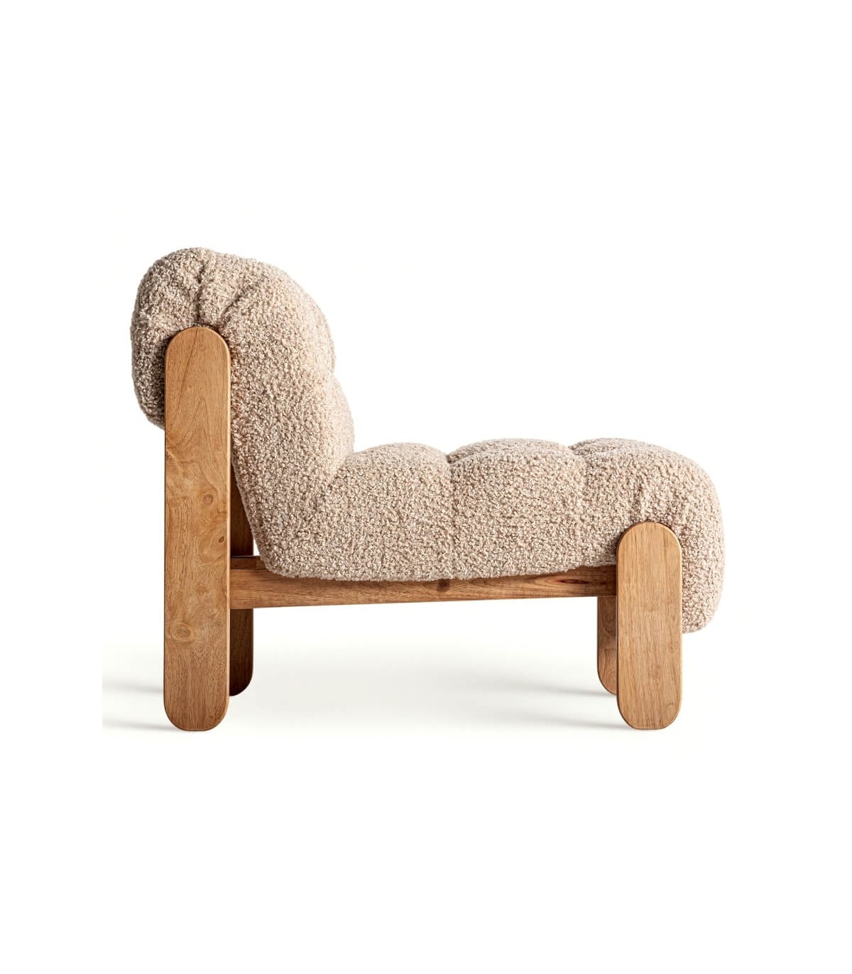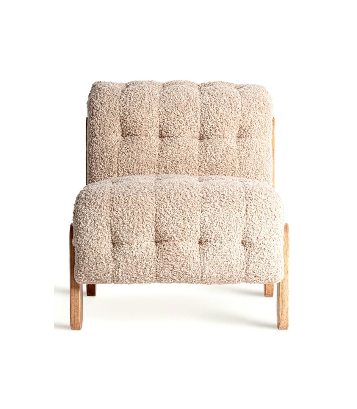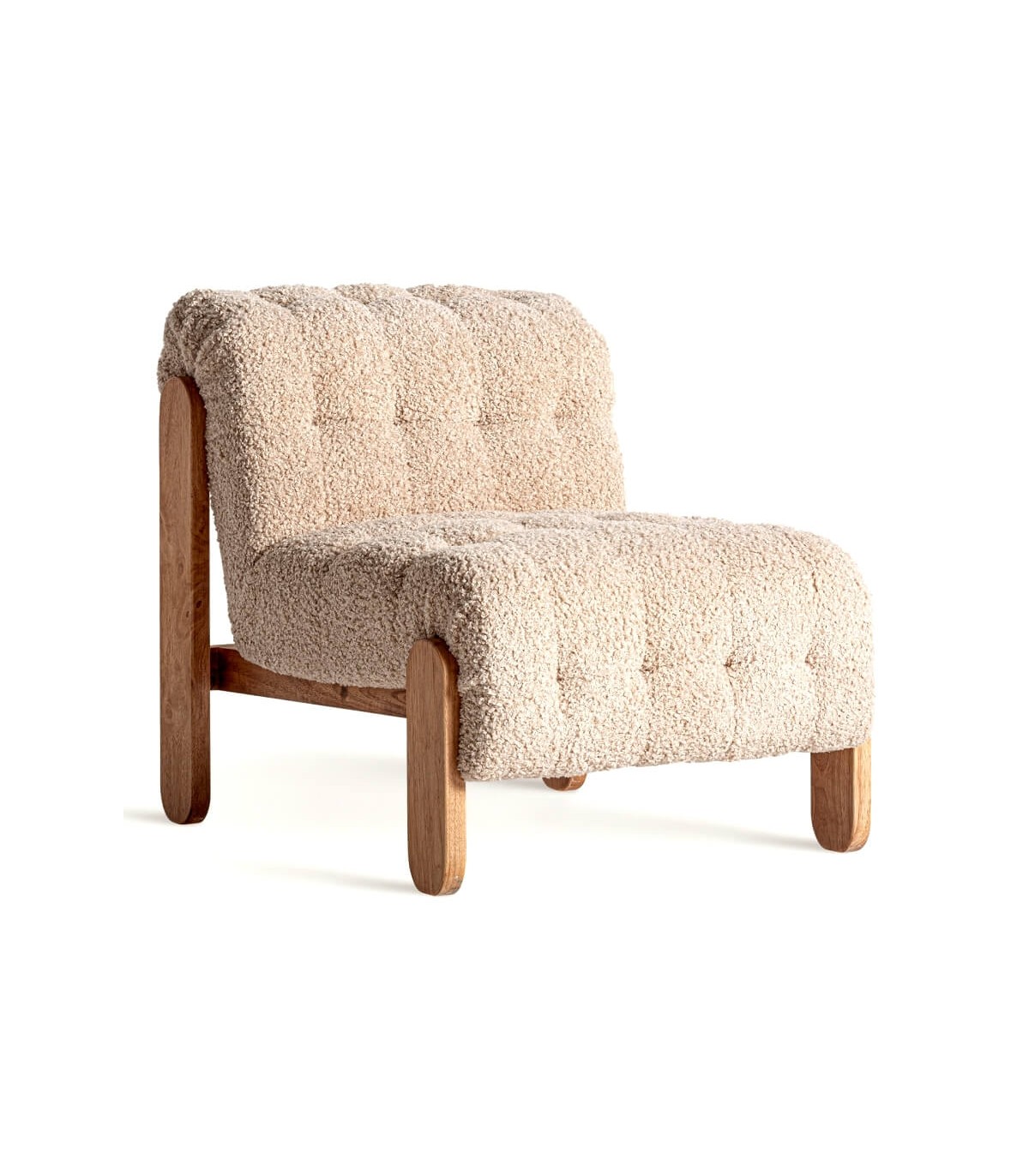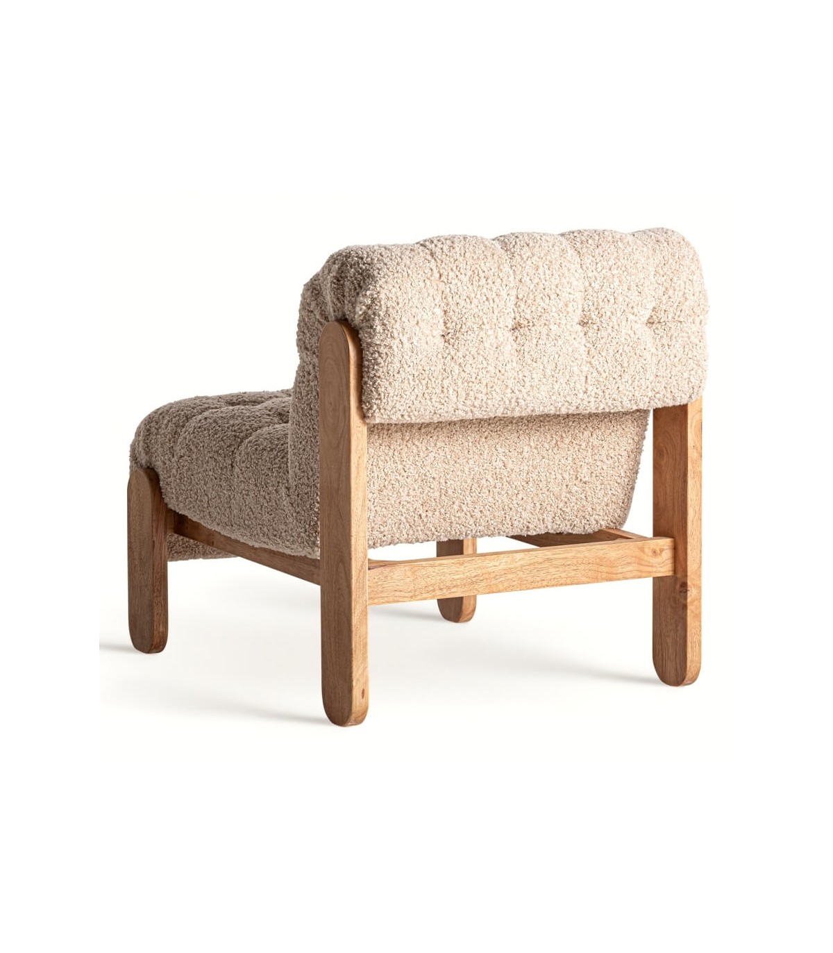 Sillón cómodo de estilo alpino tapizado en boucle de color beige, con la base en madera de pino acabado natural, perfecto para el cierre de una zona de conversación o un dormitorio.