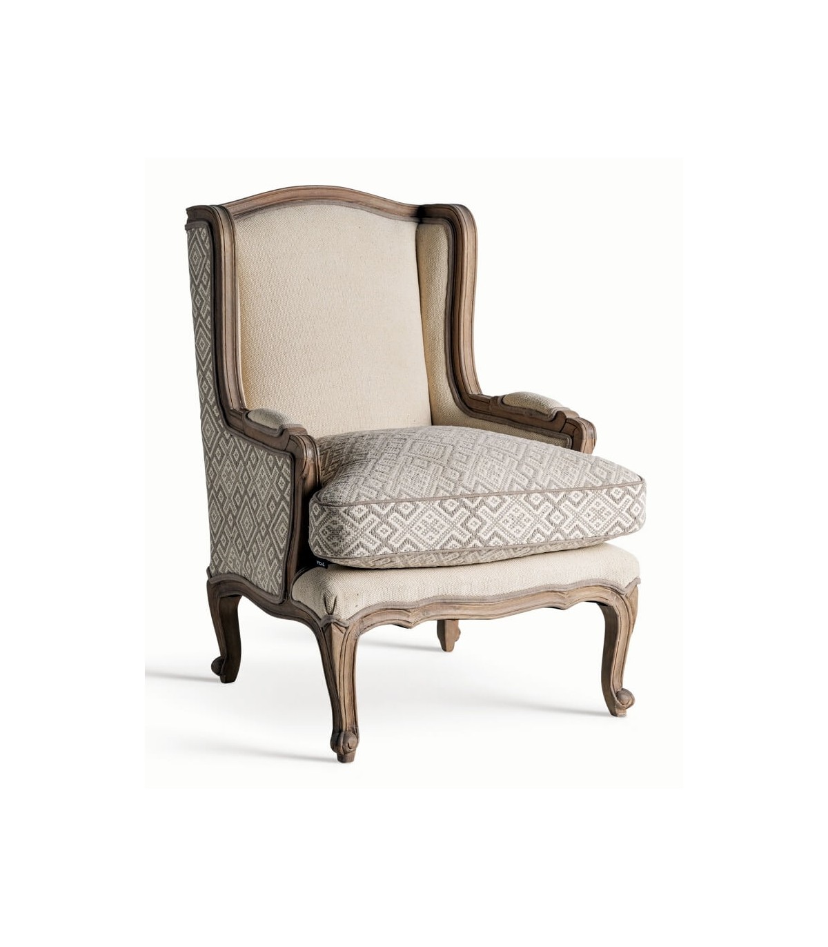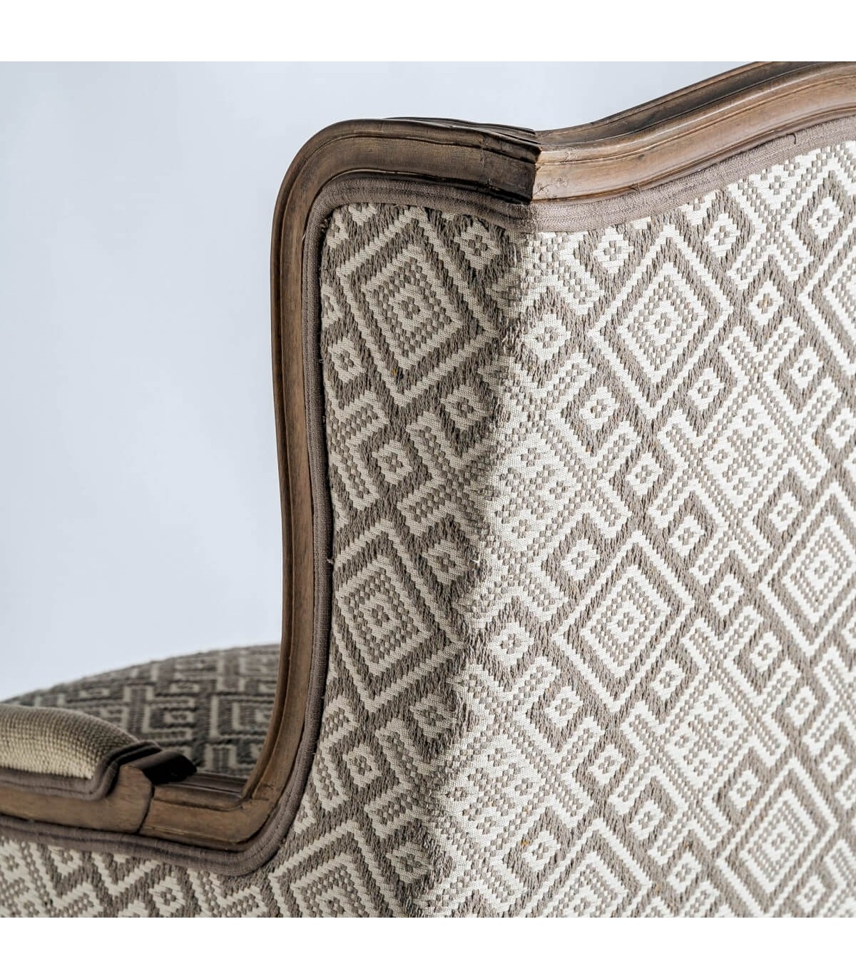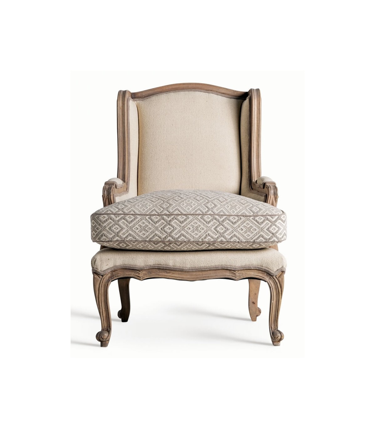 Las formas envolventes del respaldo y los apoyabrazos realzan su estilo francés, mientras que el patrón textil geométrico añade un toque decorativo sutil. Perfecto para ambientes clásicos, románticos o provenzales donde predominen las maderas vistas y los tejidos suaves.