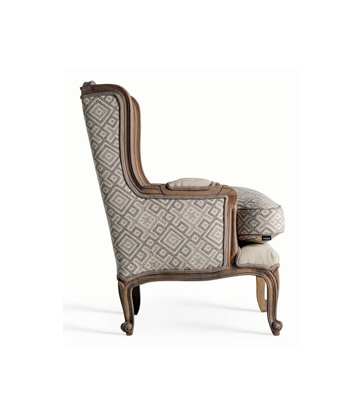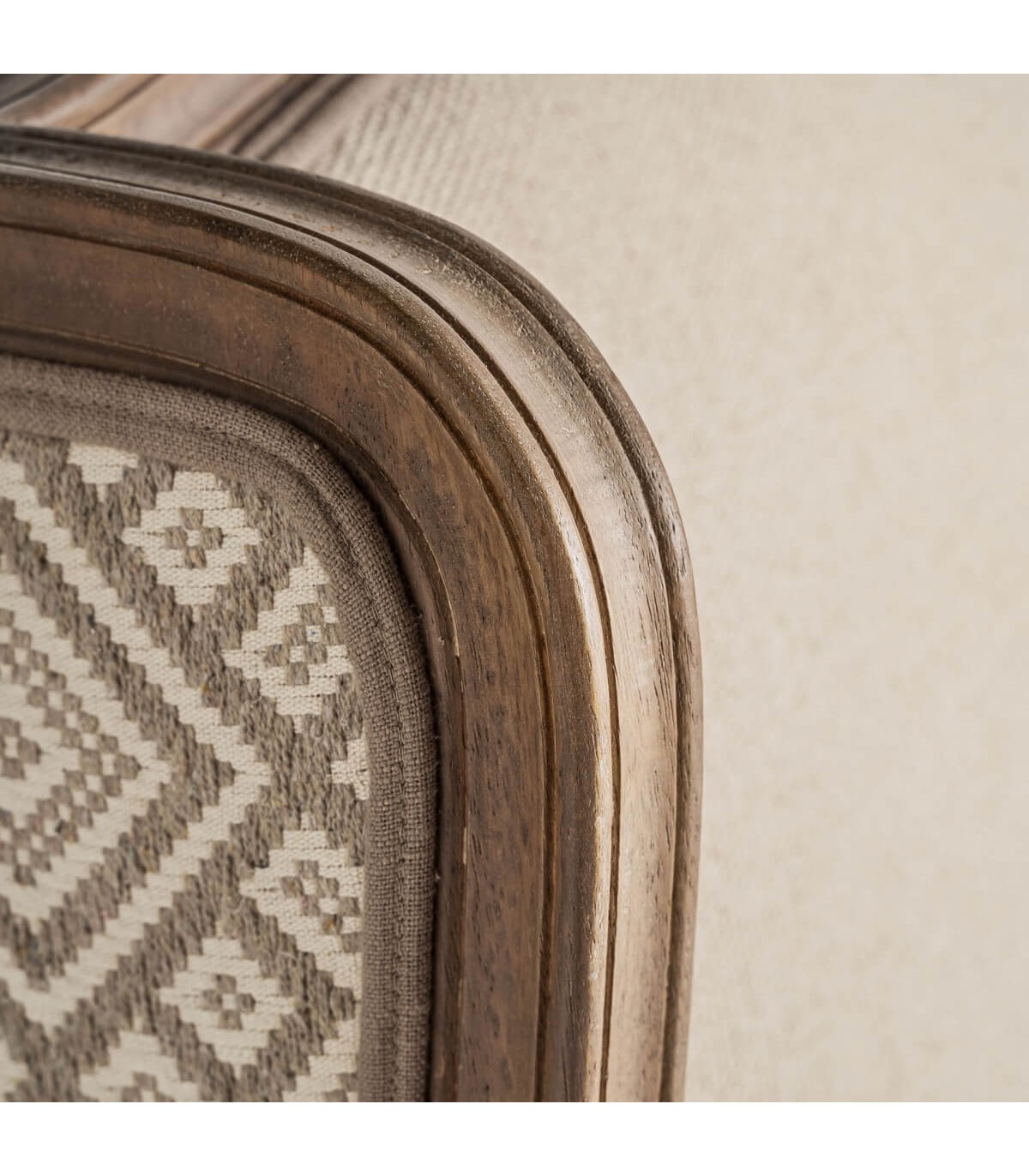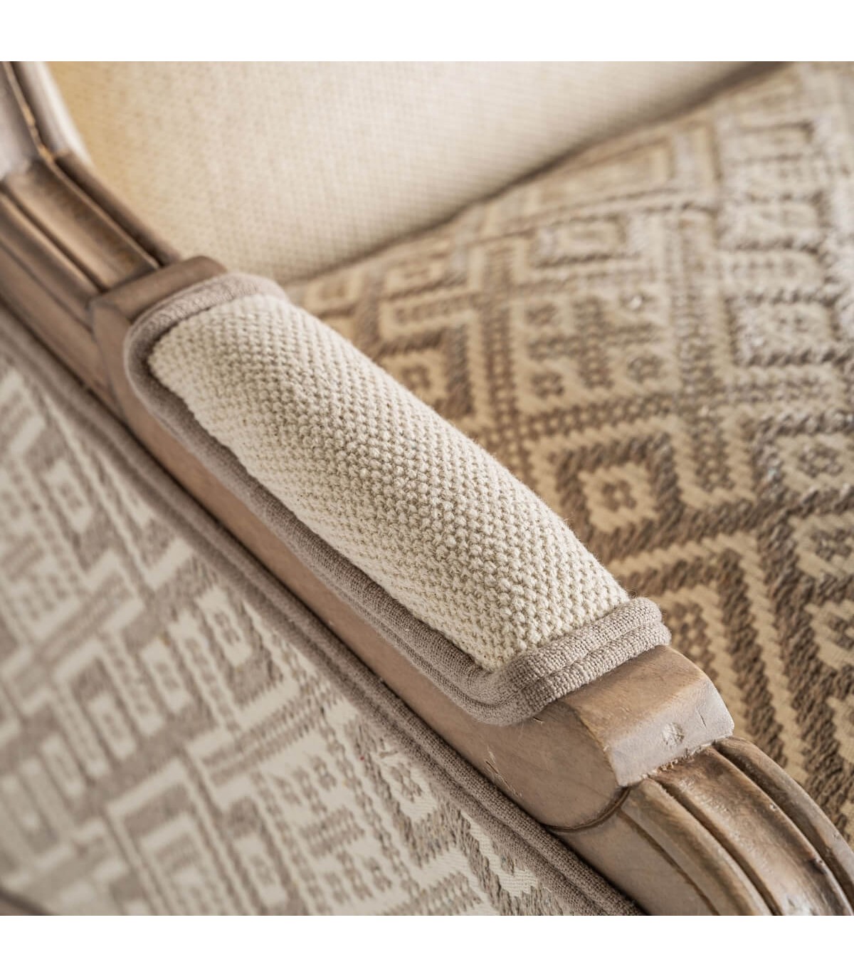 Las formas envolventes del respaldo y los apoyabrazos realzan su estilo francés, mientras que el patrón textil geométrico añade un toque decorativo sutil. Perfecto para ambientes clásicos, románticos o provenzales donde predominen las maderas vistas y los tejidos suaves.
