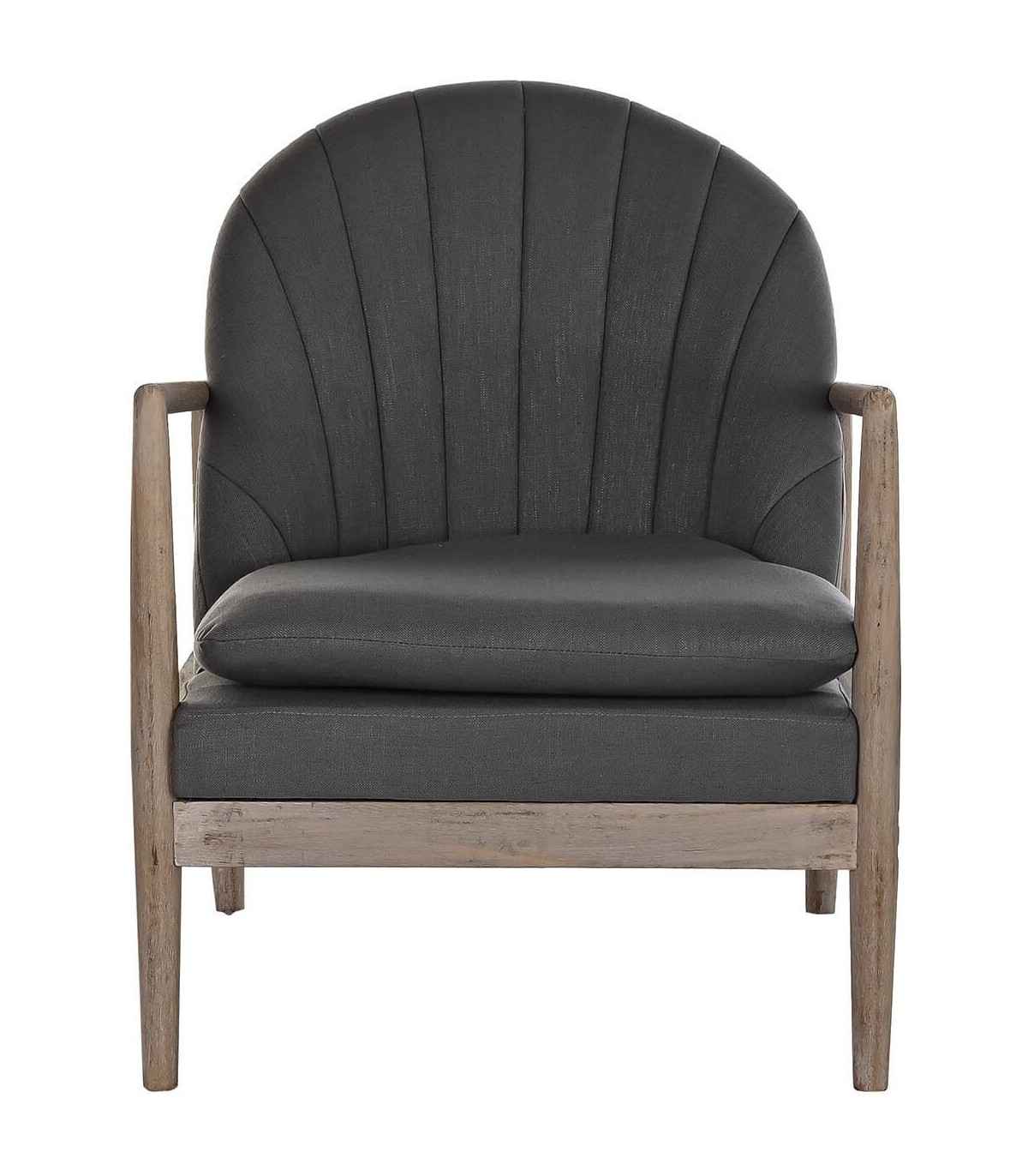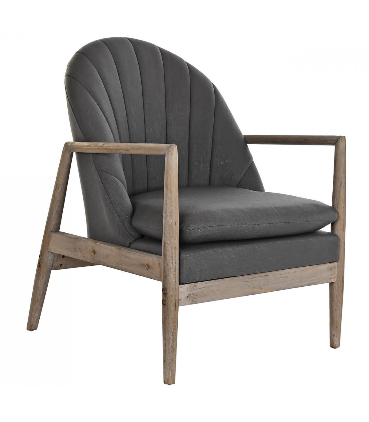 Sillón de estilo nórdico, realizado en madera tallada artesanalmente acabado natural tapizado en tela color gris oscuro, perfecto para el cierre de una zona de sofás, una zona de lectura o de apoyo en un dormitorio, un sillón muy cómodo que nunca pasará de moda, todo un clásico.