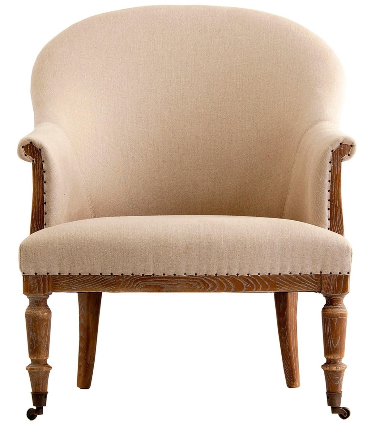 Acabado, madera natural, patas con ruedas, tela algodón crudo.