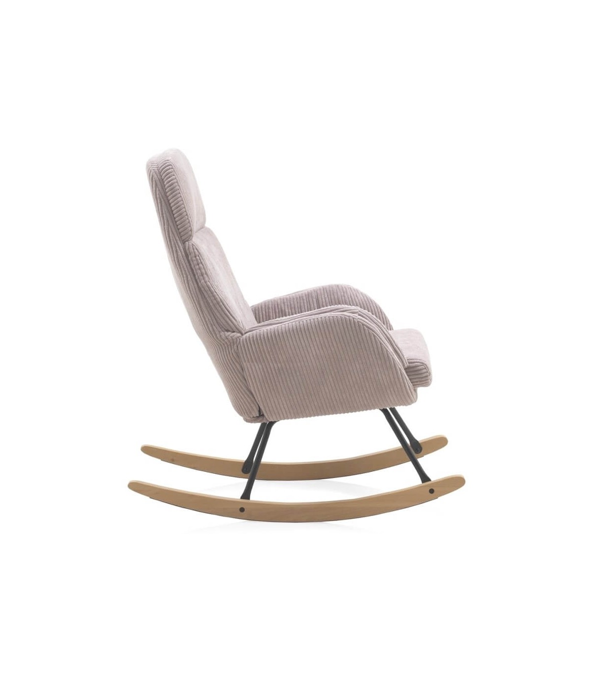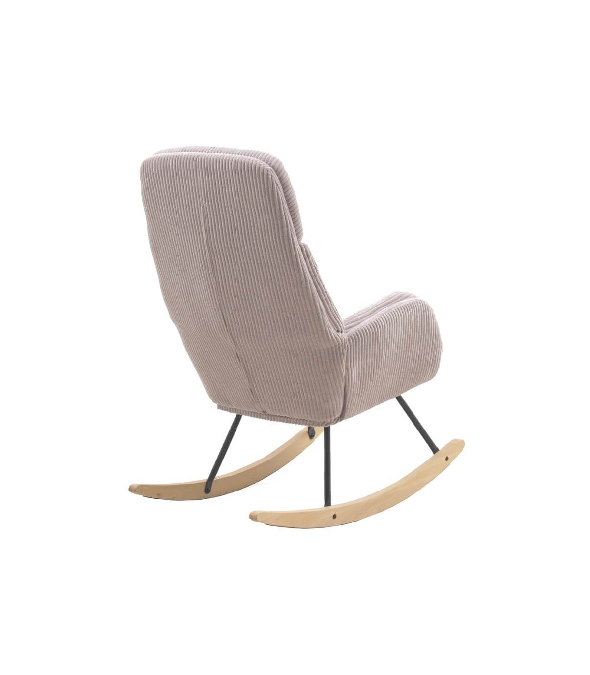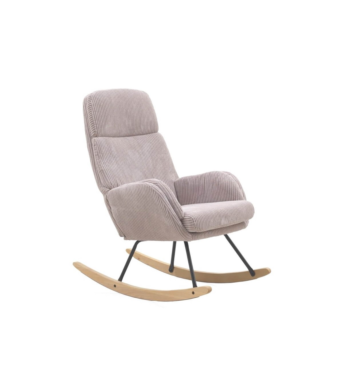 Mecedora tapizada en pana color lavanda con estructura de acero en color negro y patín de madera acabado natural. Su respaldo es alto aportando una mayor comodidad, el cojín del asiento es desenfundable. Esta mecedora es ideal para momentos relax en cualquier estancia del hogar.