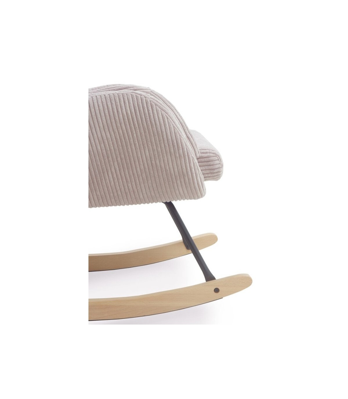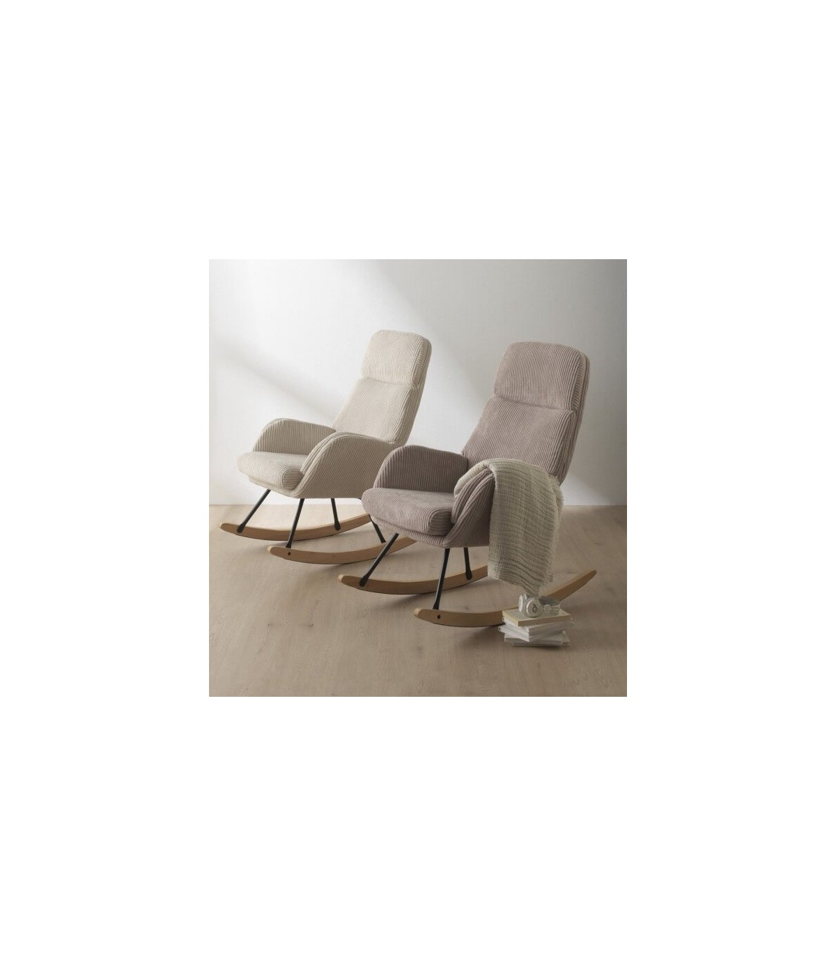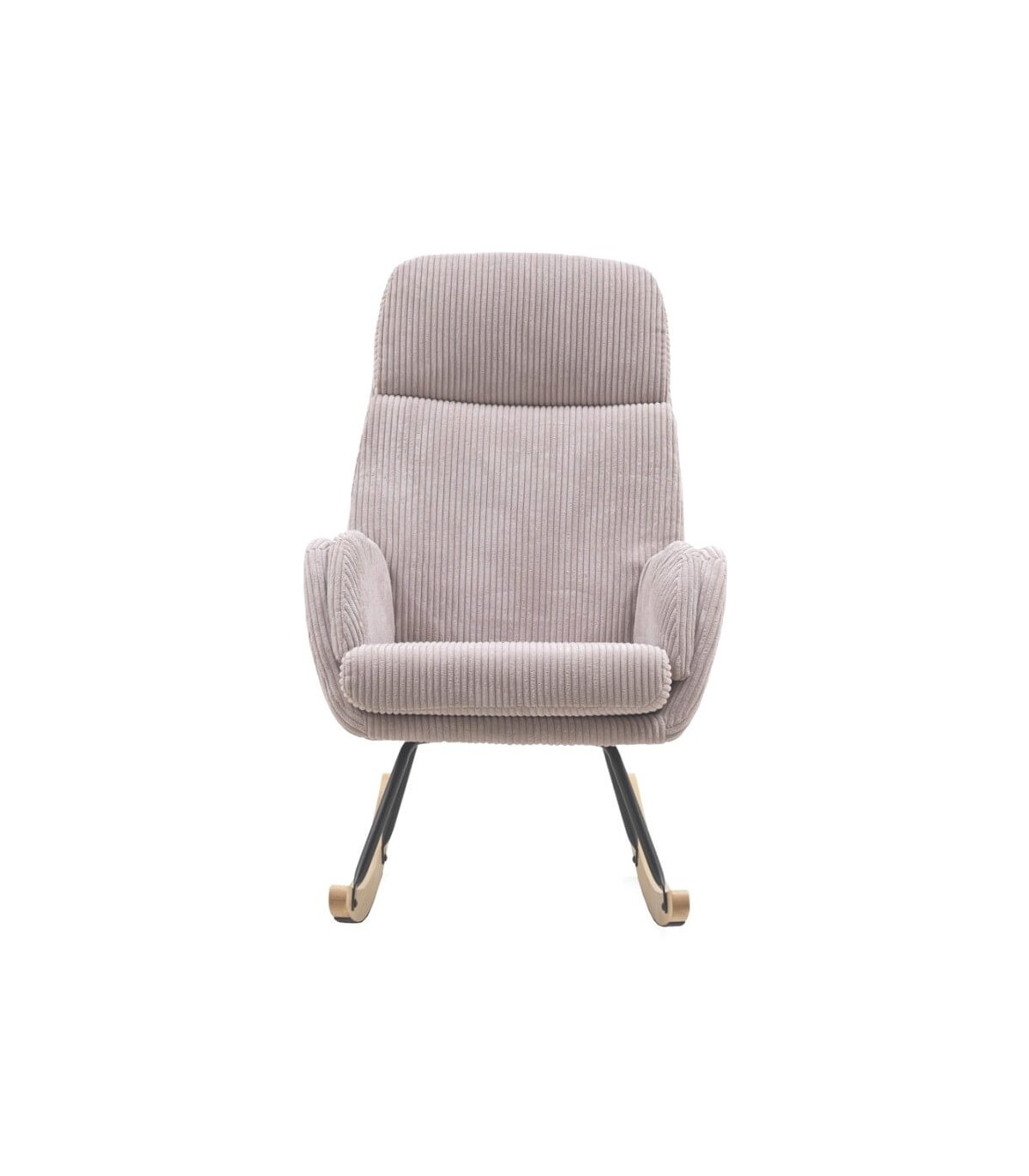 Mecedora tapizada en pana color lavanda con estructura de acero en color negro y patín de madera acabado natural. Su respaldo es alto aportando una mayor comodidad, el cojín del asiento es desenfundable. Esta mecedora es ideal para momentos relax en cualquier estancia del hogar.