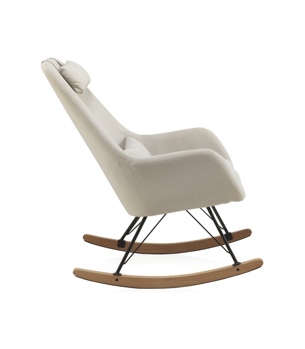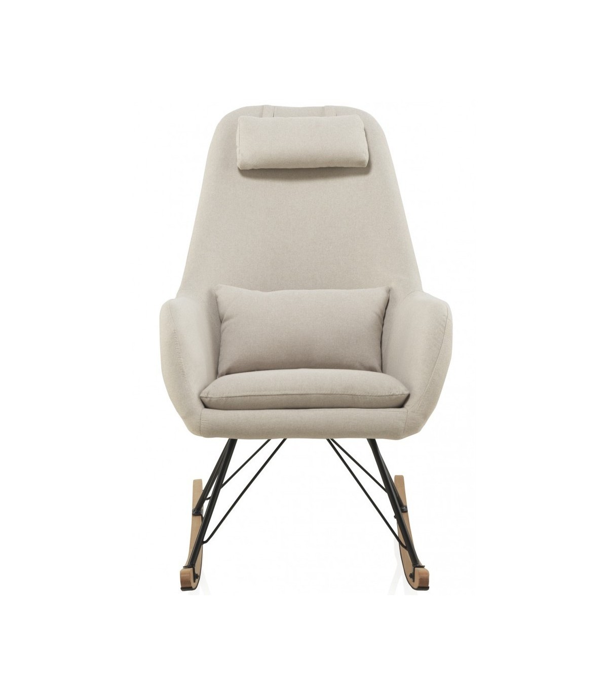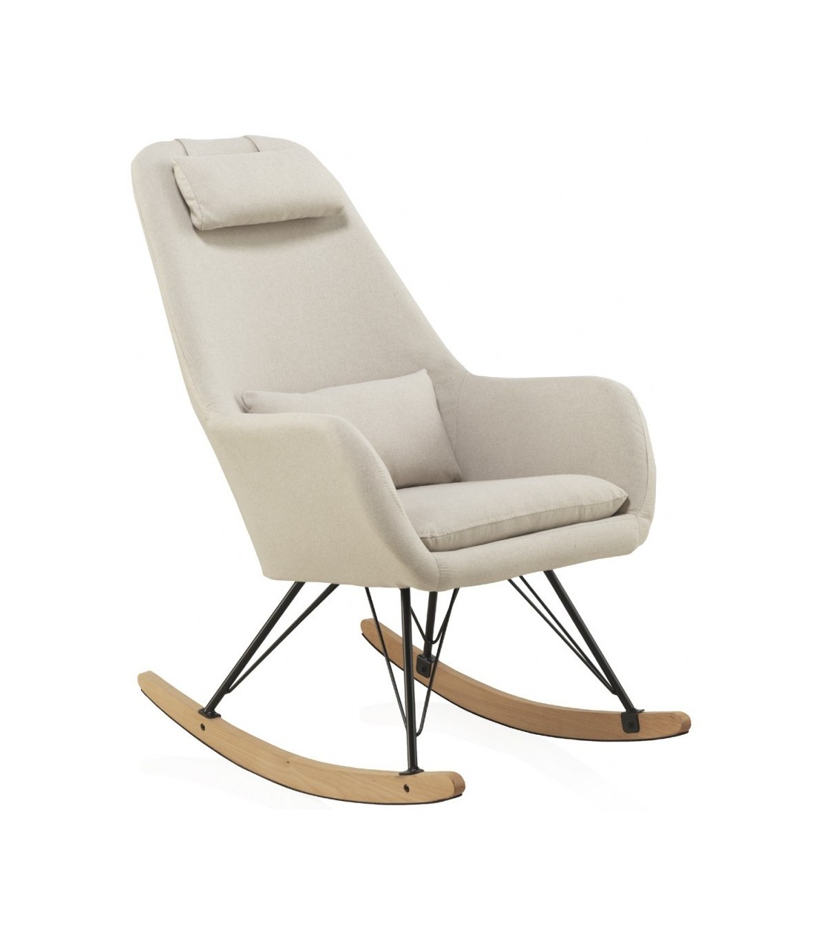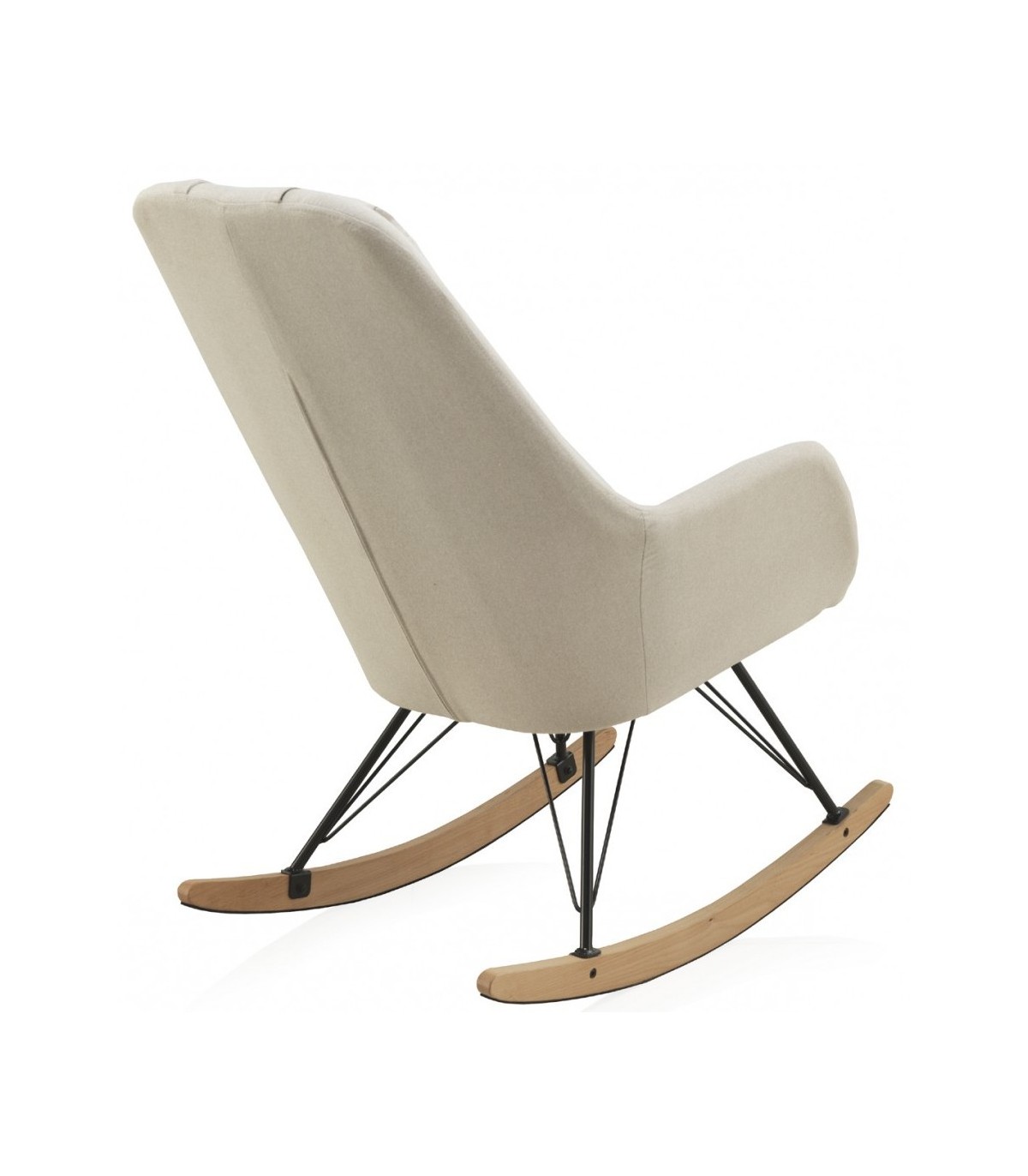 Mecedora tapizada en color beige con estructura de acero en color negro y patín de madera acabado natural.