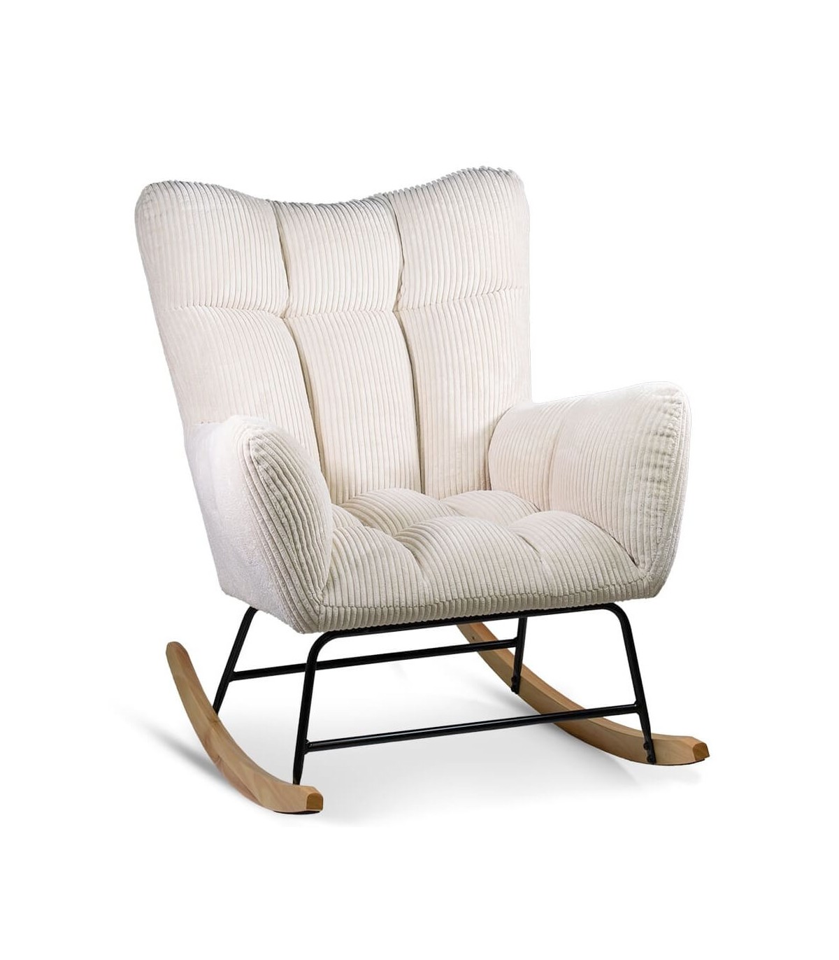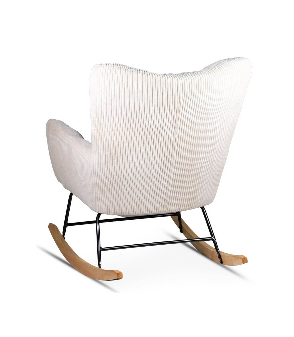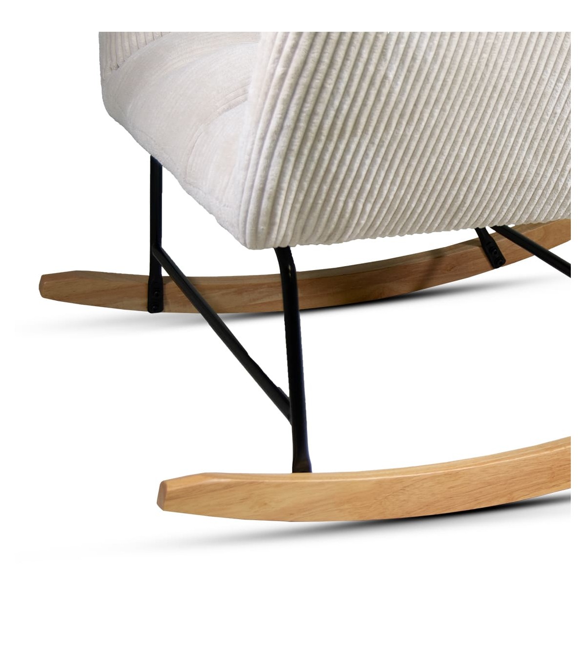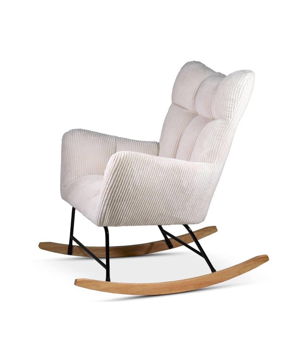 Mecedora muy cómoda tapizada en pana color beige con estructura de acero en color negro y patín de madera acabado natural. Su respaldo es alto aportando una mayor comodidad. Esta mecedora es ideal para momentos relax en cualquier estancia del hogar.